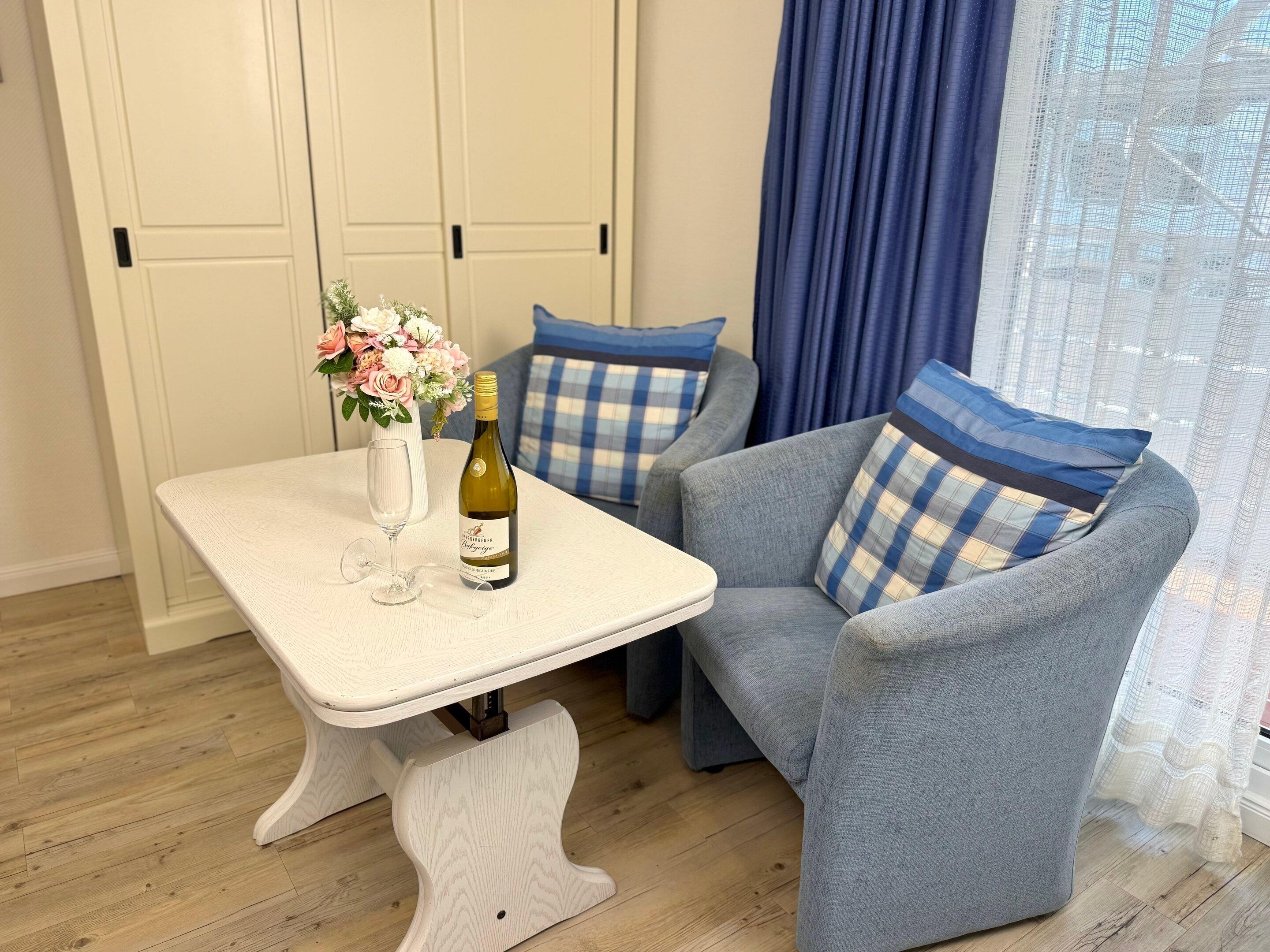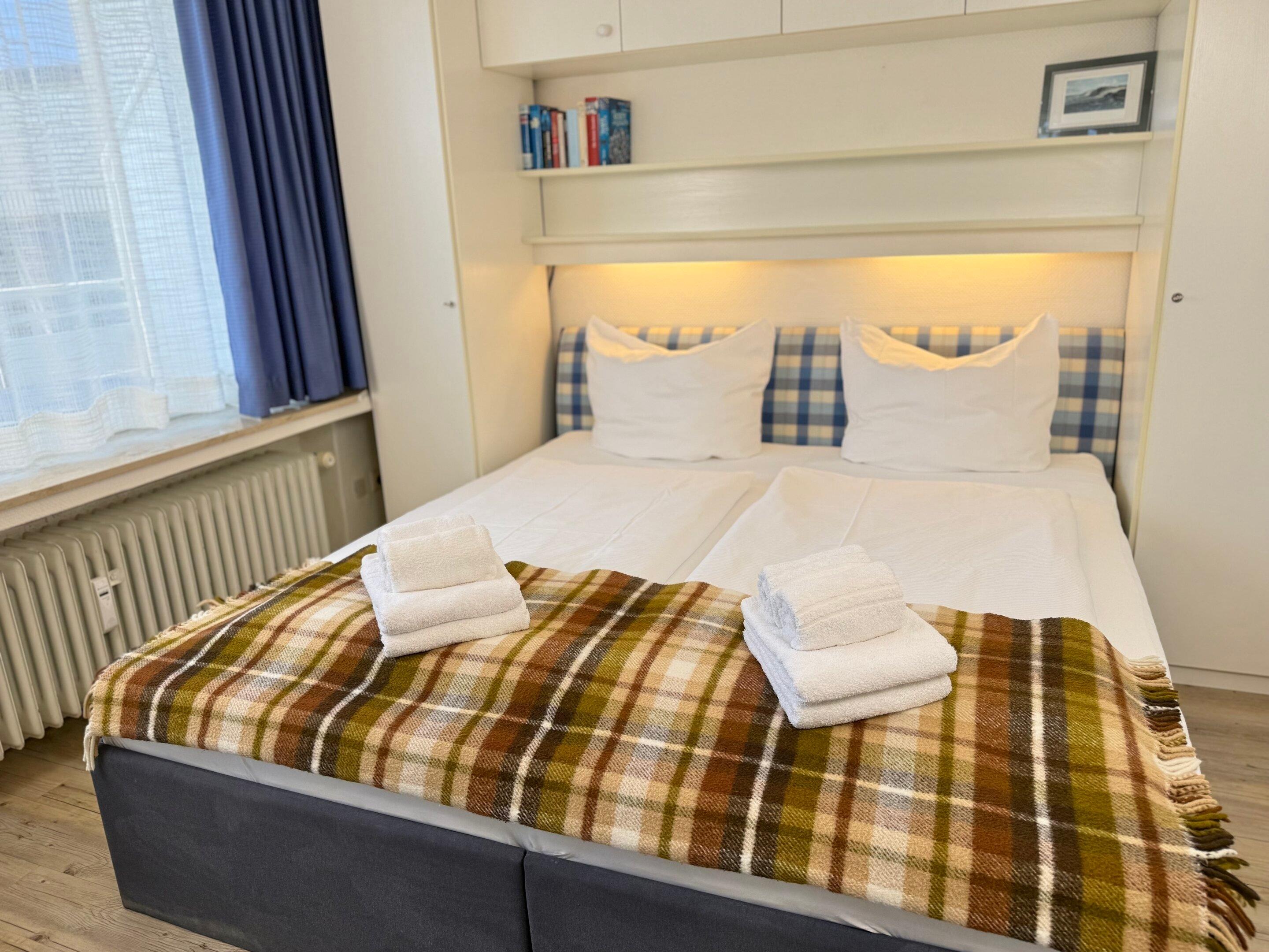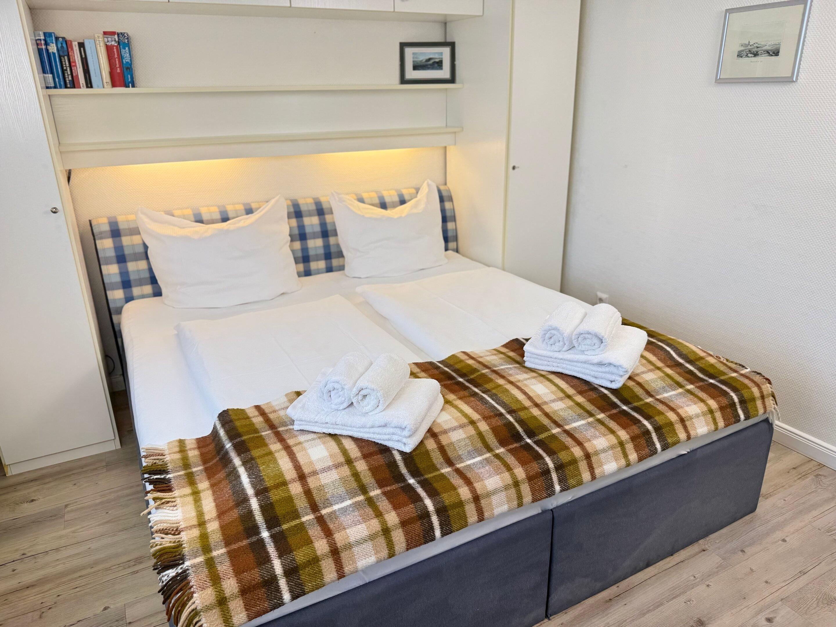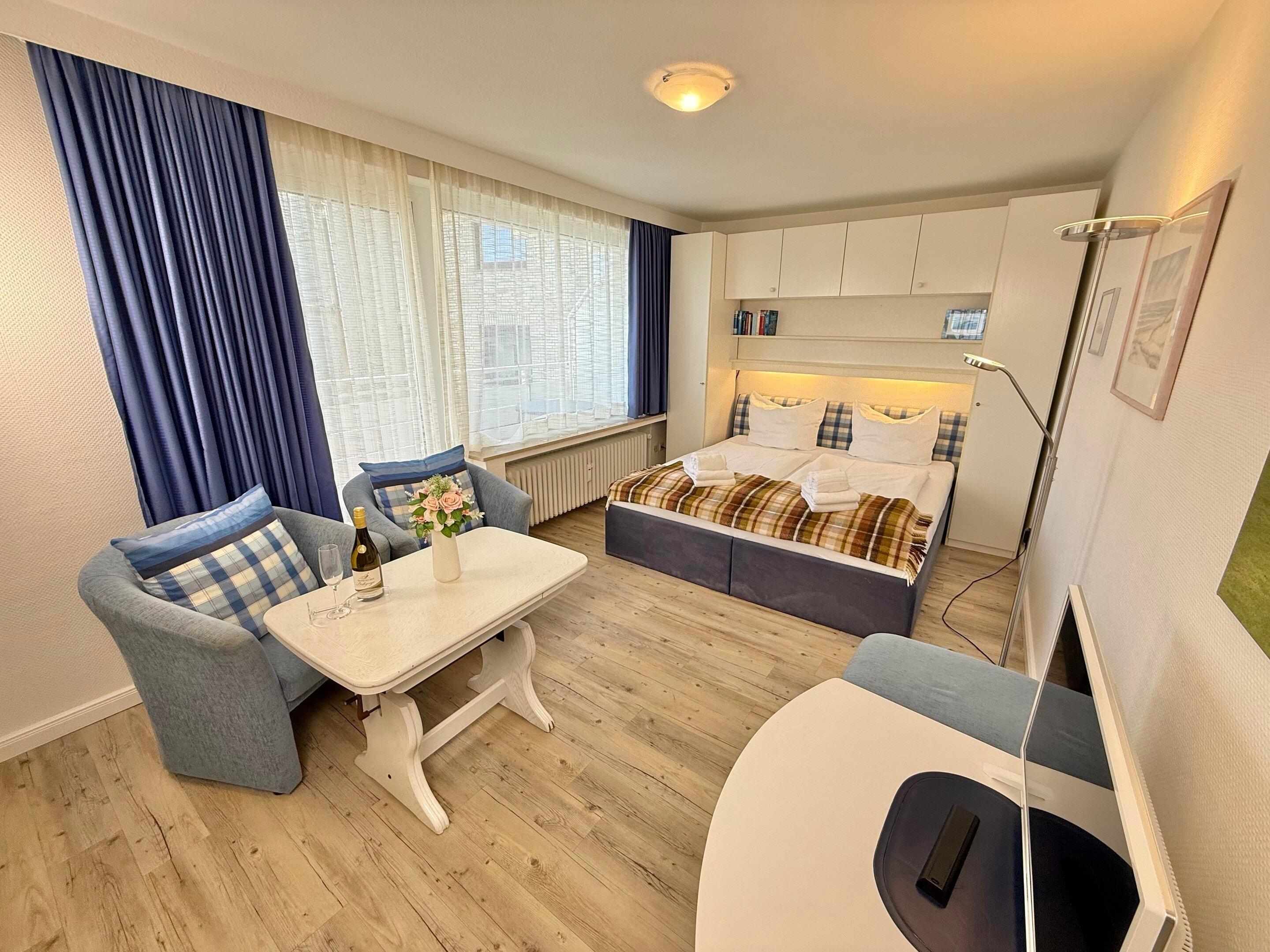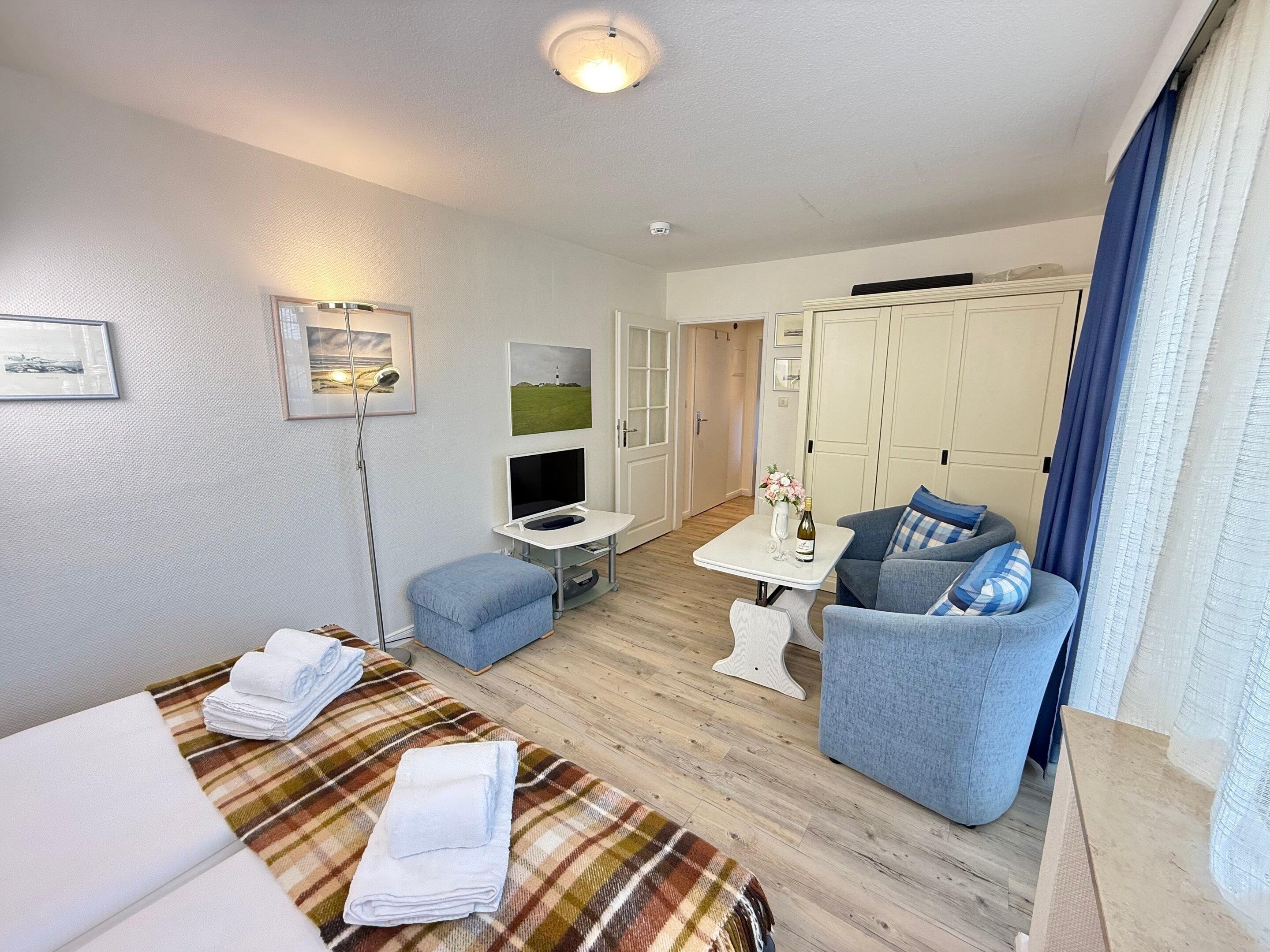 Der Wohn-/Schlafraum besteht aus einer Sitzecke mit zwei Sesseln und einem Fußhocker, einem feststehenden Doppelbett (Einzelmatratzen 0,90 x 2,00 m) und Kabel-TV.