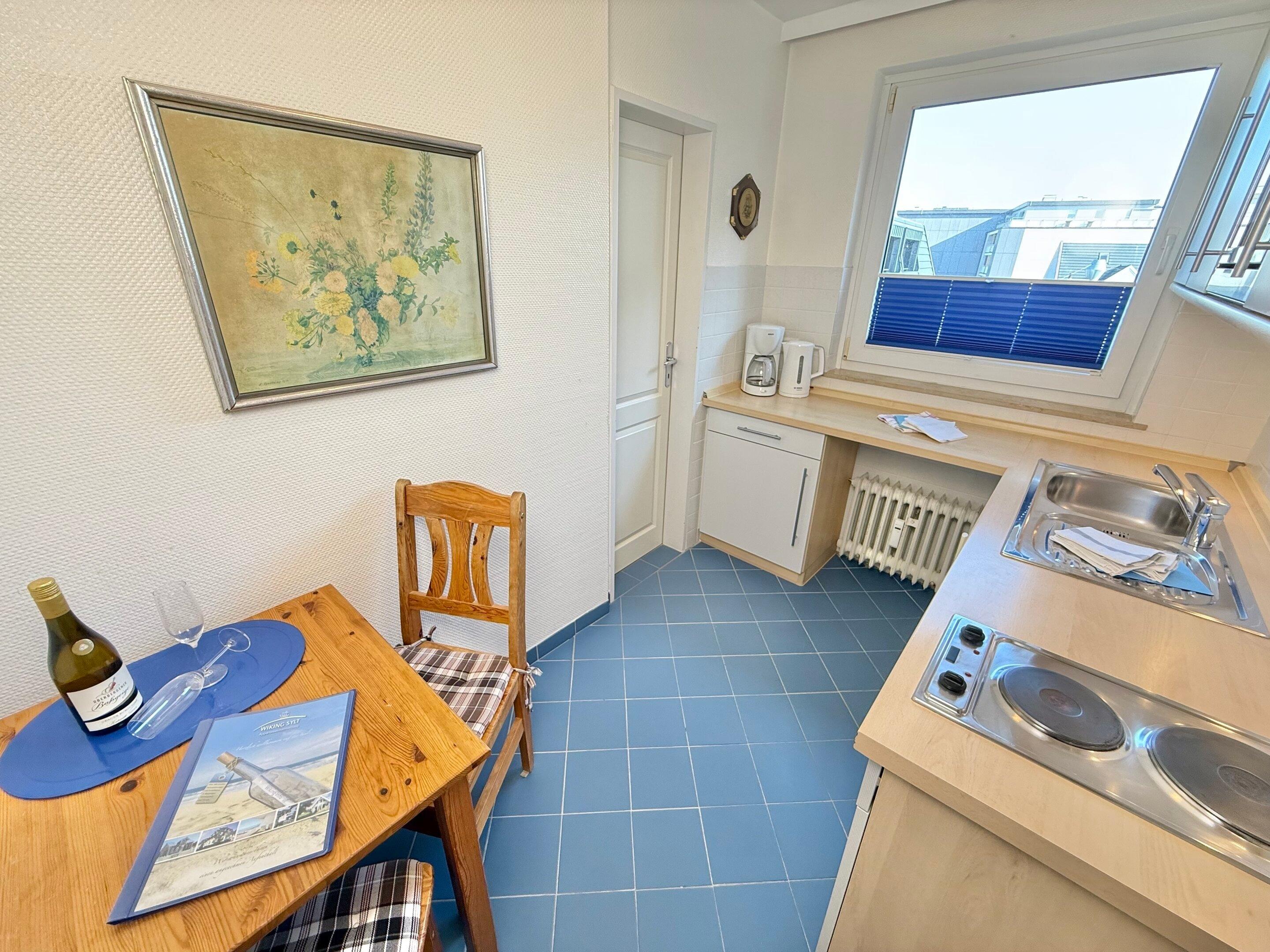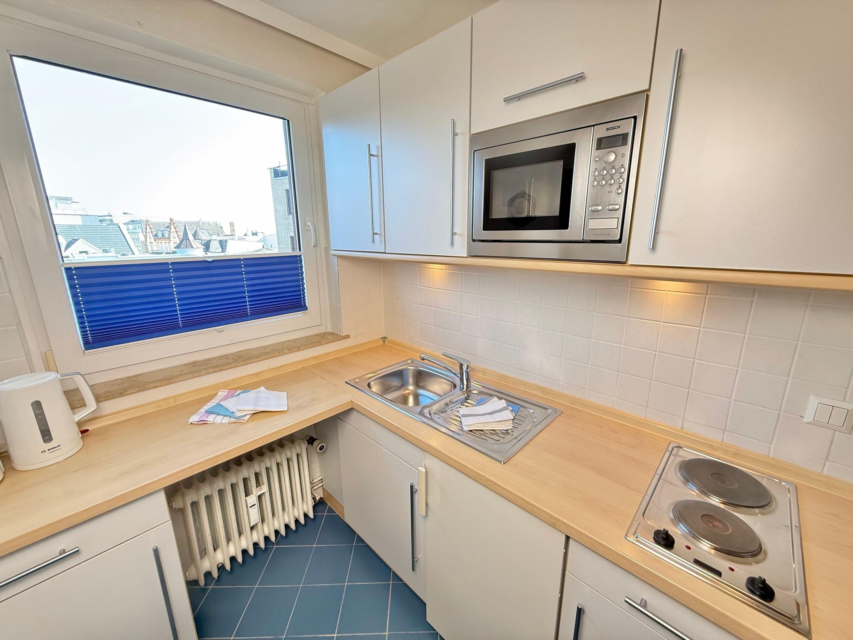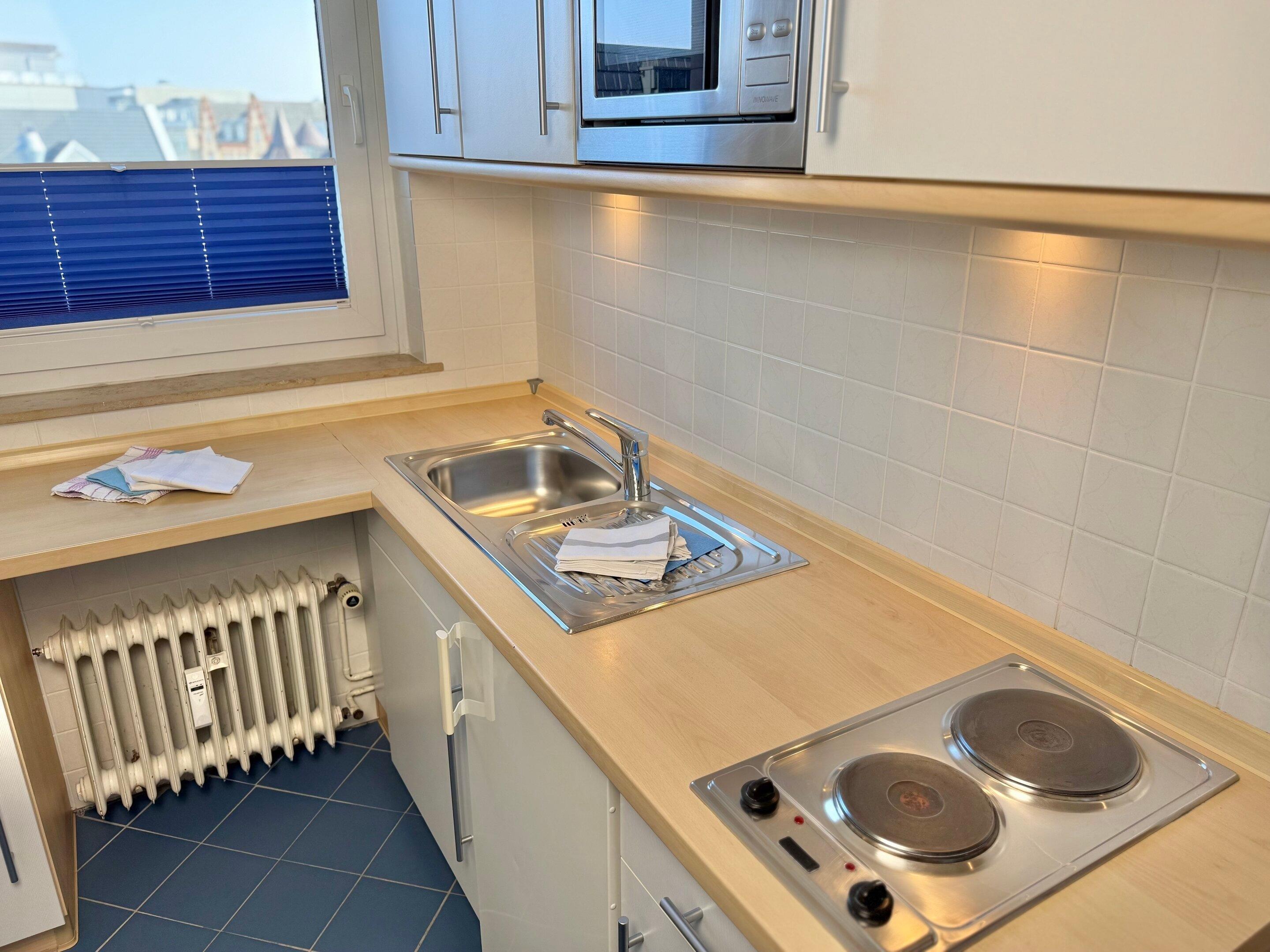 Die Küche hat einen Essplatz, eine Mikrowelle, ein 2-Platten-Kochfeld, einen Kühlschrank und ein Fenster. Kaffeemaschine, Wasserkocher und Toaster gehören zur Grundausstattung.