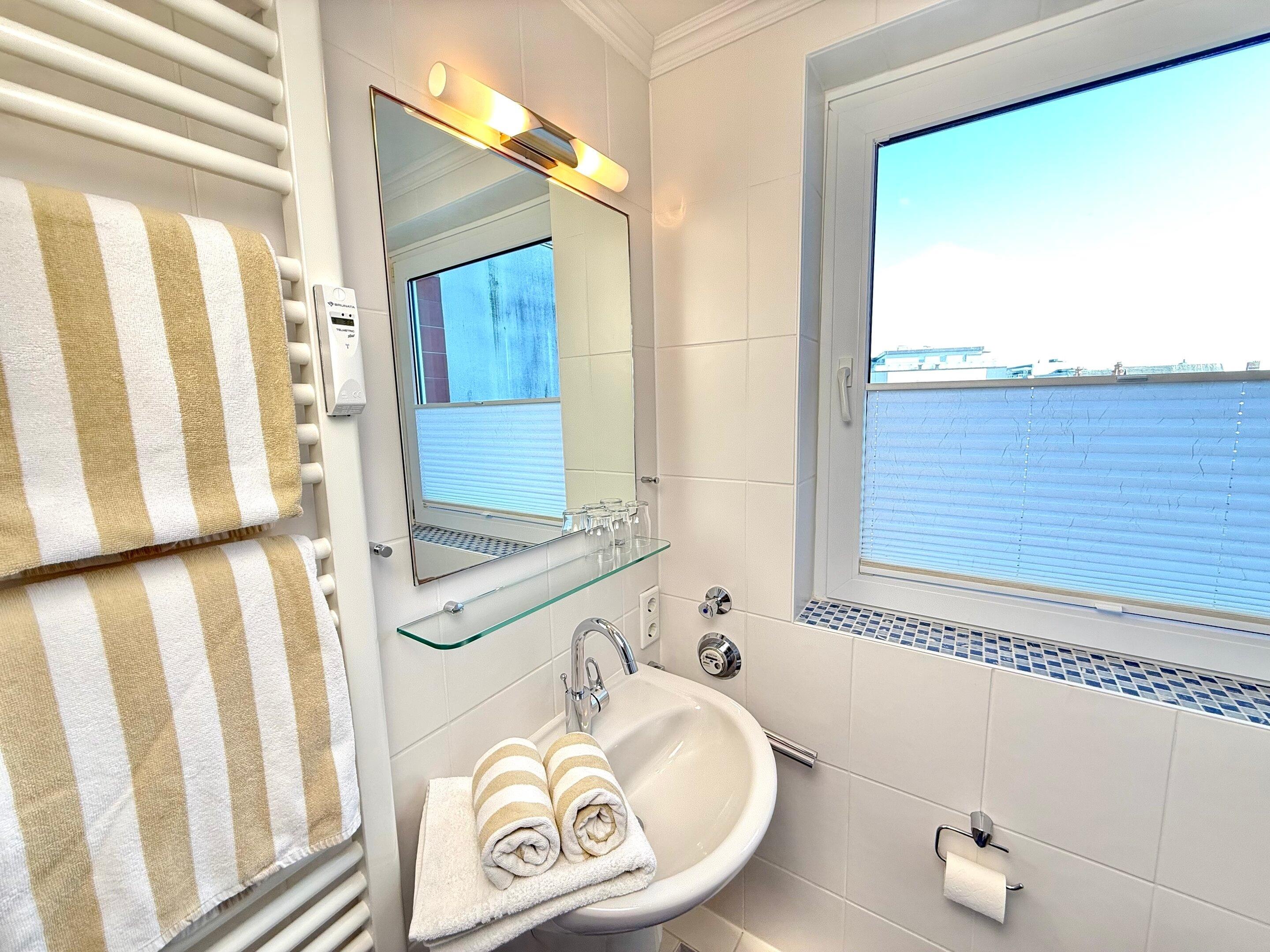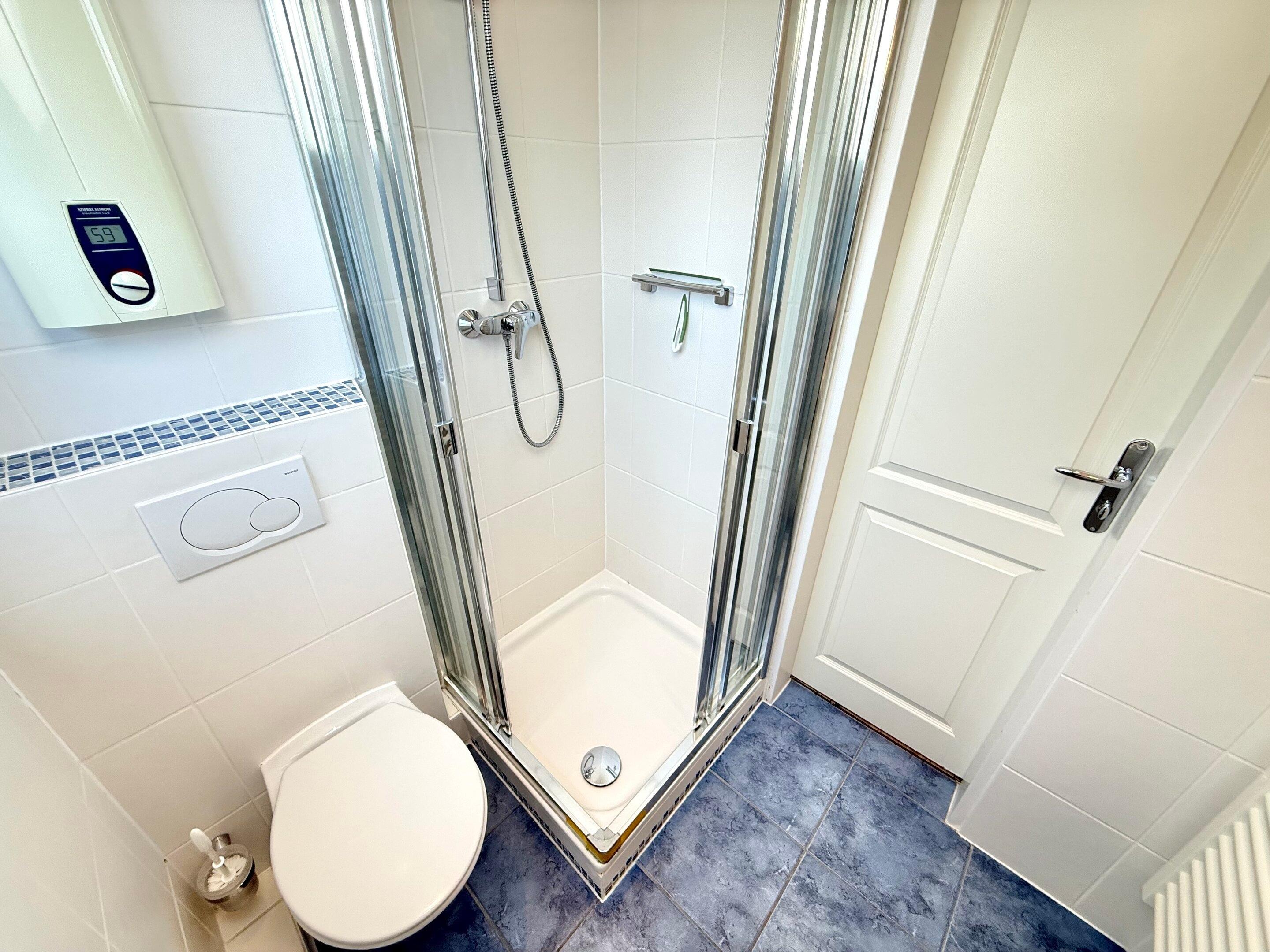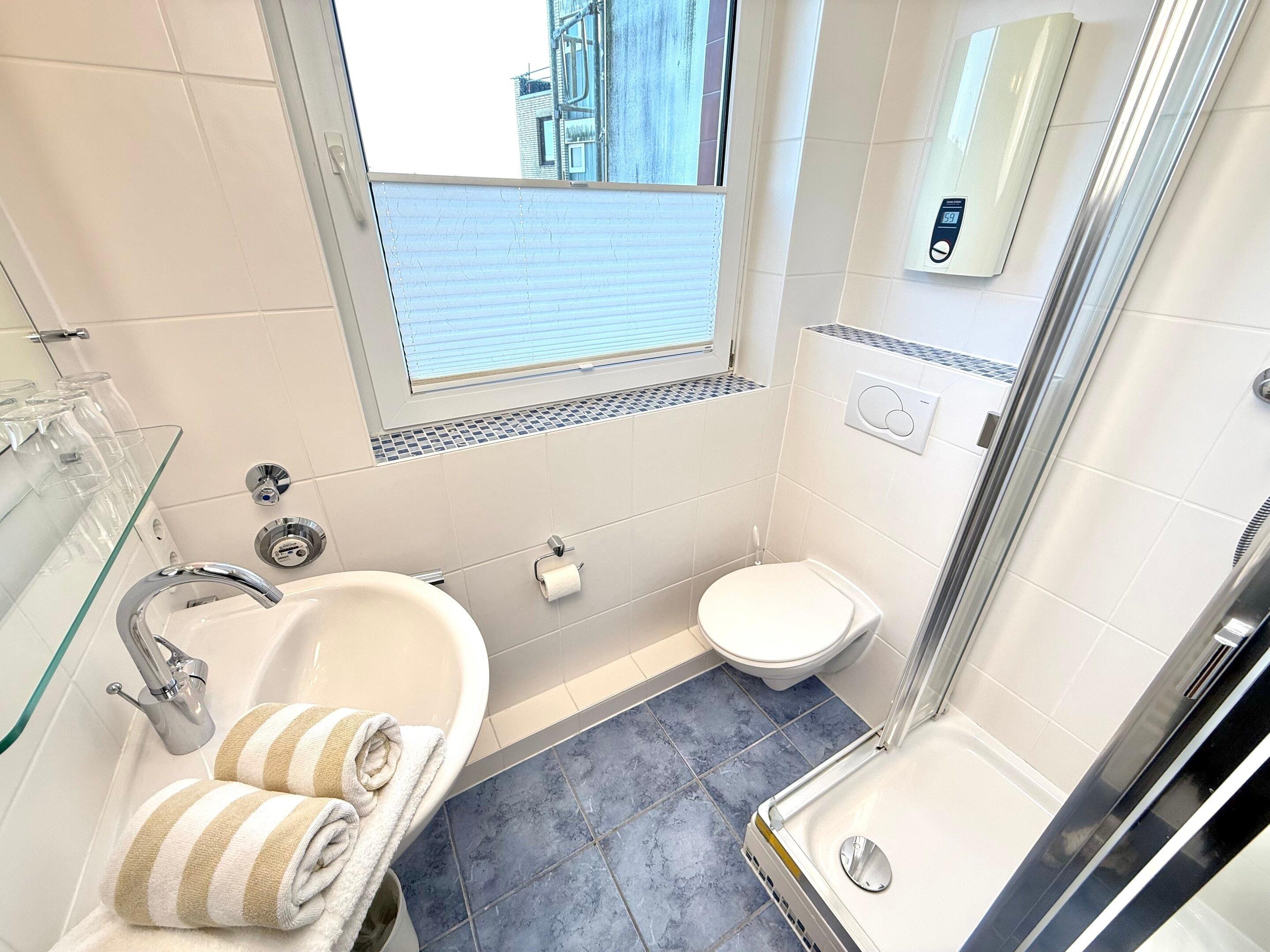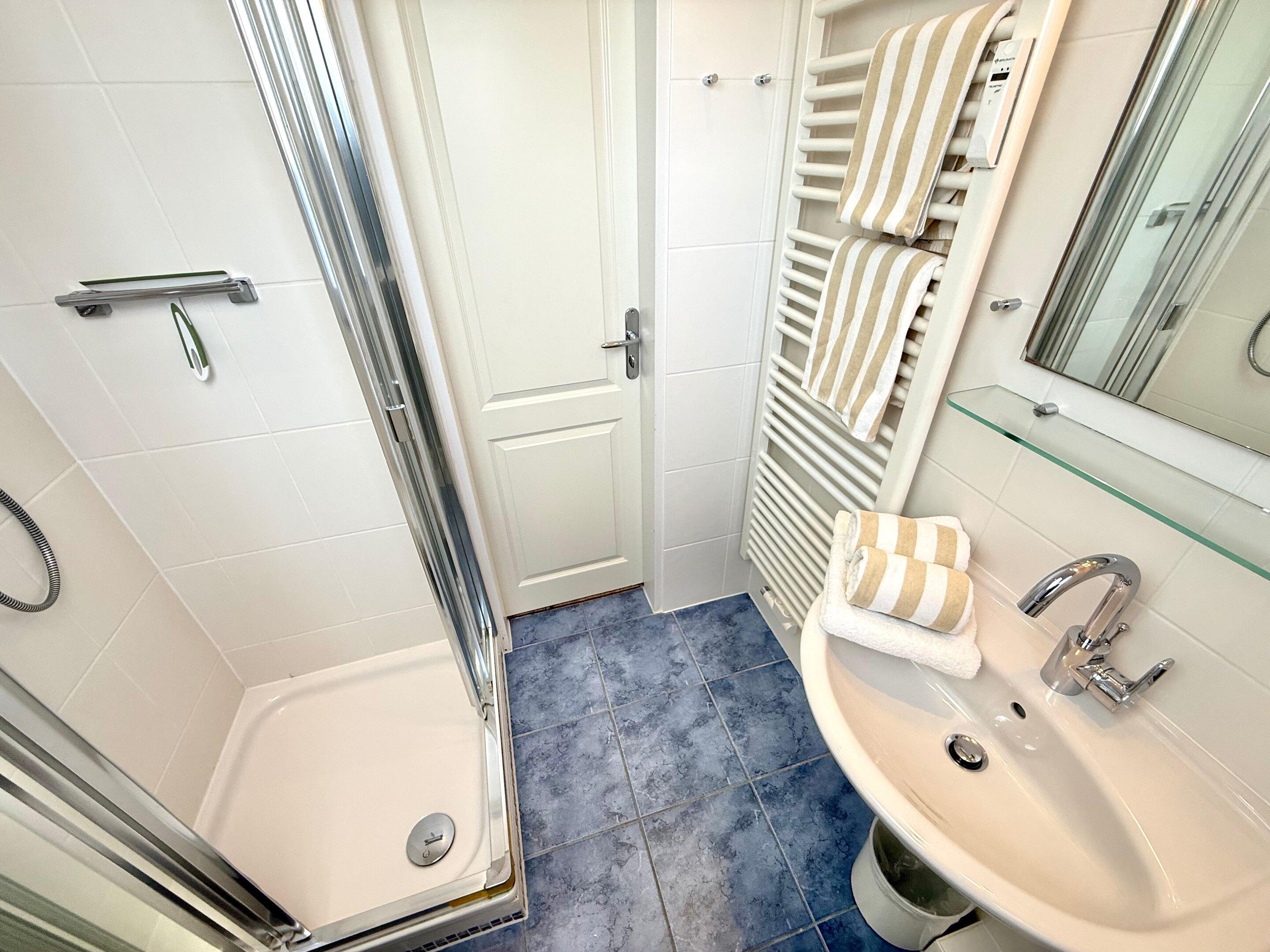 Im Bad befinden sich eine Dusche, ein WC, ein Waschtisch und ein Handtuchtrockner.