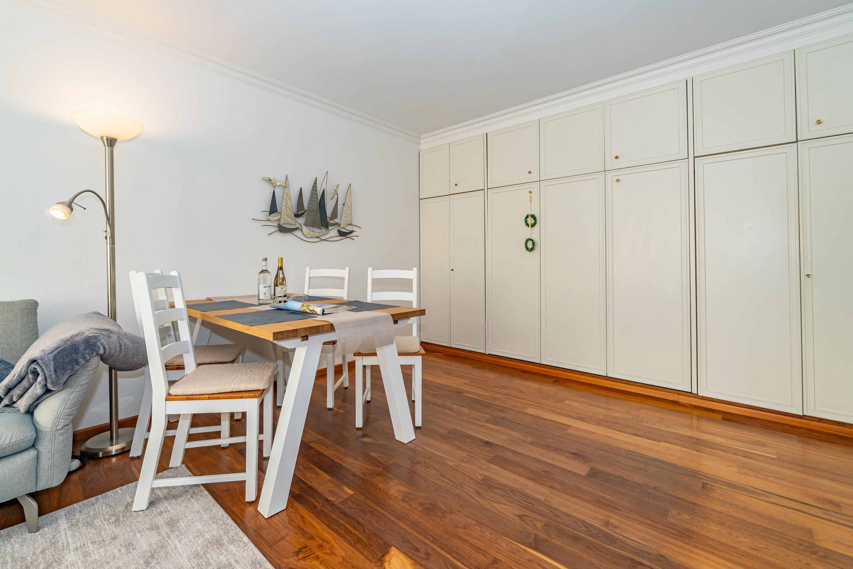 Vom Vorflur mit Garderobe gelangt man in das Wohnzimmer und das Doppelschlafzimmer (jeweils mit Austritt zum großzügigen Westbalkon), die kleine Küchenzeile und in das helle Duschbad/WC mit Fön.