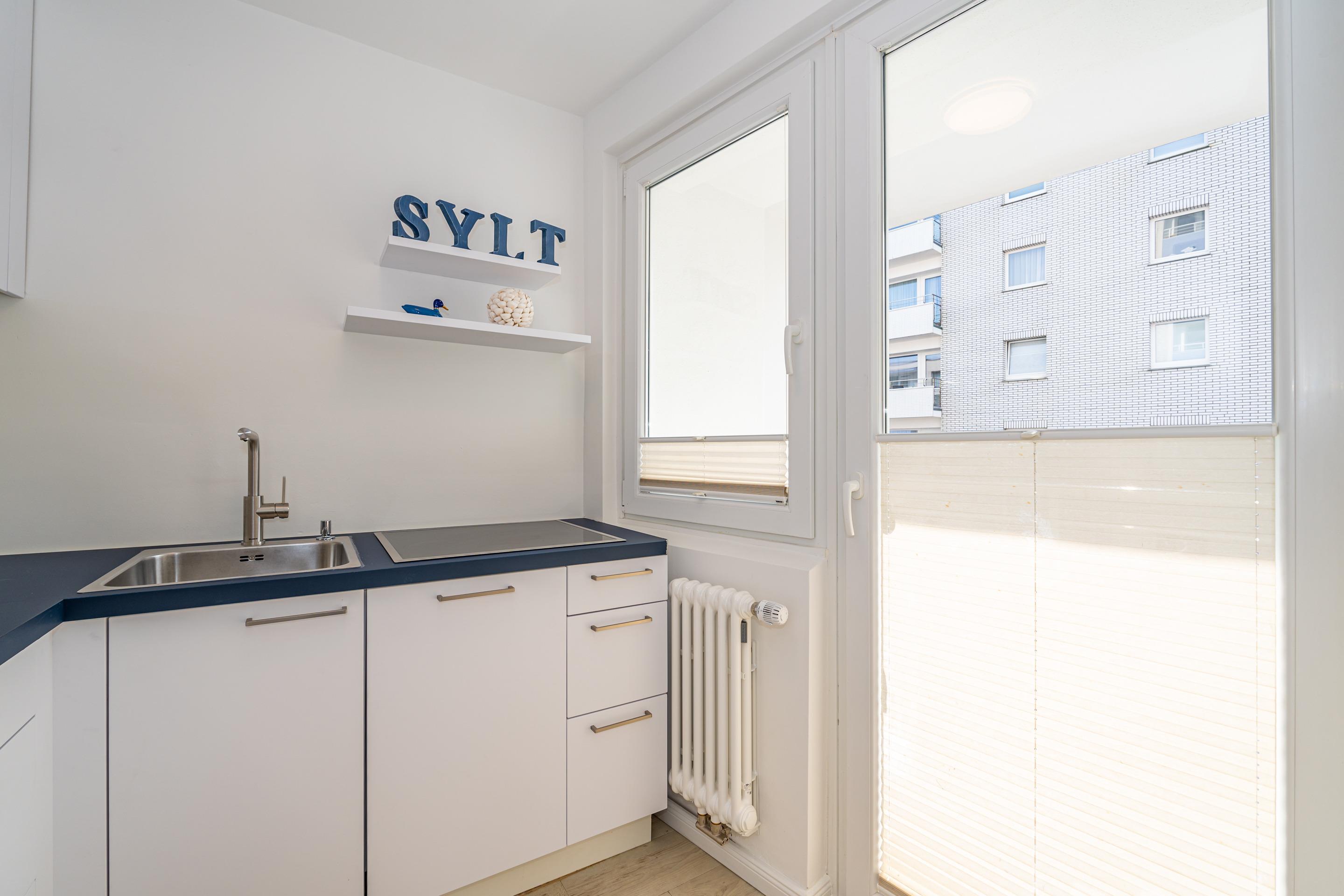 die separate Küche mit Geschirrspüler, Cerankochfeld, Mikrowelle und Austritt zum Südbalkon. Kaffeemaschine, Wasserkocher und Toaster gehören zur Grundausstattung.