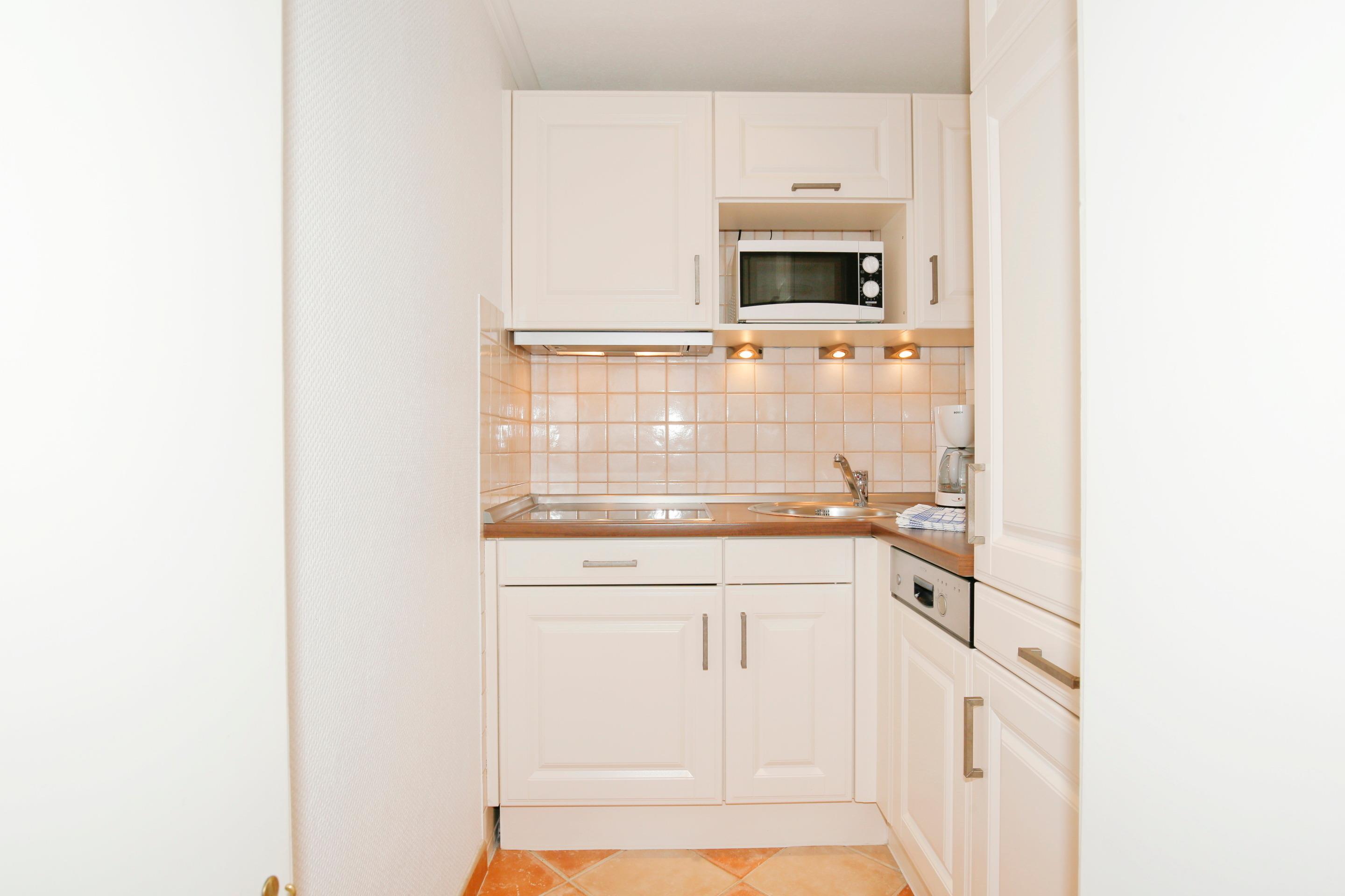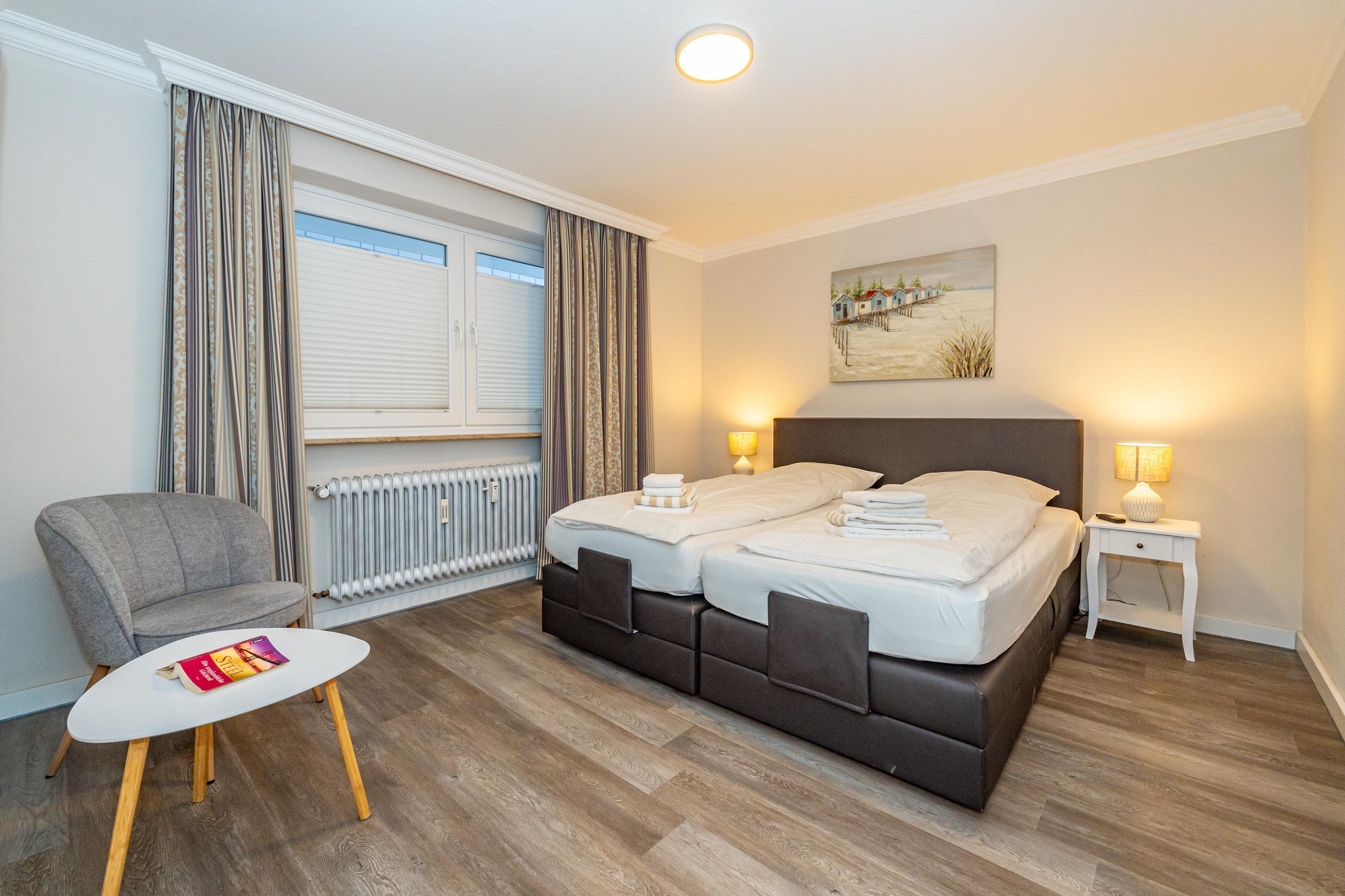 Die angrenzende, offene Küche ist modern und funktional ausgestattet mit Geschirrspüler, Cerankochfeld, Mikrowelle sowie Kaffeemaschine, Wasserkocher und Toaster – perfekt für Selbstversorger. Im separaten Schlafzimmer erwartet Sie ein wertiges Boxspringbett mit elektrisch verstellbarem Kopf- und Fußteil für höchsten Schlafkomfort. Ein bequemer Ohrensessel lädt zusätzlich zum Entspannen ein. Das helle Duschbad ist modern gestaltet und rundet das stimmige Wohnkonzept ab.