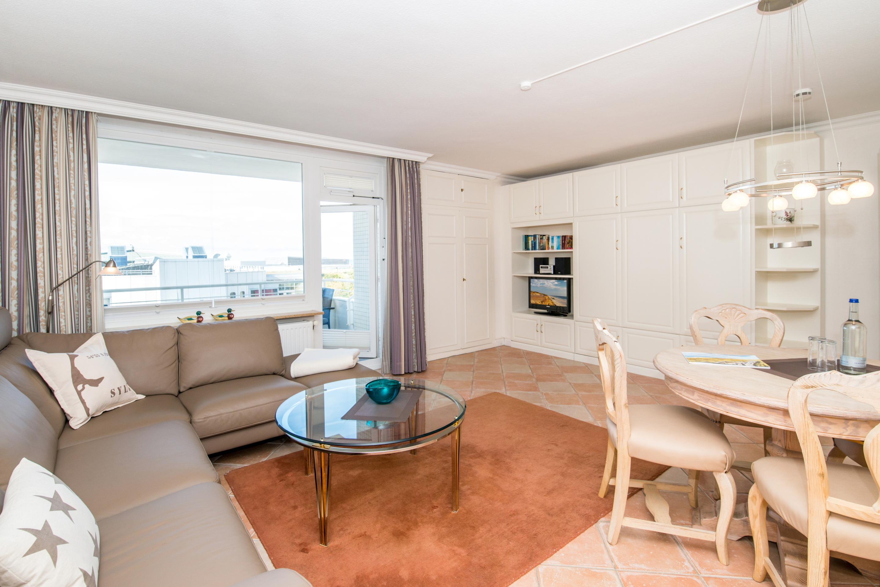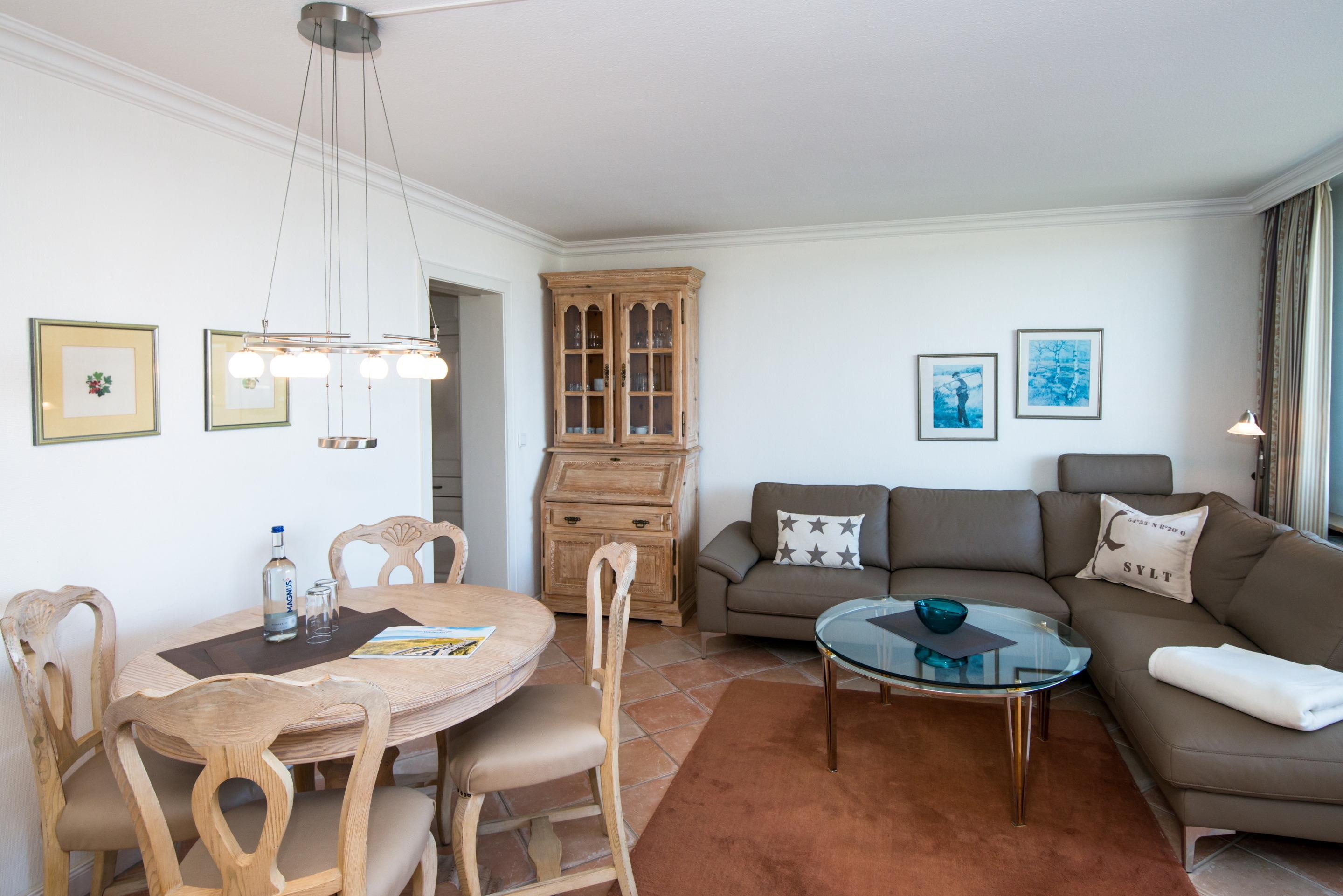 Vom geräumigen Flur mit Garderobe und großzügigem Schrankplatz betreten Sie das geschmackvoll eingerichtete Wohnzimmer mit Zugang zur Westloggia. Der Wohnbereich bietet eine komfortable Eckcouch, ein hochwertiges Doppelschrankbett (mit zwei Einzelmatratzen) sowie einen Essplatz. Ein Sat-Flachbild-TV und ein Philips Musiksystem (Radio/CD/MP3) sorgen für entspannte Unterhaltung.