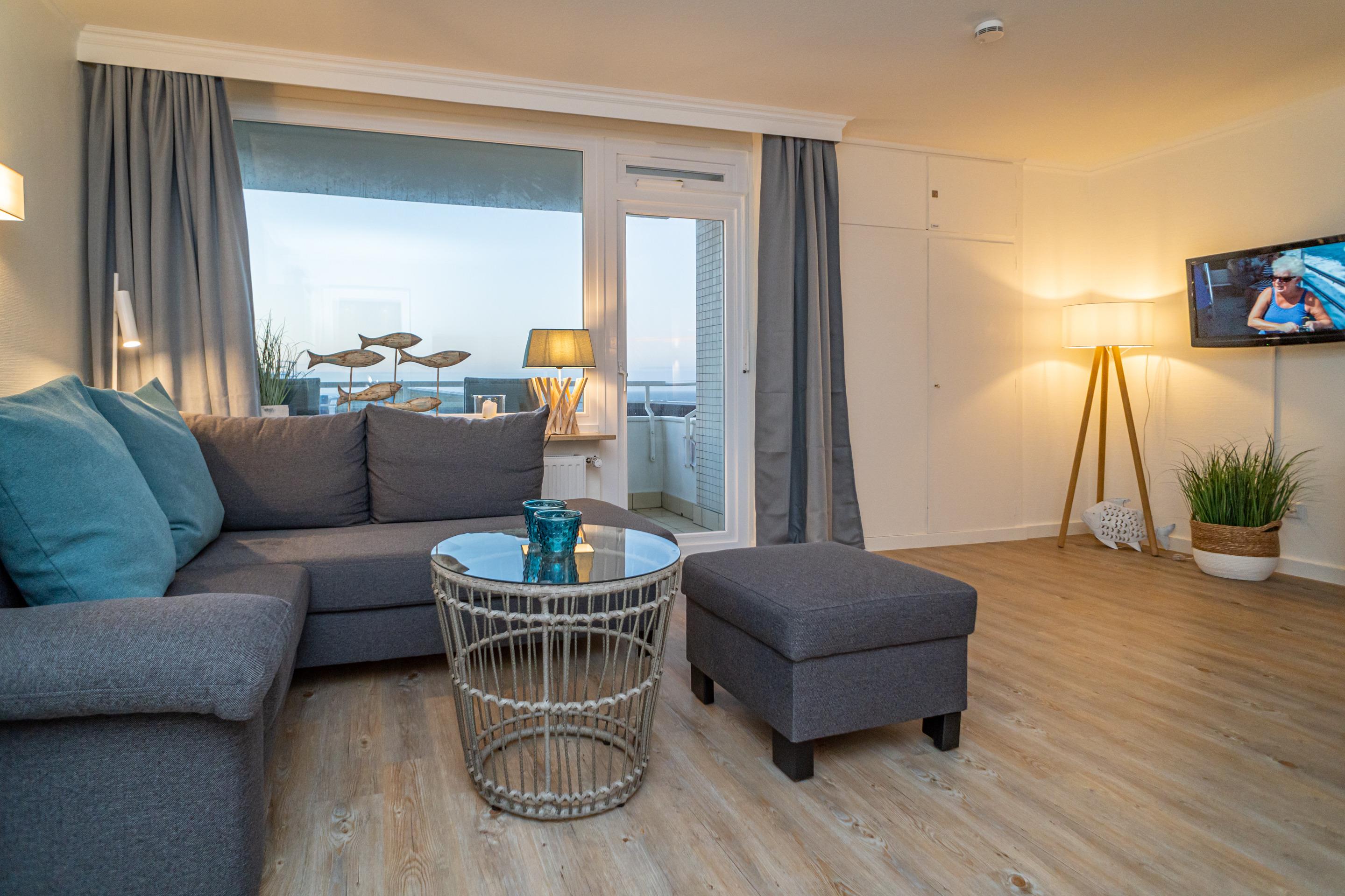 Schicke 2-Zimmer-Nichtraucher-Ferienwohnung (ca. 54 qm) in der 4. Etage mit Meerblick und Westloggia (Seeseite, mit Balkonmöbeln) für max. 2 Personen.
