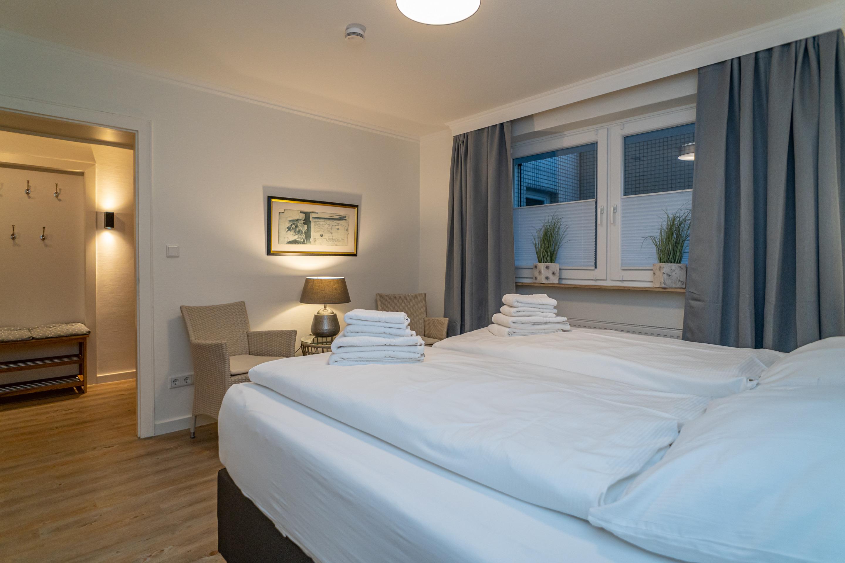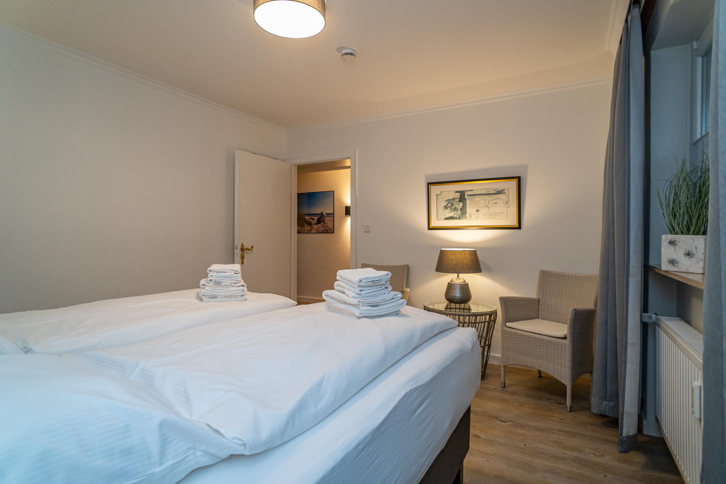 Das großzügige Schlafzimmer hat ein neues Boxspringbett (Liegefläche 2 m x 1,80, 2 Einzelmatratzen jeweils mit eigenem Topper) in Komfortliegehöhe und zwei bequemen Armlehnstühlen.