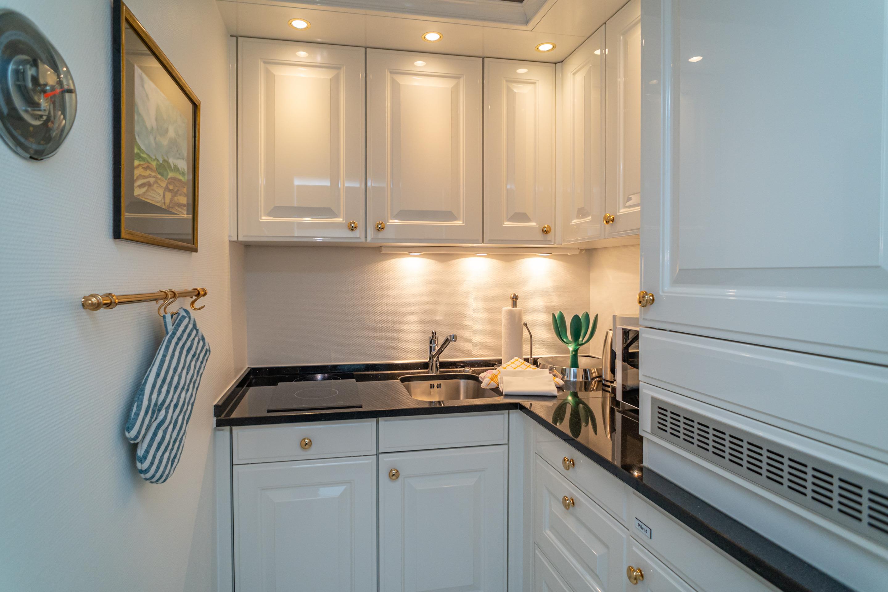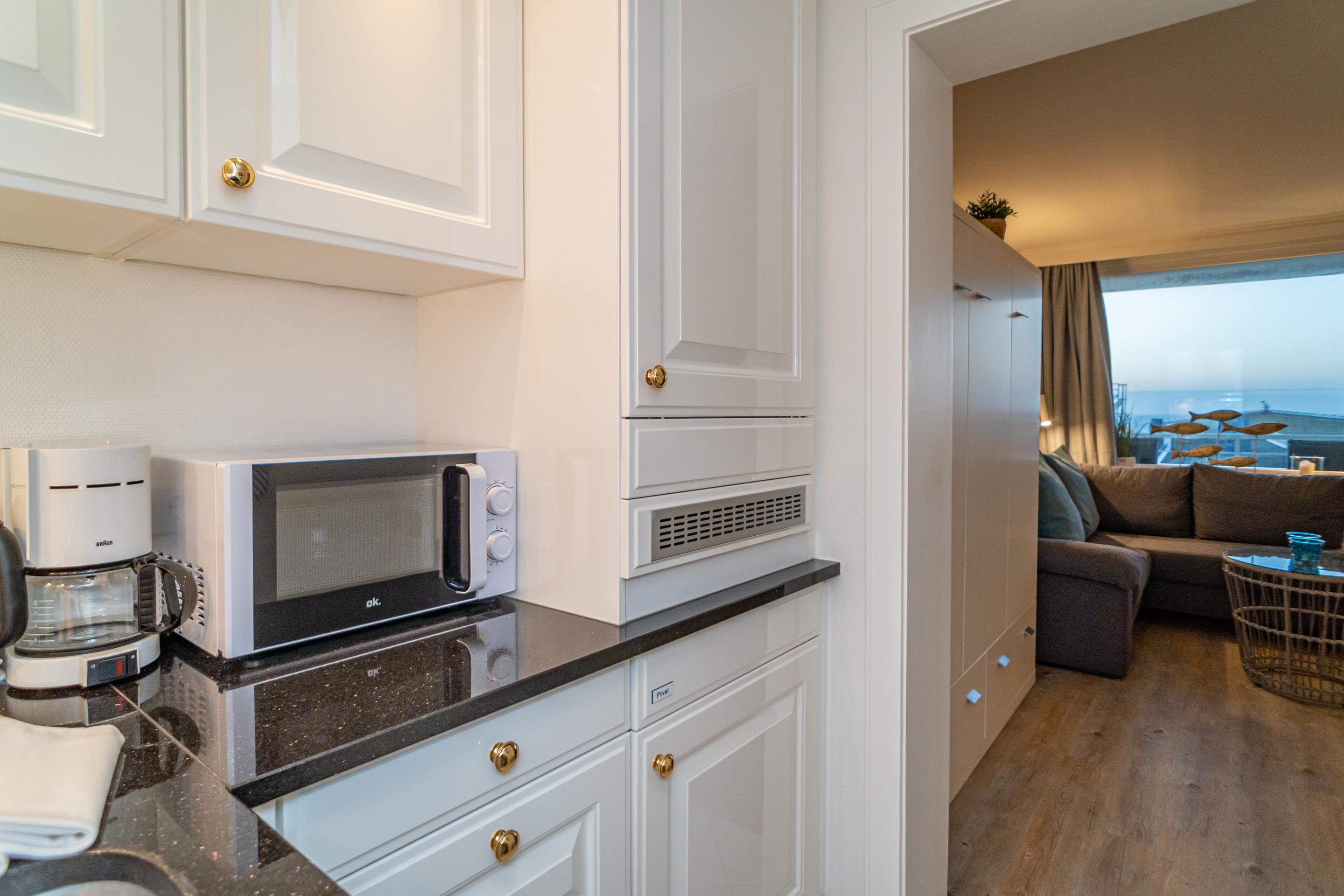 Die offene, neue Küche besitzt einen Geschirrspüler, Cerankochfeld (2 Felder), Mikrowelle, Nespresso-Maschine und Kühlschrank mit Gefrierfach. Kaffeemaschine, Wasserkocher und Toaster gehören zur Grundausstattung.