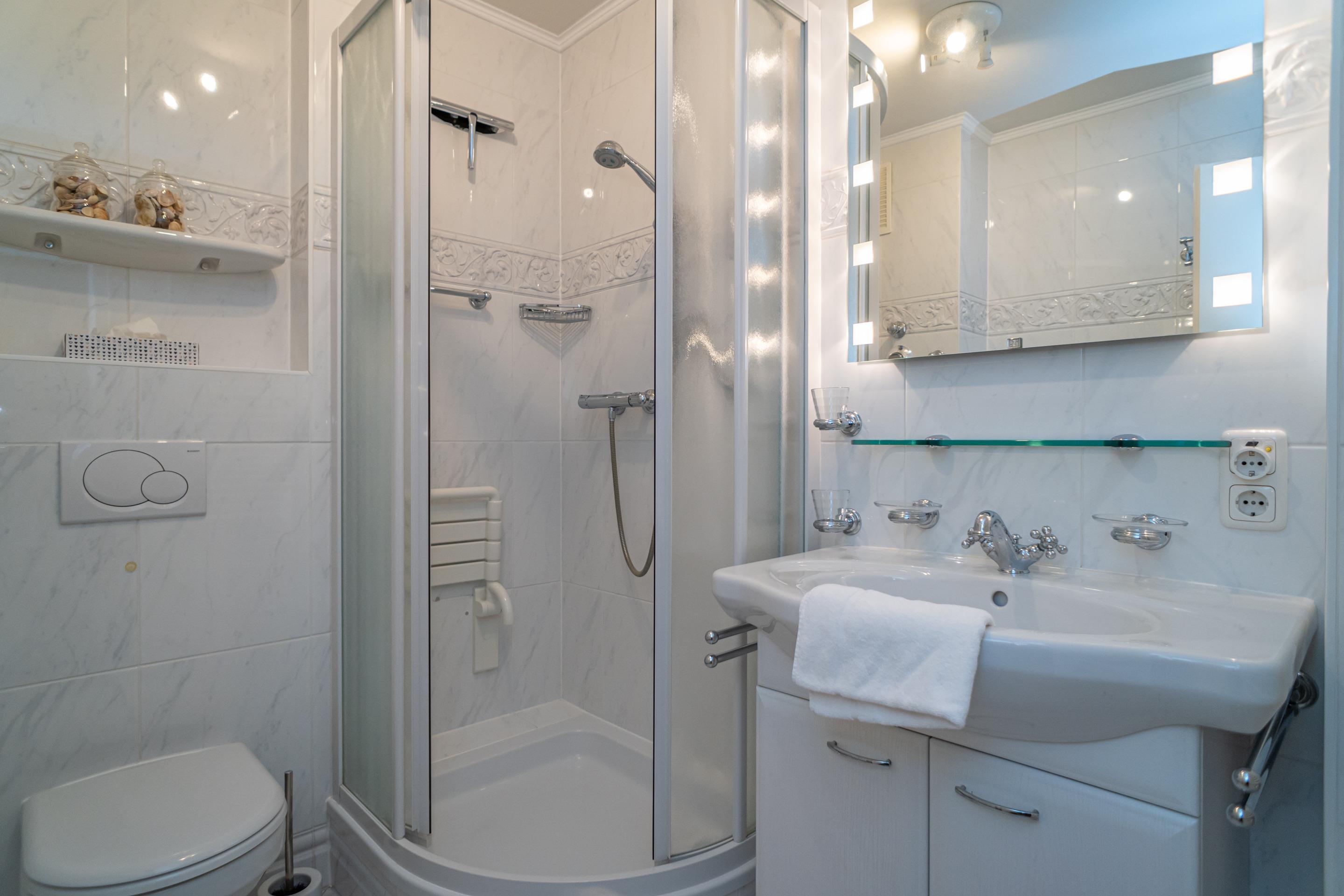 Das neuwertige Badezimmer ist mit Dusche, Waschtisch, Handtuchtrockner und WC ausgestattet.