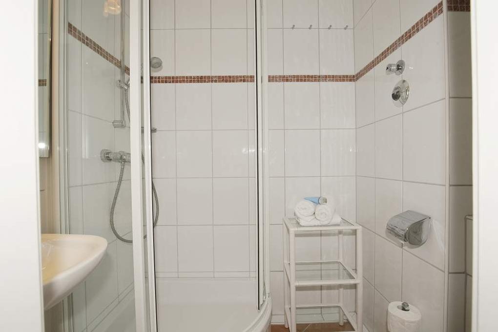 Im Bad befinden sich eine Dusche, ein WC, einen Waschtisch und ein Handtuchtrockner.