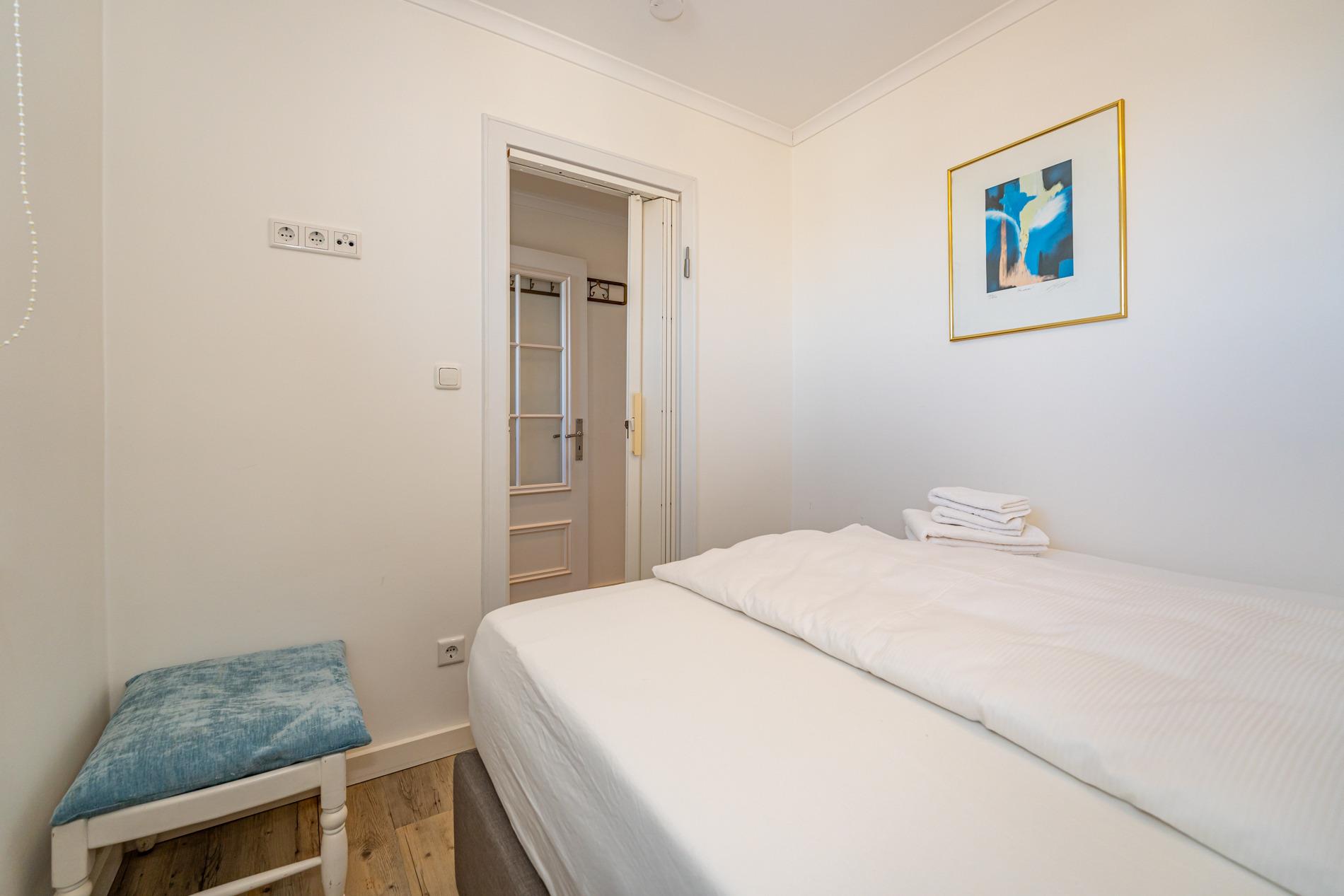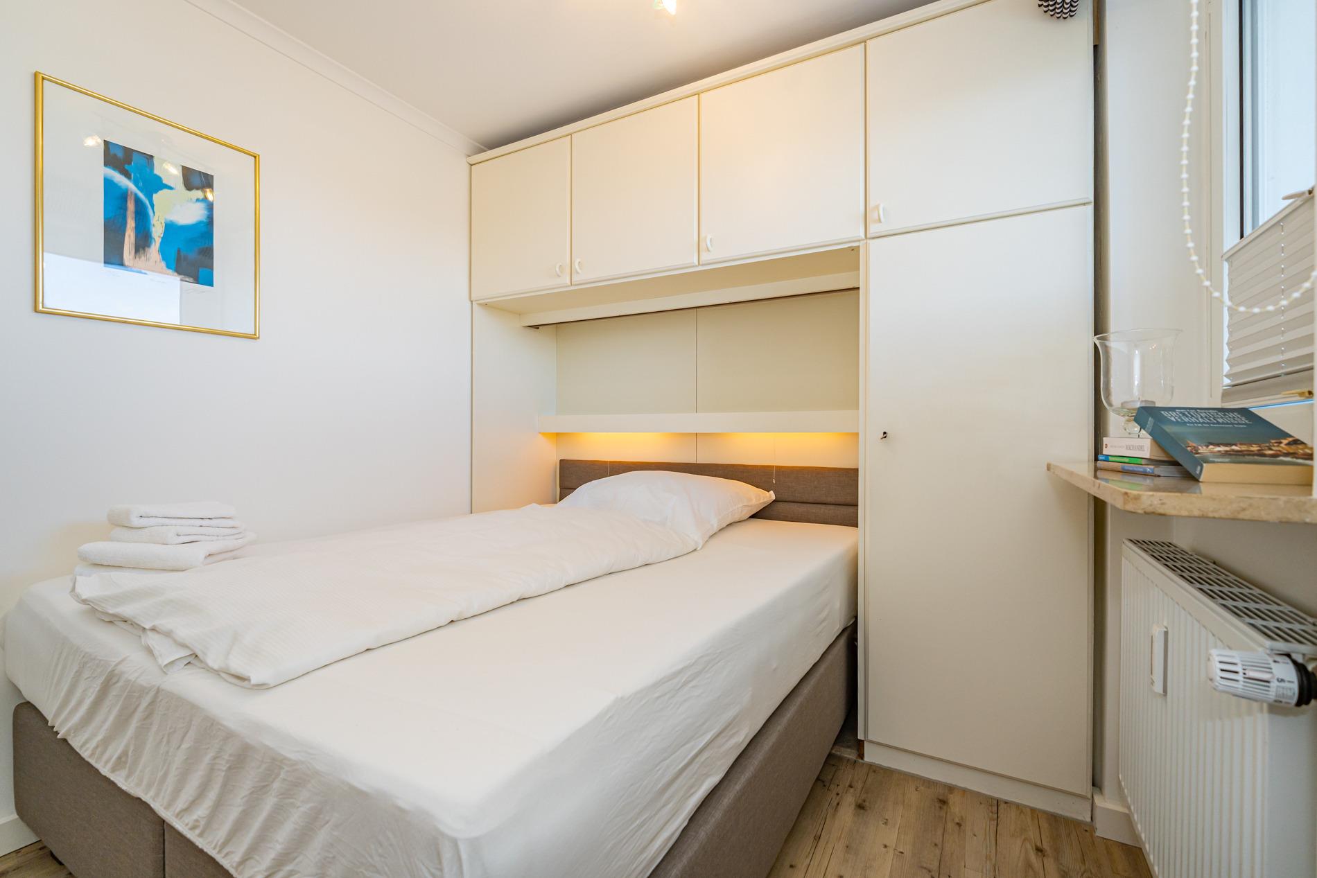 Das Schlafzimmer ist mit einem feststehendem Doppelbett (mit Einzelmatratzen 0,80 x 1,90 m, durchgängiger Topper) ausgestattet.