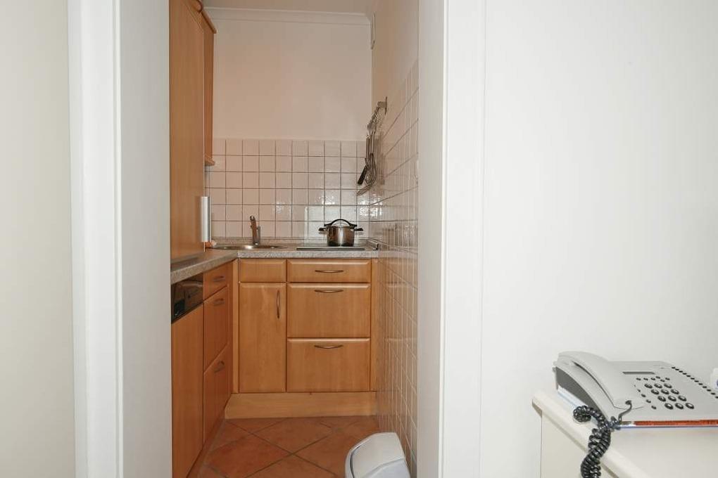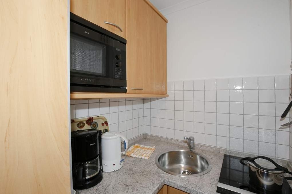 Die kleine offene Küche hat einen Geschirrspüler, eine Mikrowelle und ein Ceranfeld mit 2 Kochfeldern. Kaffeemaschine, Wasserkocher und Toaster gehören zur Grundausstattung.