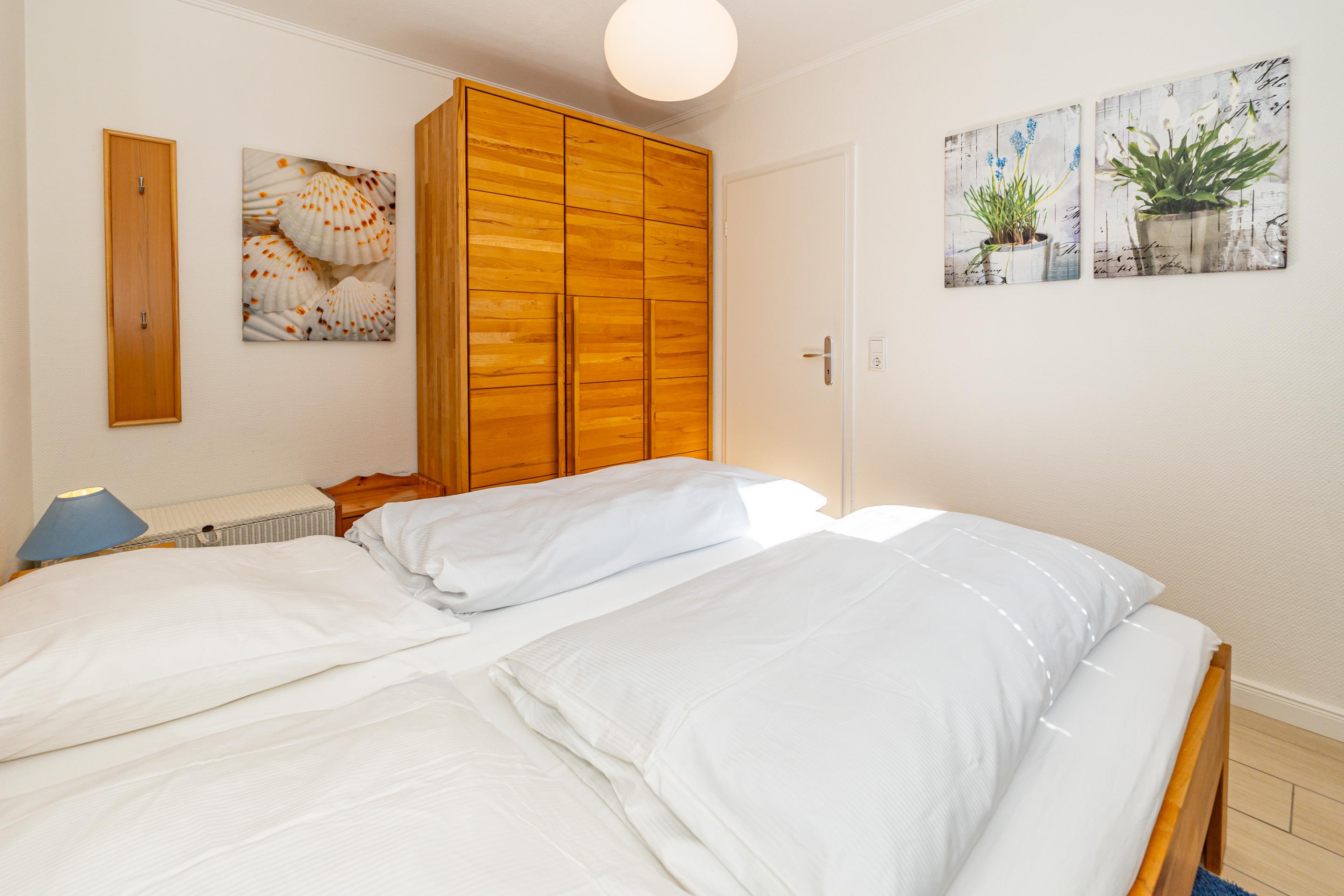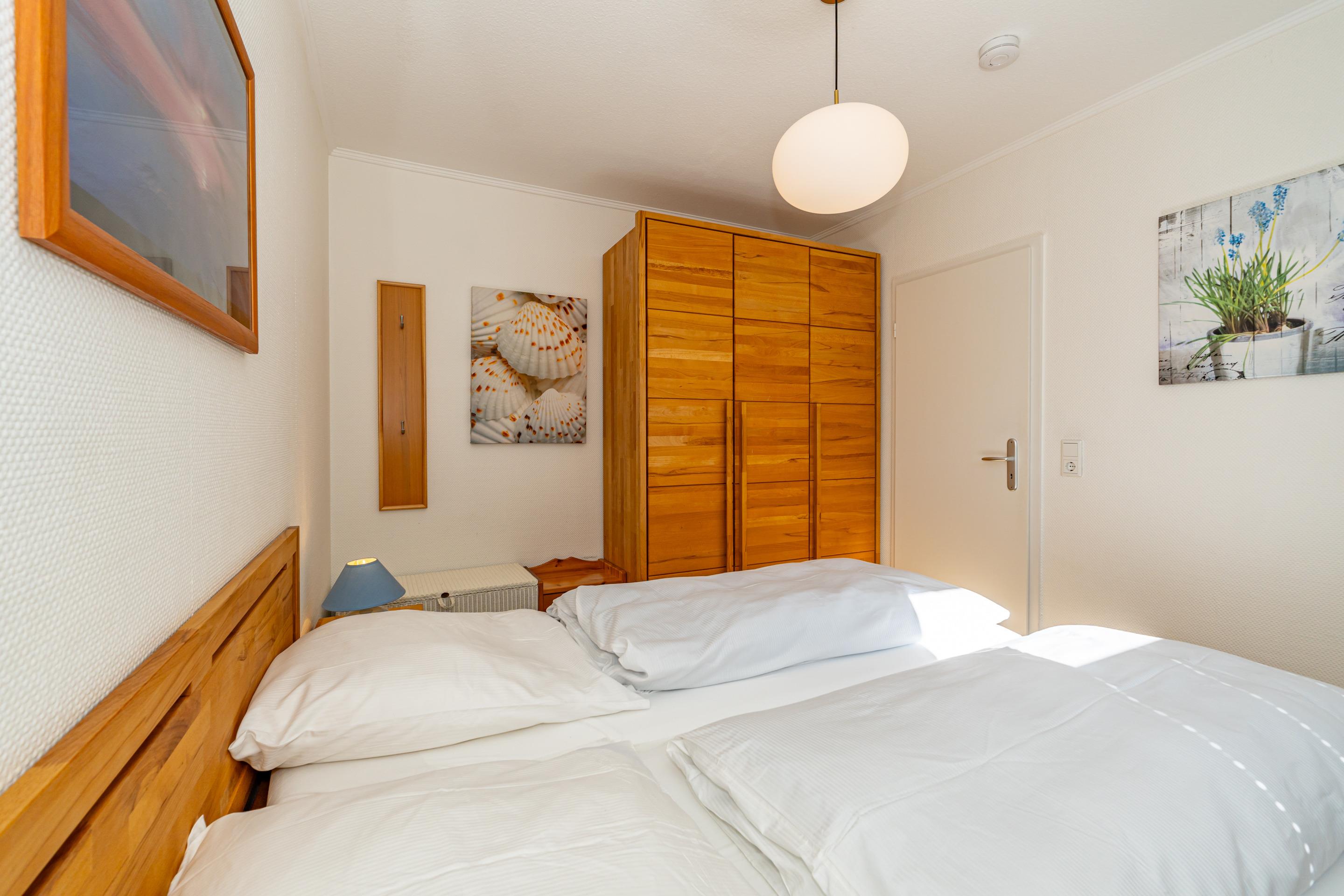 Das vom Wohnzimmer aus begehbare Schlafzimmer hat ein gutes Doppelbett (2 m x 1,80 m) mit zwei Einzelmatratzen, einen Kleiderschrank und zwei Nachttische.