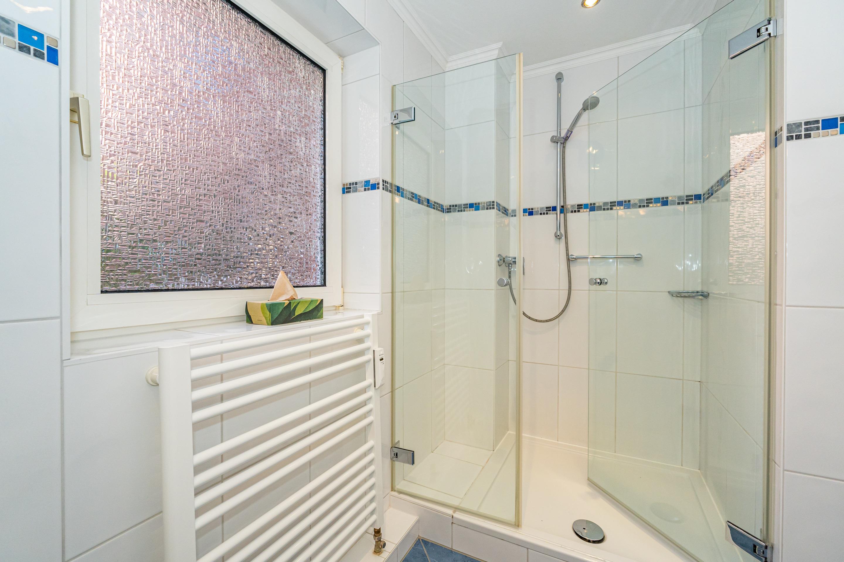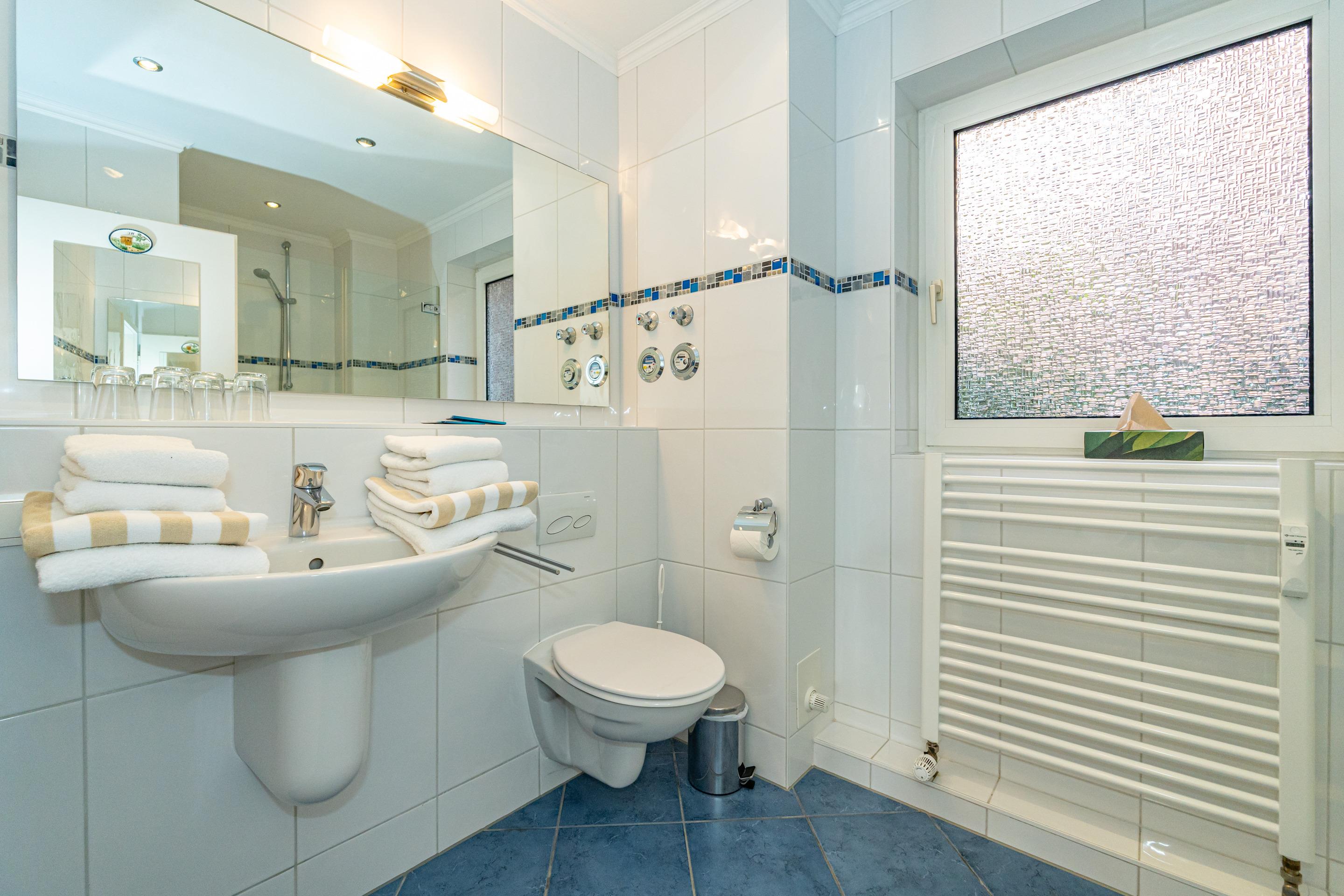 Das Duschbad hat eine flach begehbare Dusche, einen Waschtisch, einen Handtuchtrockner, WC und Fenster.