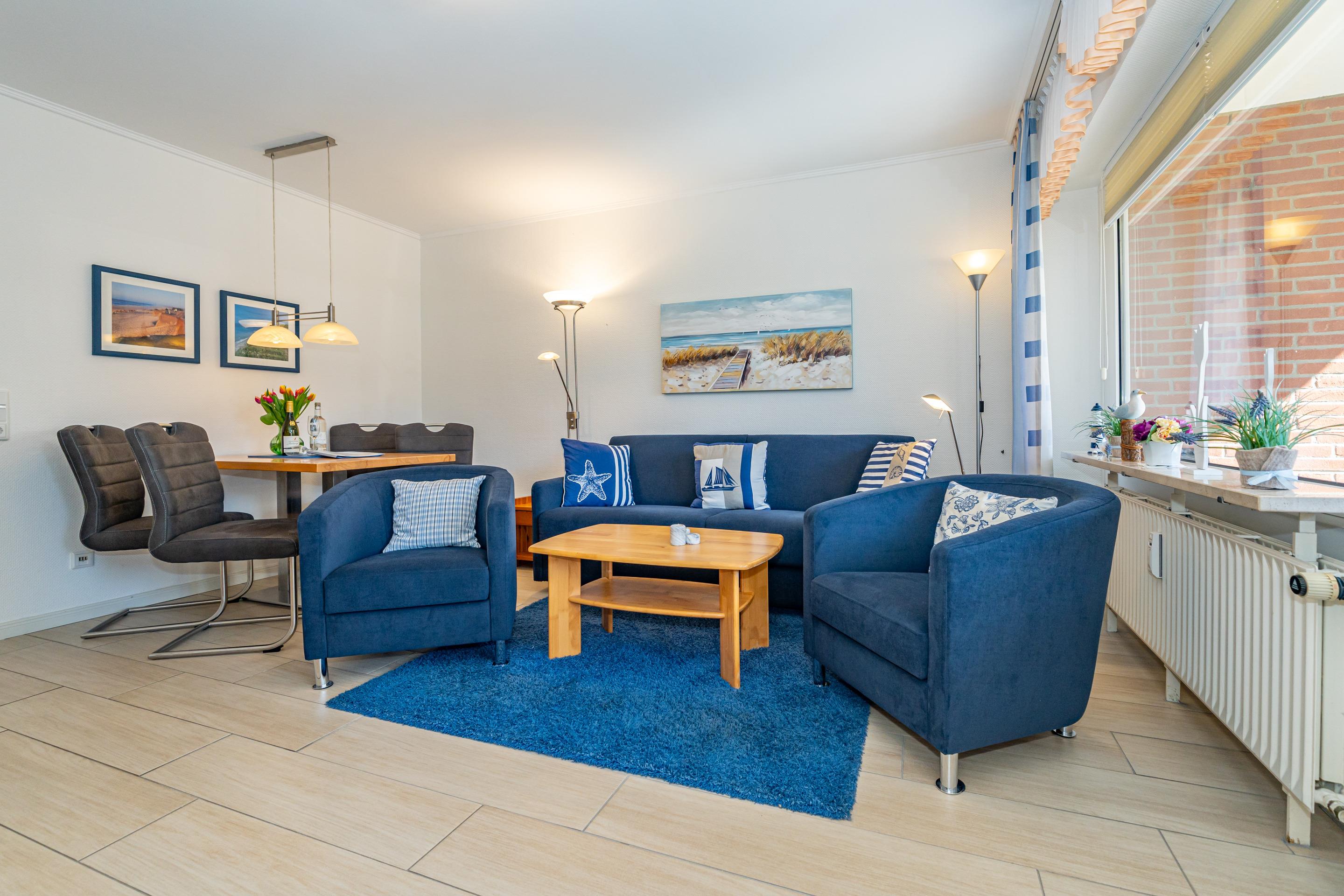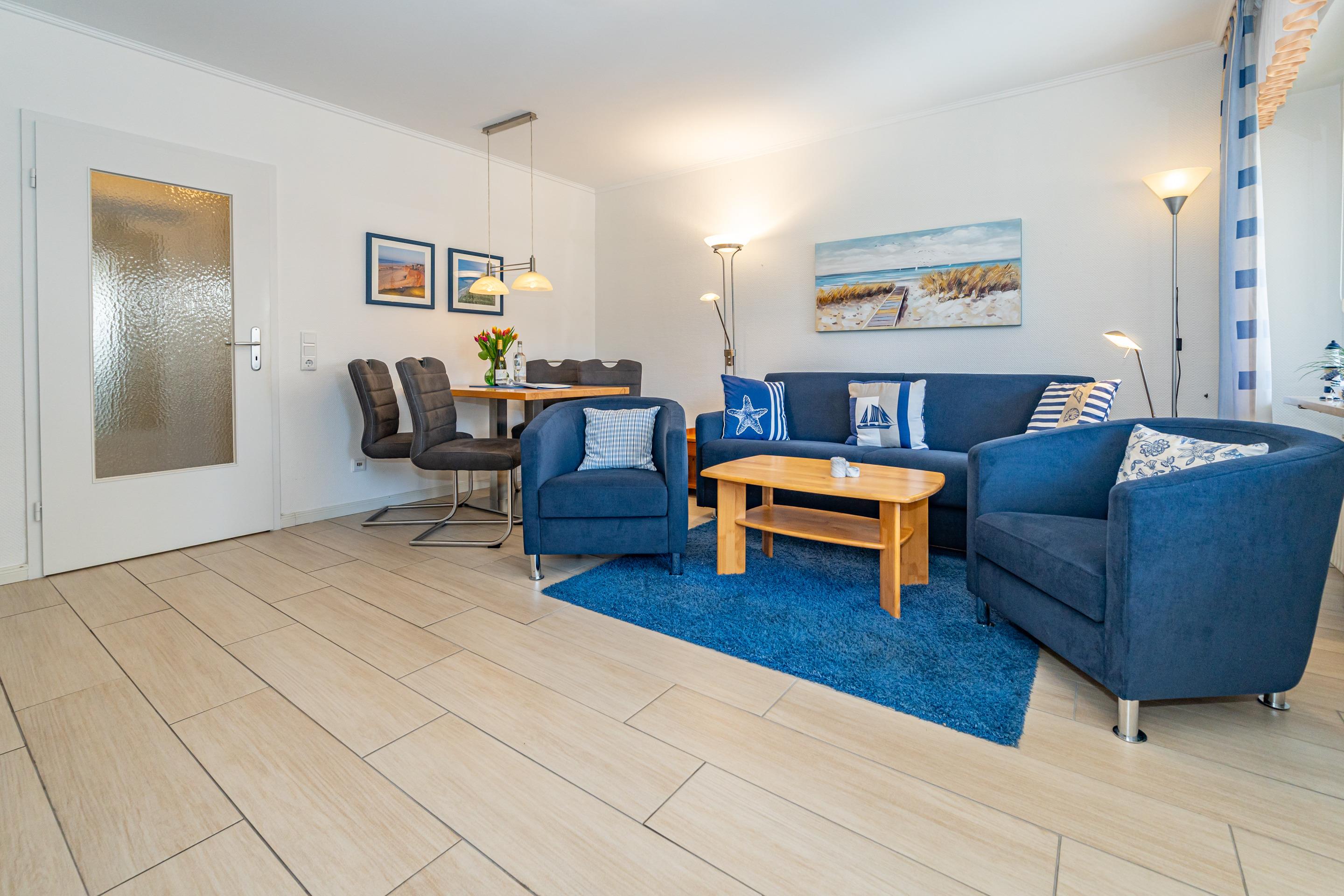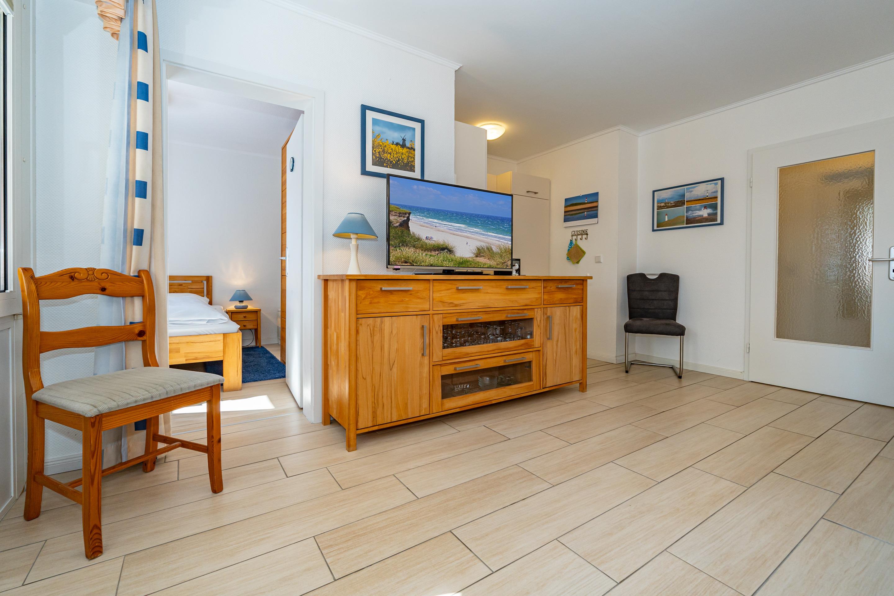 Der Wohnraum besteht aus einer bequemen Sitzgarnitur (Doppel-Schlafcouch 1,60 m x 2,00 m und zwei Sesseln), einem Essplatz, Kabel-Flachbild-TV, Radio und offener Küche.