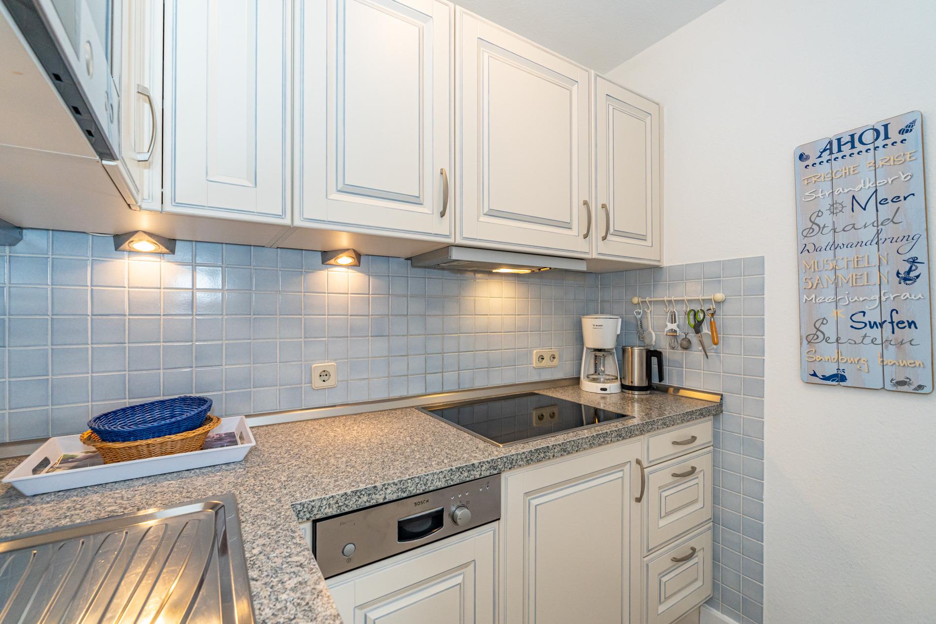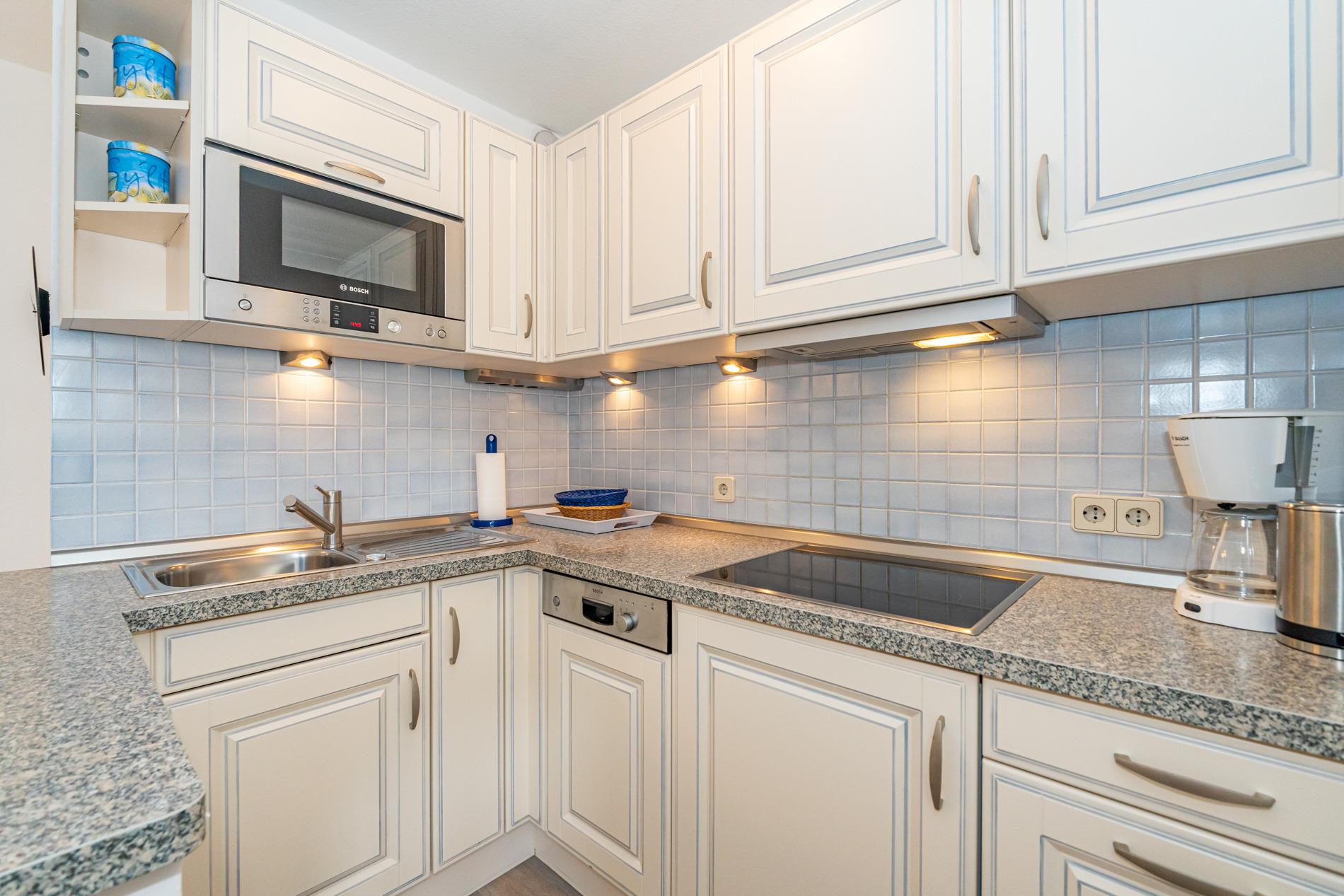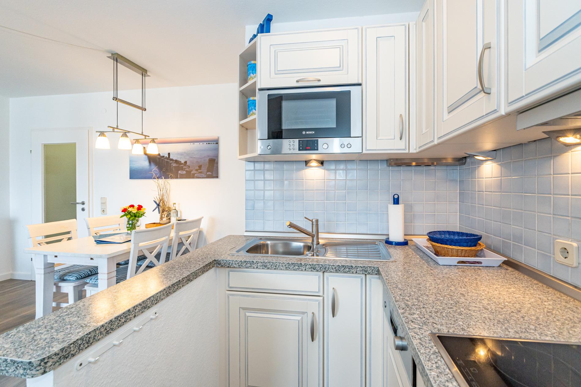Die neue, offene Küche ist mit Geschirrspüler, Cerankochfeld , Mikrowelle und Kühlschrank mit 4-Sterne-Gefrierfach gut ausgestattet.