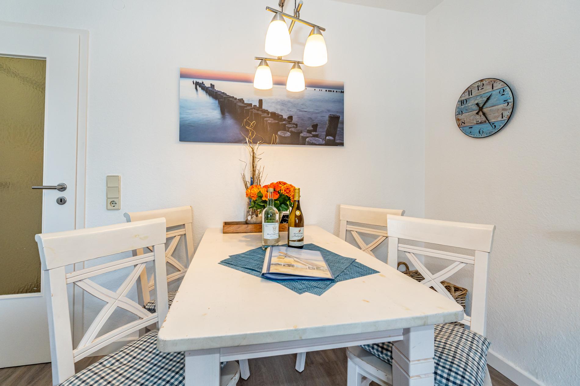 Komfortable 2-Zimmer-Ferienwohnung auf einer Ebene, ca. 53 qm in der 1. Etage zur Ostseite mit Ostloggia (Morgensonne, mit Balkonmöbeln und Auflagen) für max. 3 Personen.