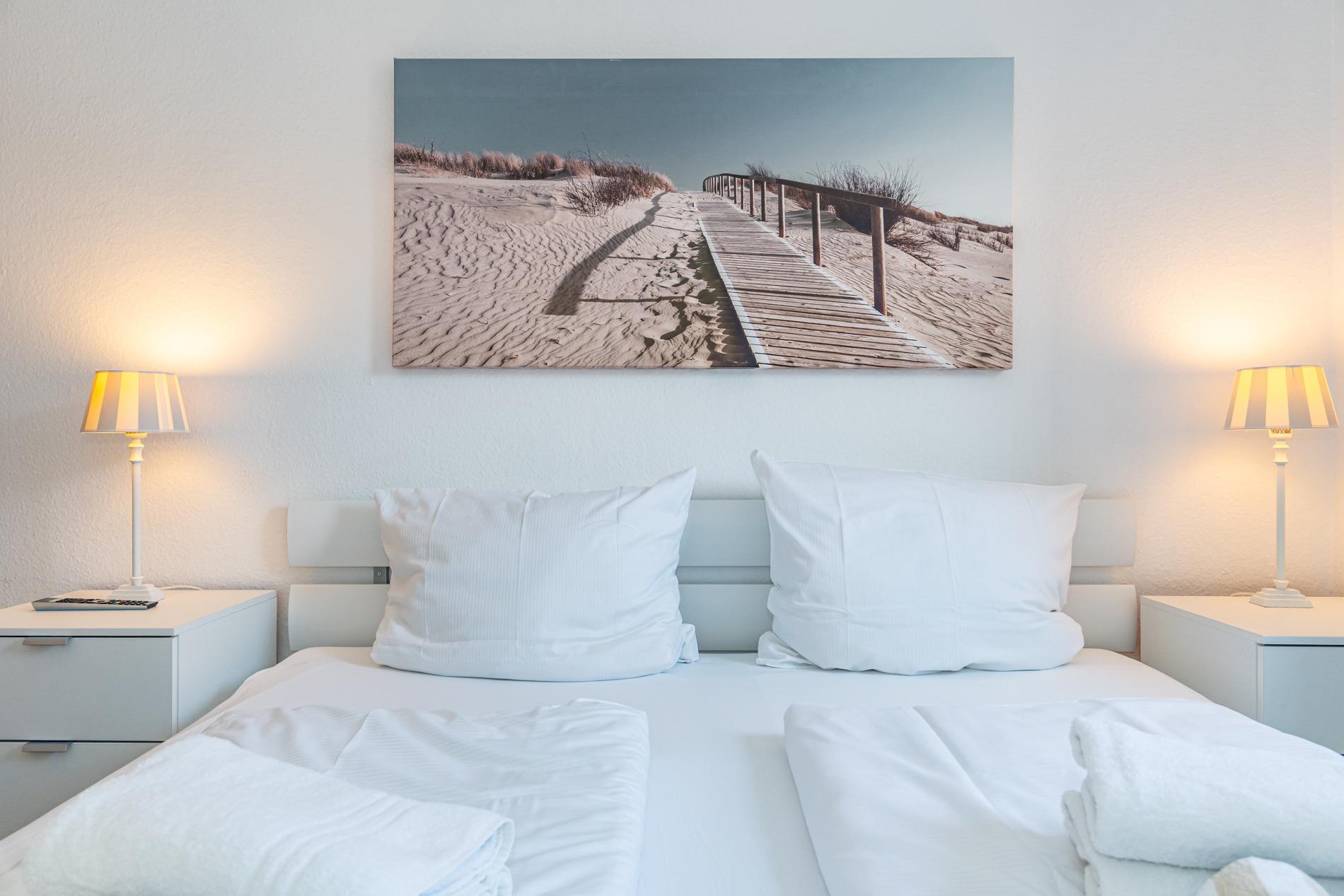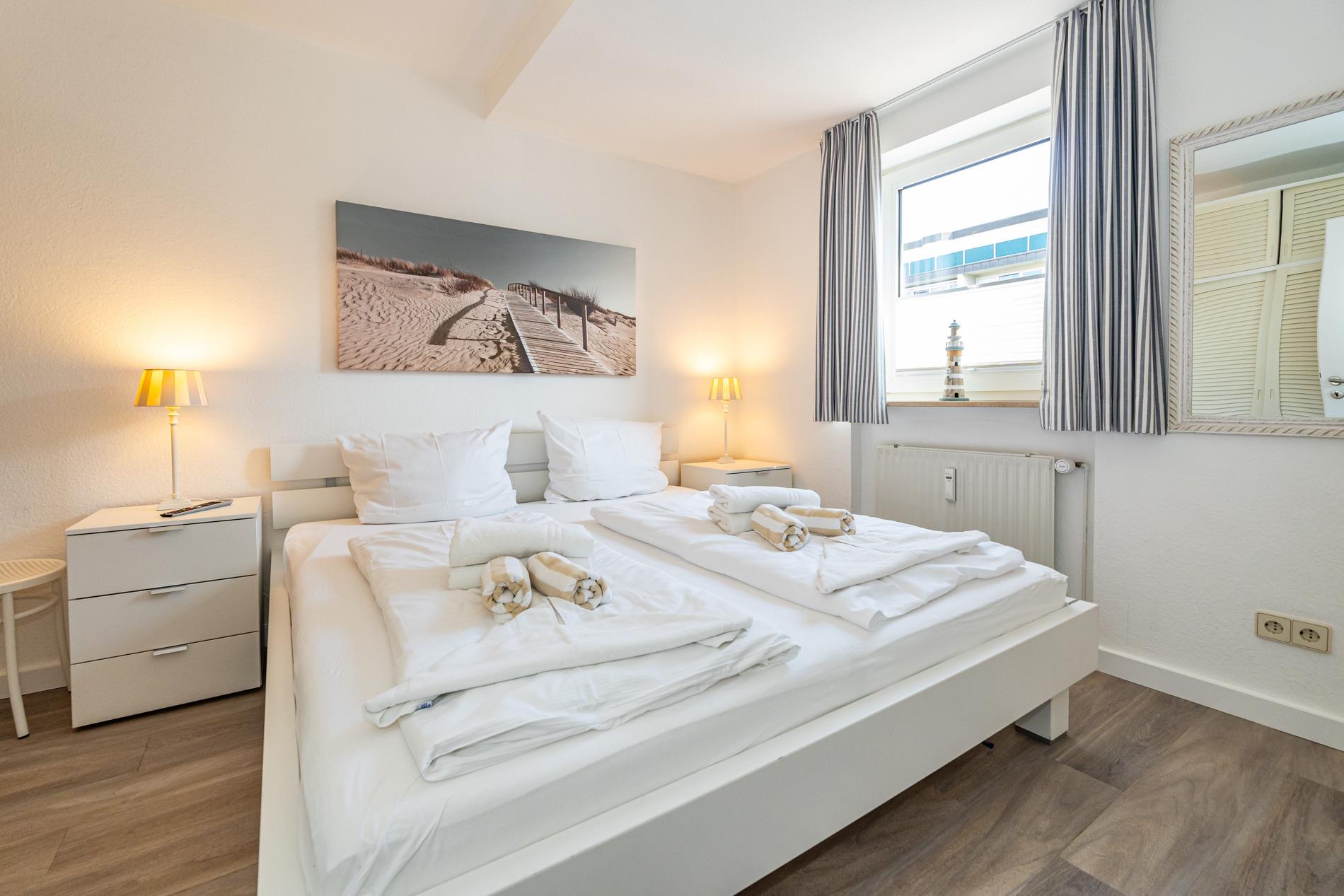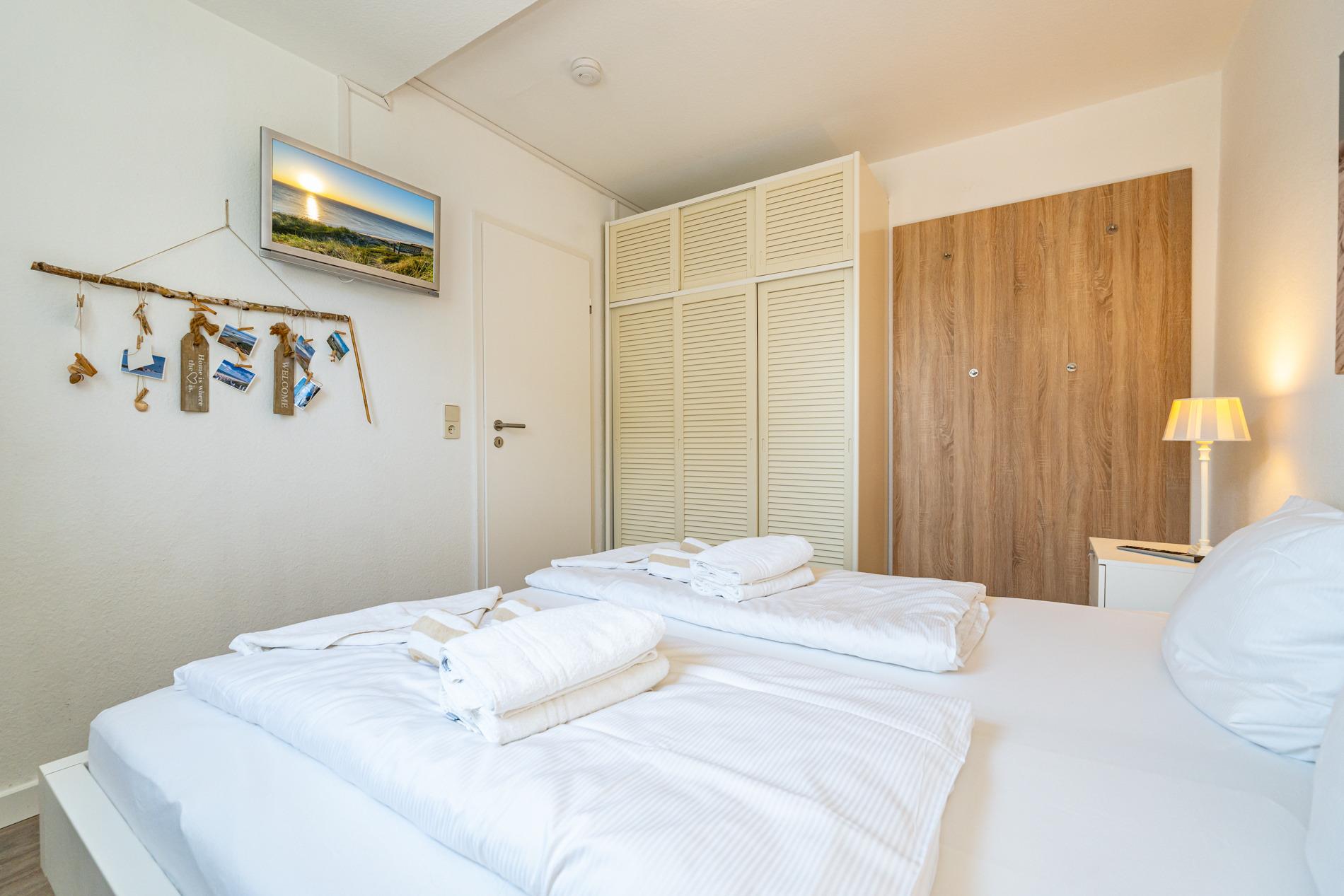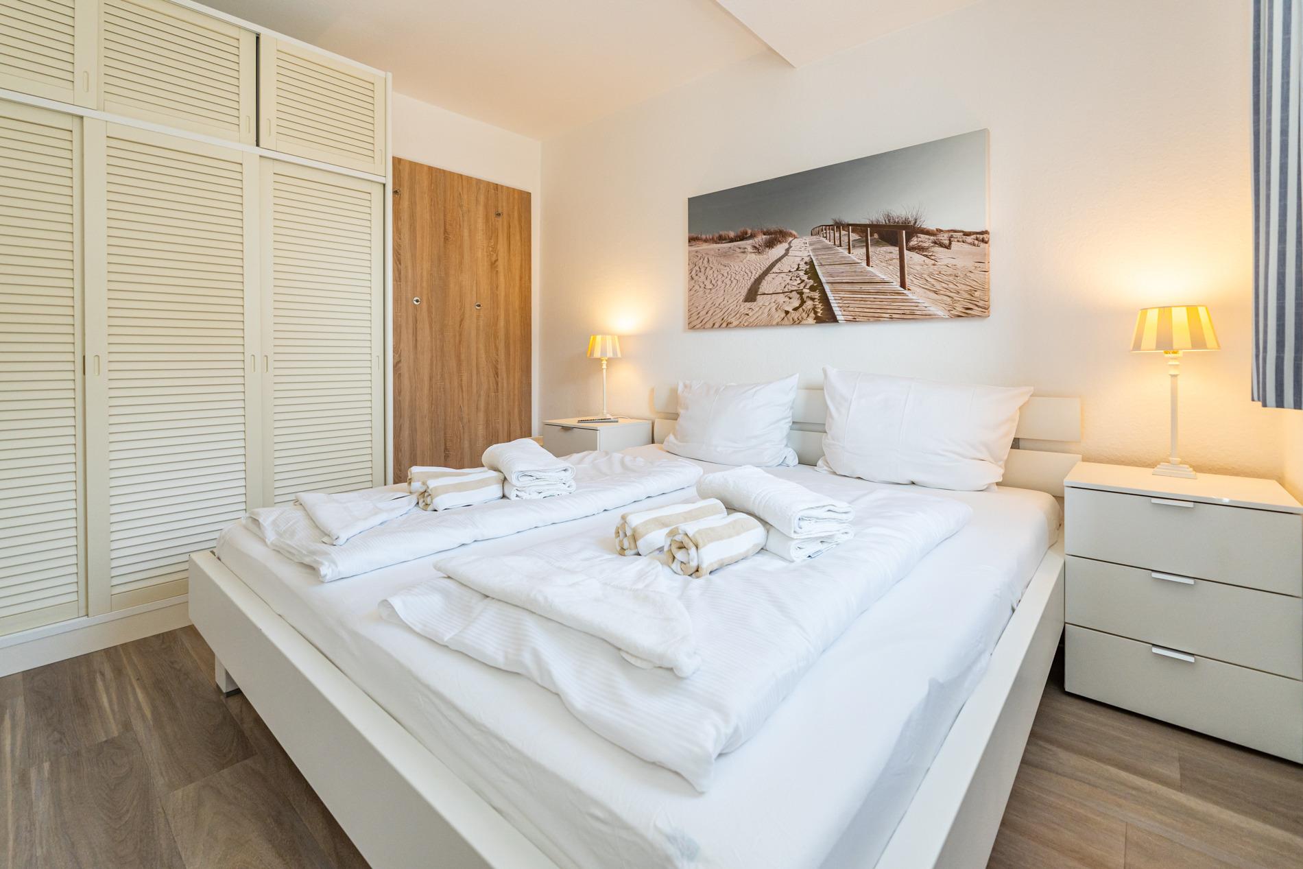 Das vom Wohnzimmer begehbare Schlafzimmer hat ein gutes Doppelbett mit zwei Einzelmatratzen (0,90 x 2,00 m), einen Kleiderschrank und zwei Nachttische.