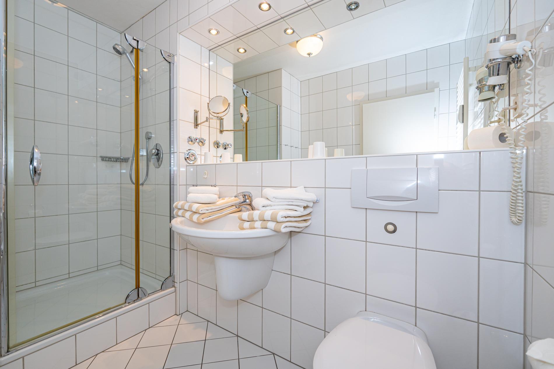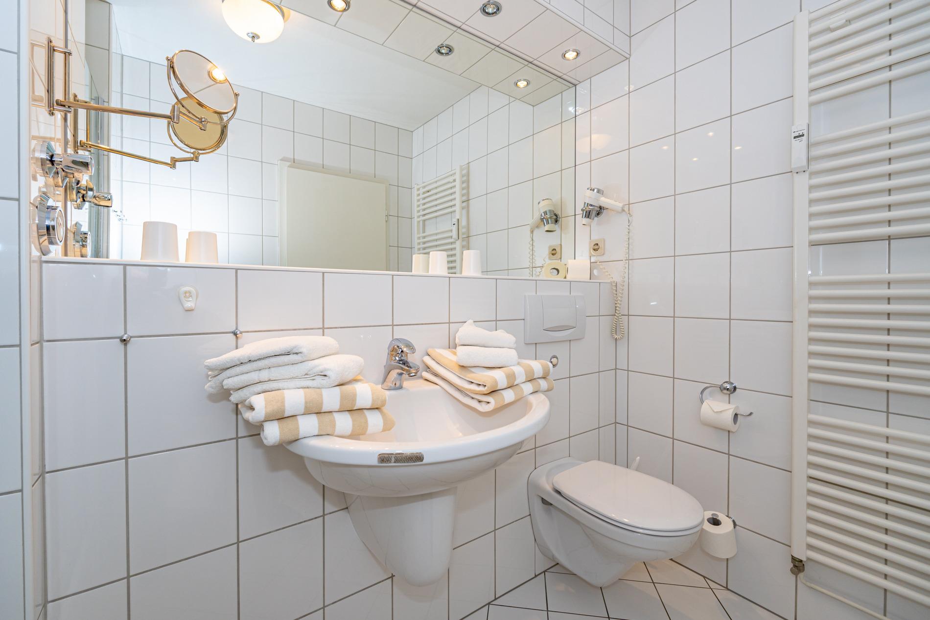Das moderne Duschbad/WC hat einen Waschtisch, einen Handtuchtrockner und eine Personenwaage.