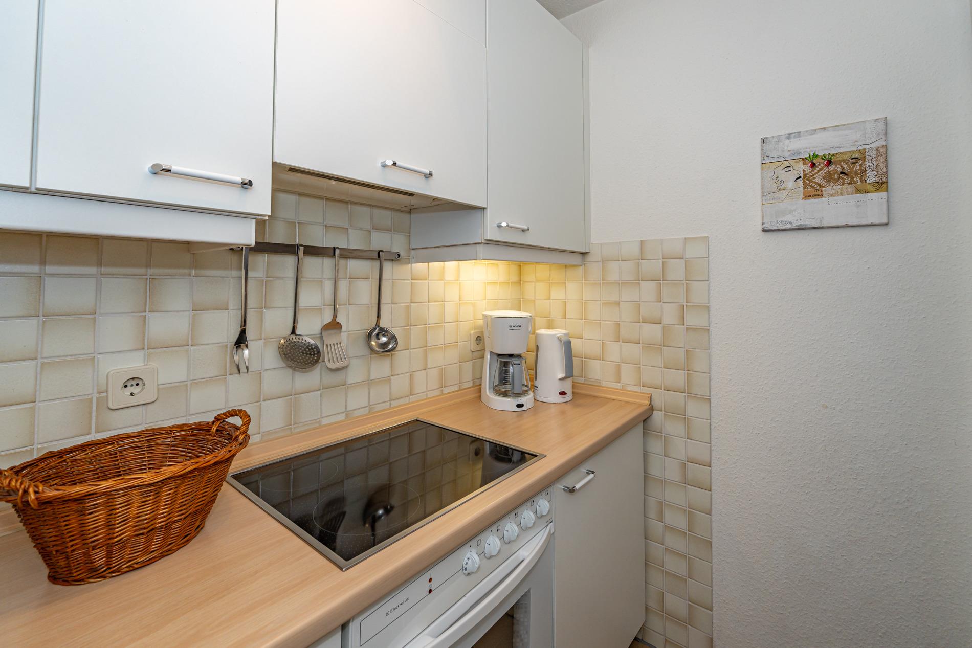Die Küche hat einen Backofen, einen 4-Platten-Herd und einen Kühlschrank mit 3-Sterne-Gefrierfach.