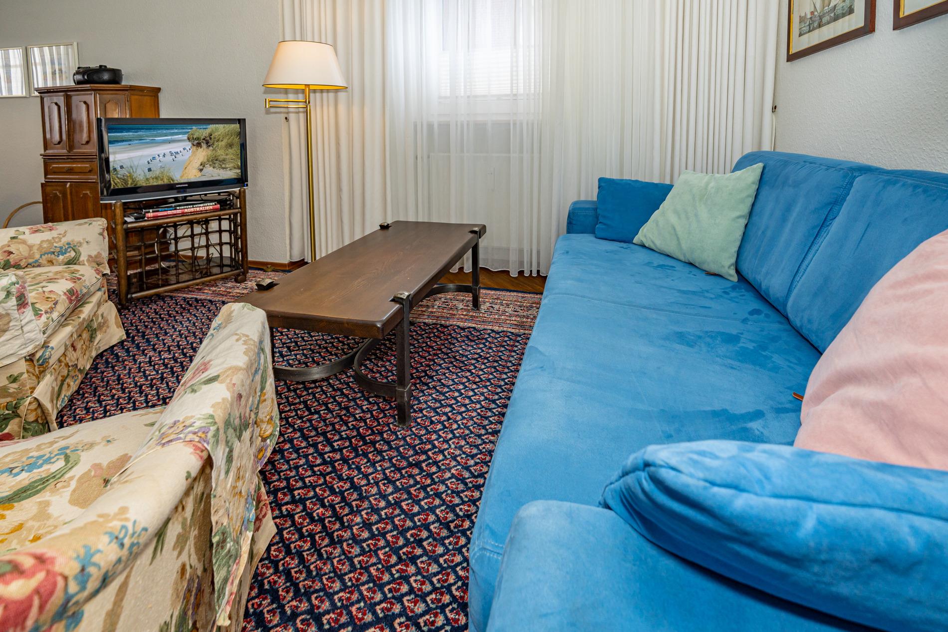 Der Wohnraum besteht aus einer gemütlichen Sitzgarnitur (2-Sitzer-Doppelschlafcouch und 2 Sessel), einem Essplatz, Kabel-Flachbild-TV, Radio/CD und einer offenen Küche.