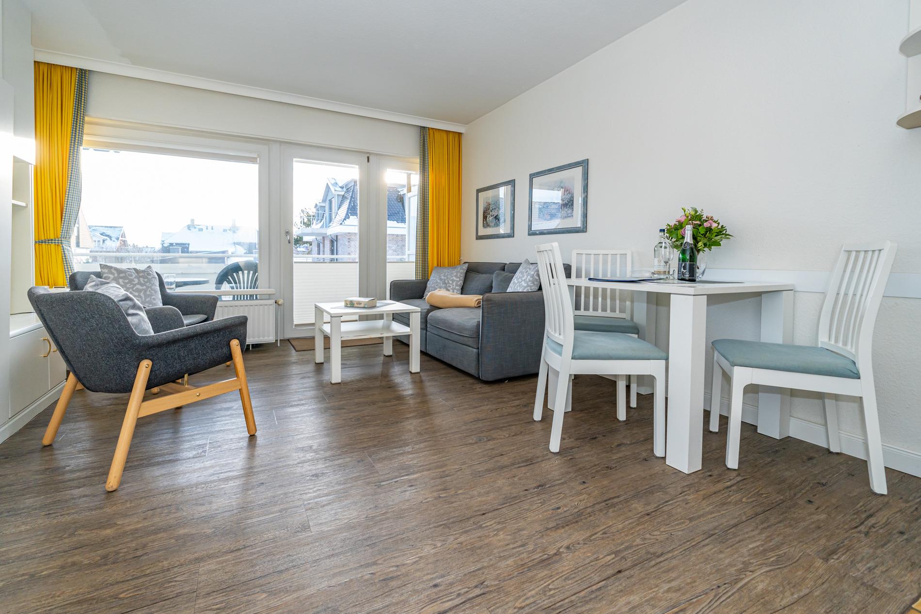 2-Zimmer-Nichtraucher-Ferienwohnung ca. 48 qm in der 1. Etage zur Südseite mit Südbalkon (mit Balkonmöbeln und Auflagen) für max. 4 Personen.