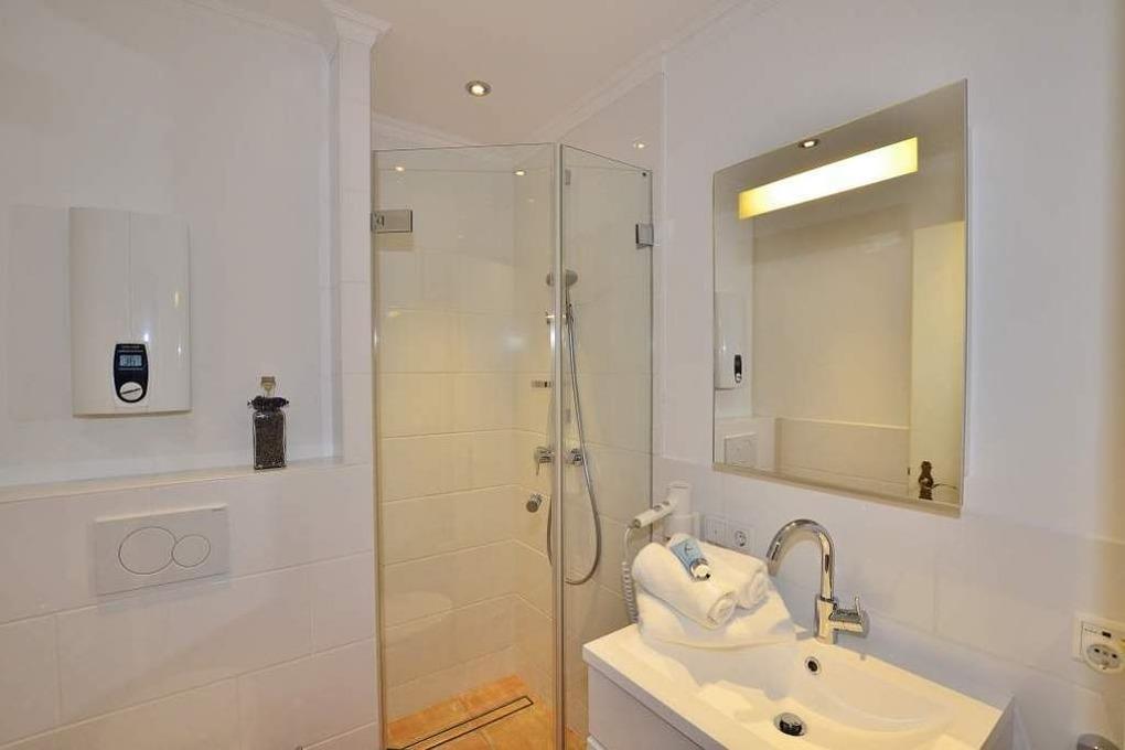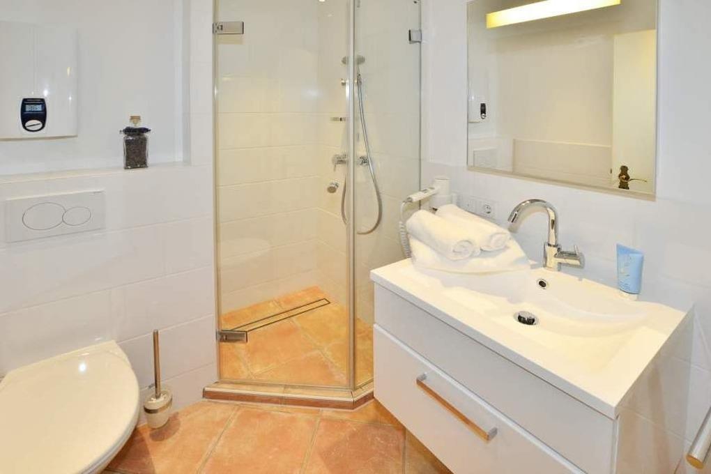 Im Bad befinden sich eine Dusche, ein WC und ein Waschtisch.