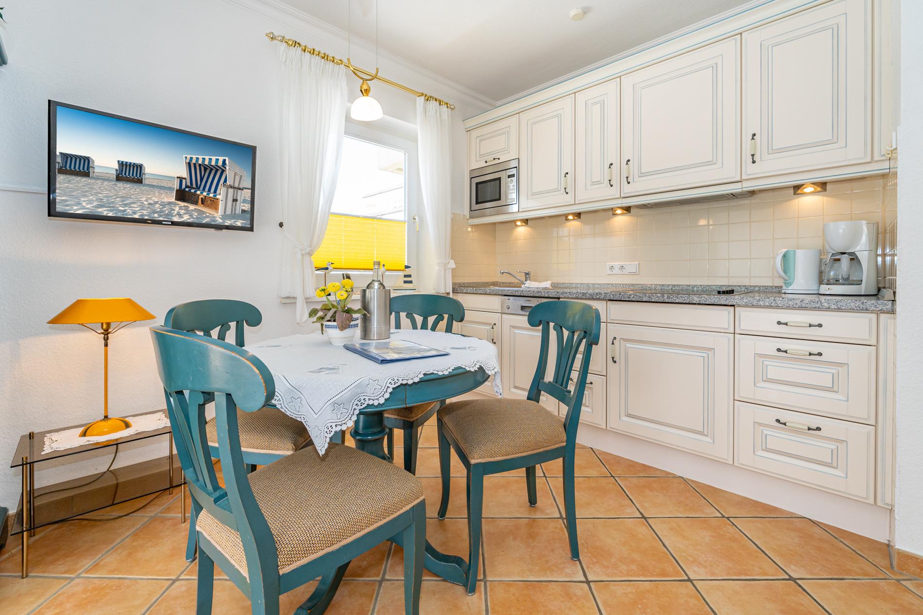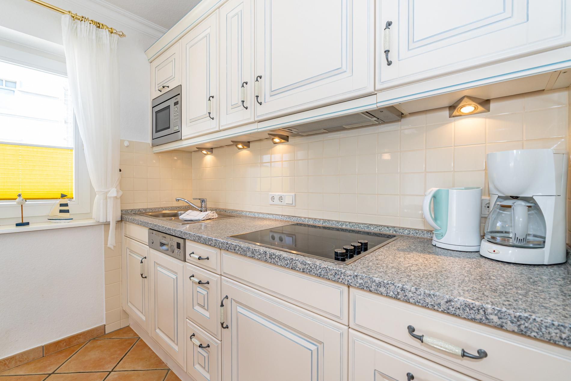 Die Küchenzeile hat einen Geschirrspüler, eine Mikrowelle, ein Ceranfeld und einen Kühlschrank mit 3*-Gefrierfach. Kaffeemaschine, Wasserkocher und Toaster gehören zur Grundausstattung.