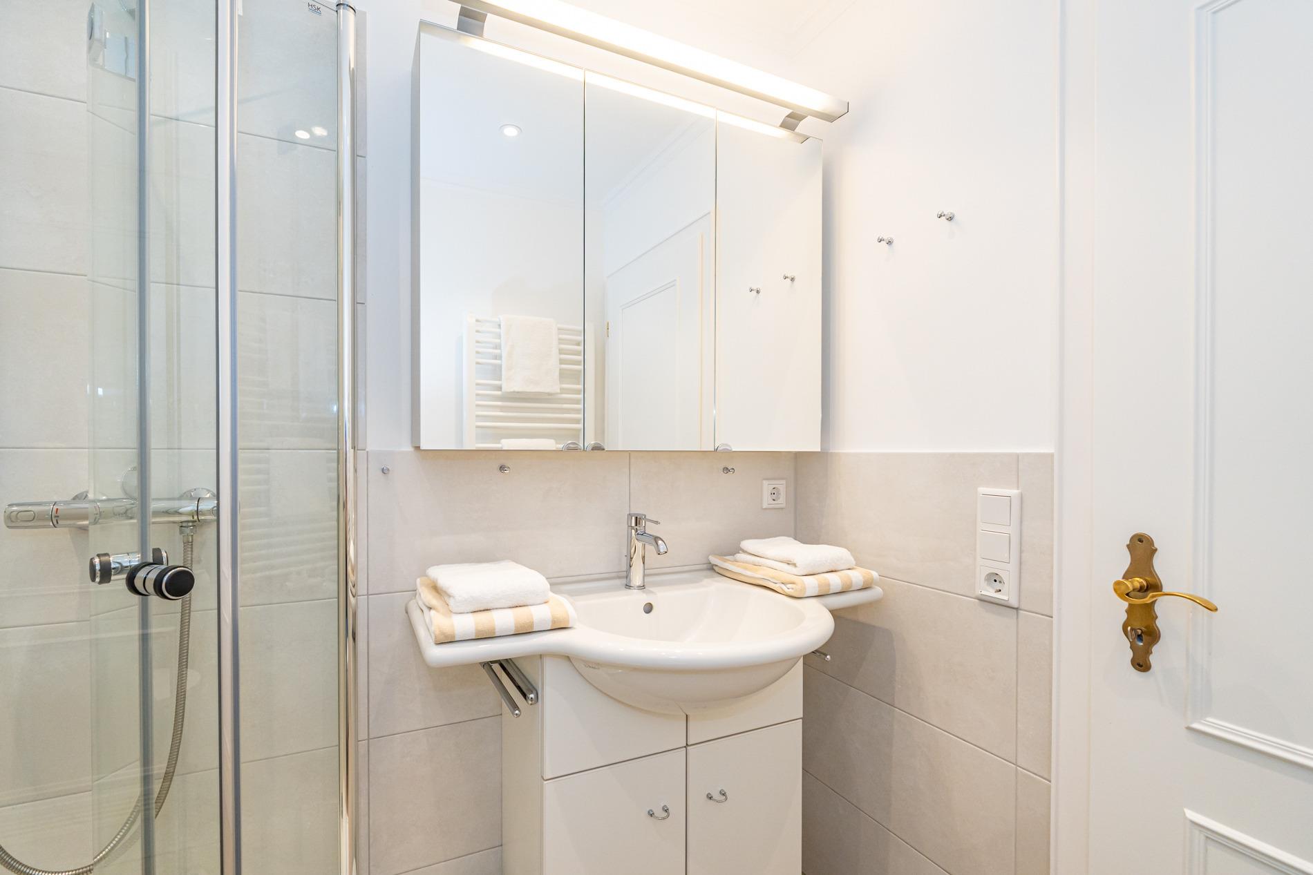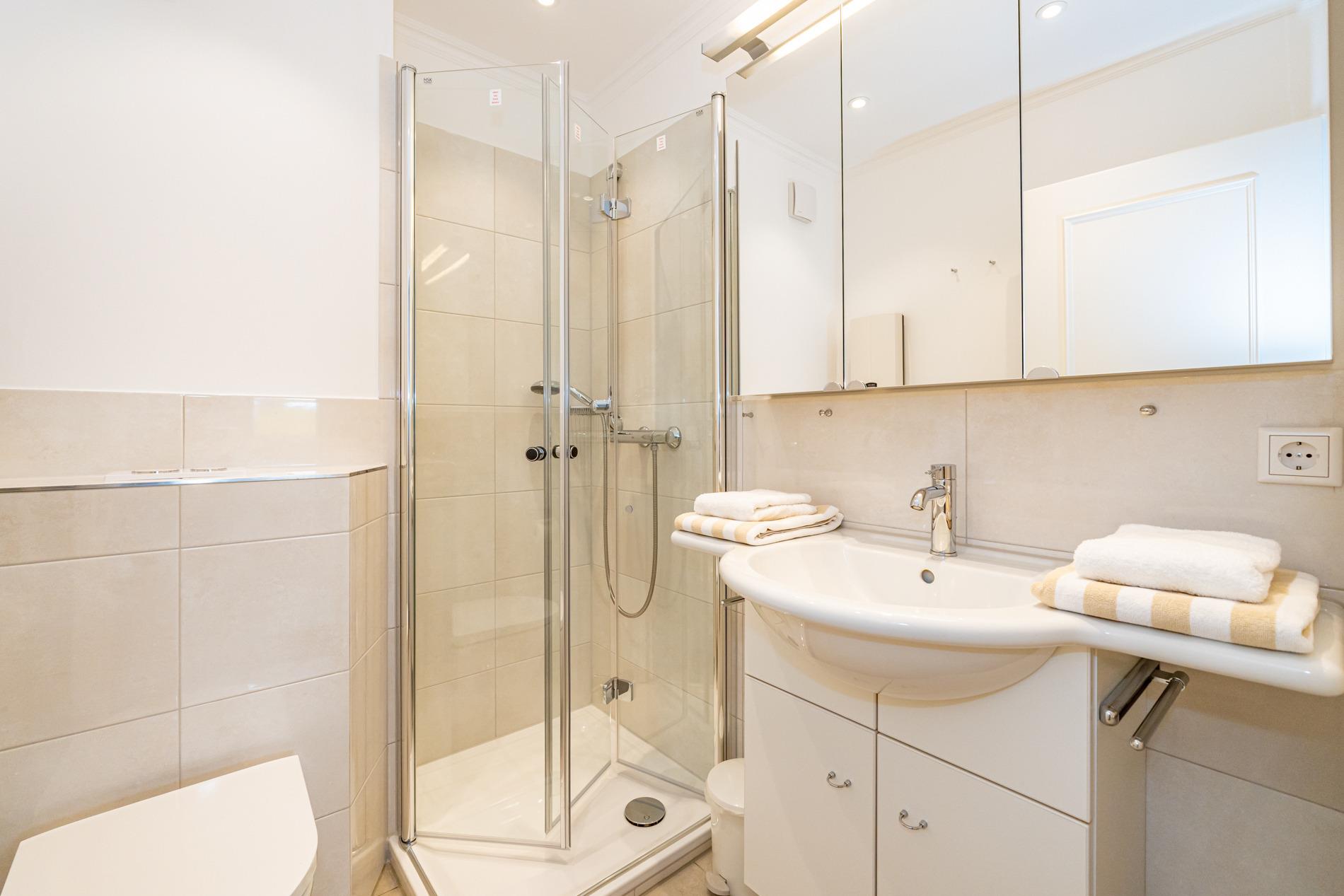 Das Badezimmer ist mit einer Dusche, einem Waschtisch und einem WC ausgestattet.