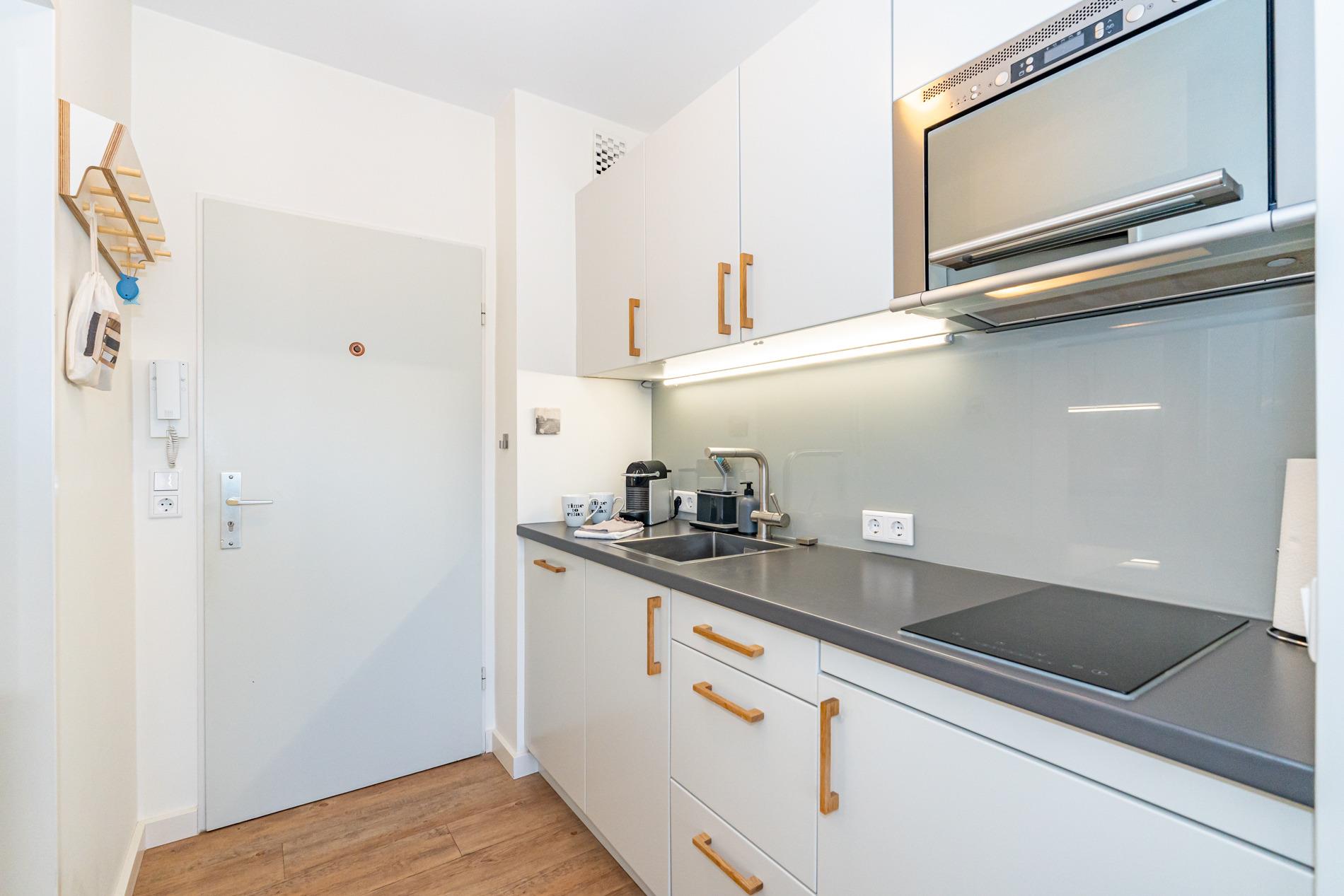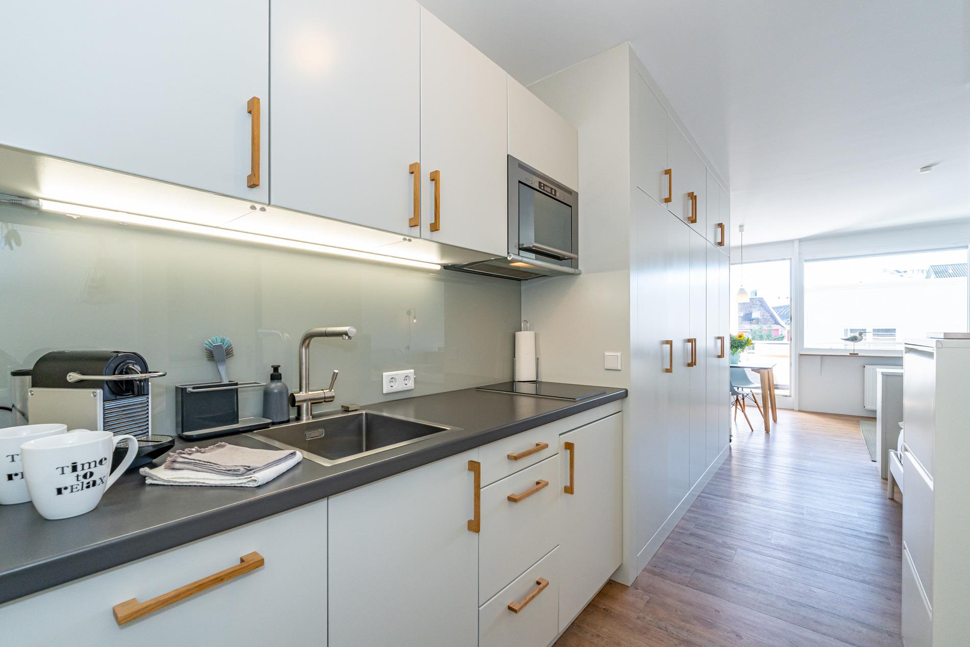 Die moderne vollausgestattete Küchenzeile hat einen Geschirrspüler, ein Cerankochfeld mit 2 Feldern, eine Mikrowellen-Backofen-Kombination, einen Kühlschrank, eine Nespresso-Maschine. Kaffeemaschine, Wasserkocher und Toaster gehören zur Grundausstattung.