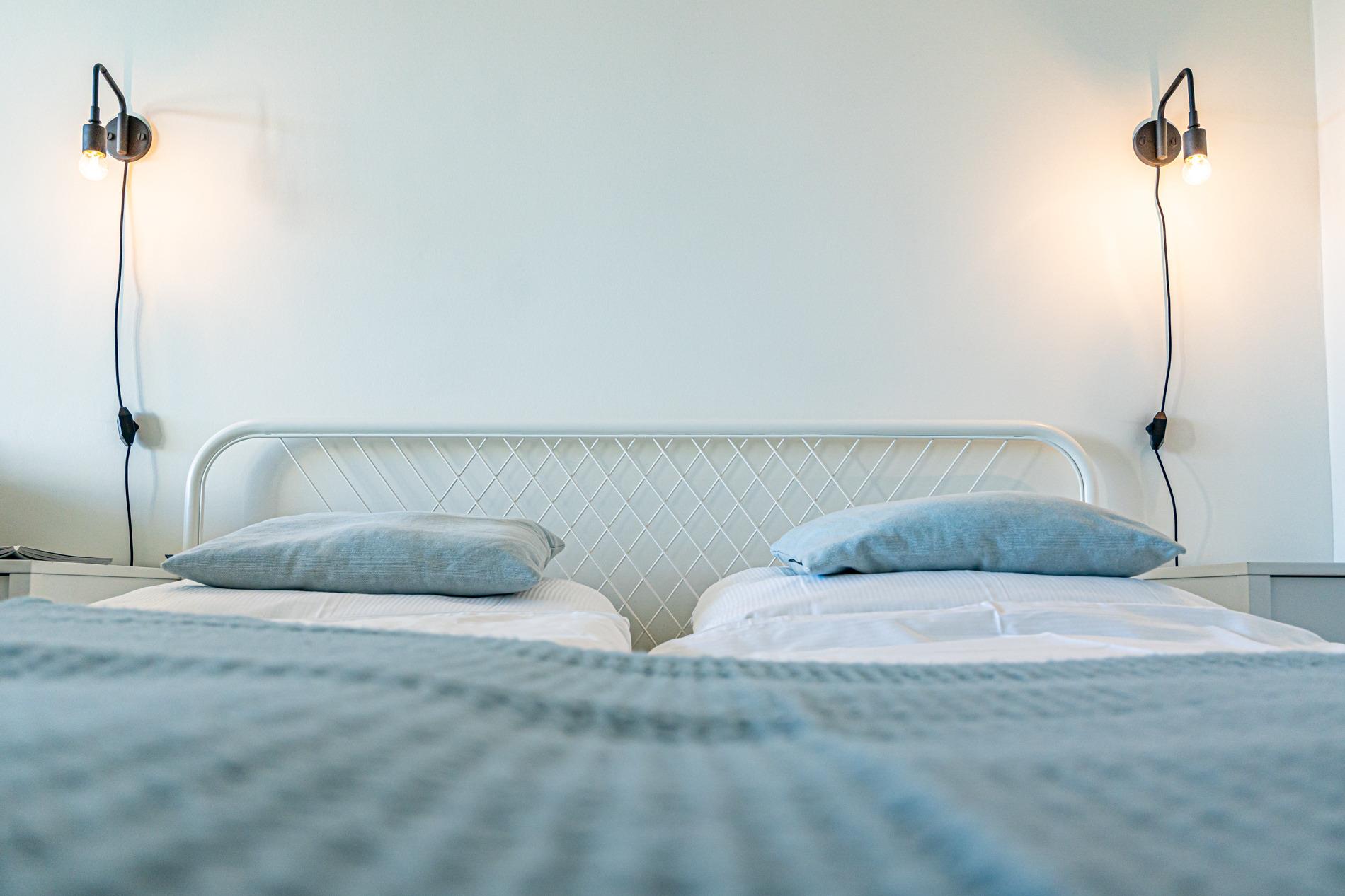 Der Wohn-/Schlafraum besteht aus einem feststehendem Doppelbett (Einzelmatratzen 0,80 x 2,00 m), einer 2-Sitzer-Couch, Flachbild-TV, Radio mit Bluetooth (zum Verbinden mit ipad oder iphone), WLAN, Telefonflatrate (ins Festnetz der Telekom) und einem elektrischen Rollladen für vollständige Verdunkelung.