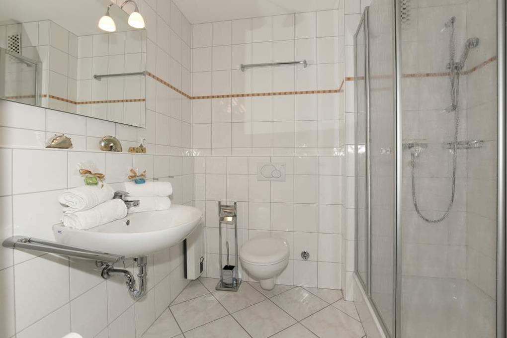 Im neuen Bad befinden sich eine Dusche, ein WC, ein Waschtisch, Kosmetikspiegel und ein Fön.