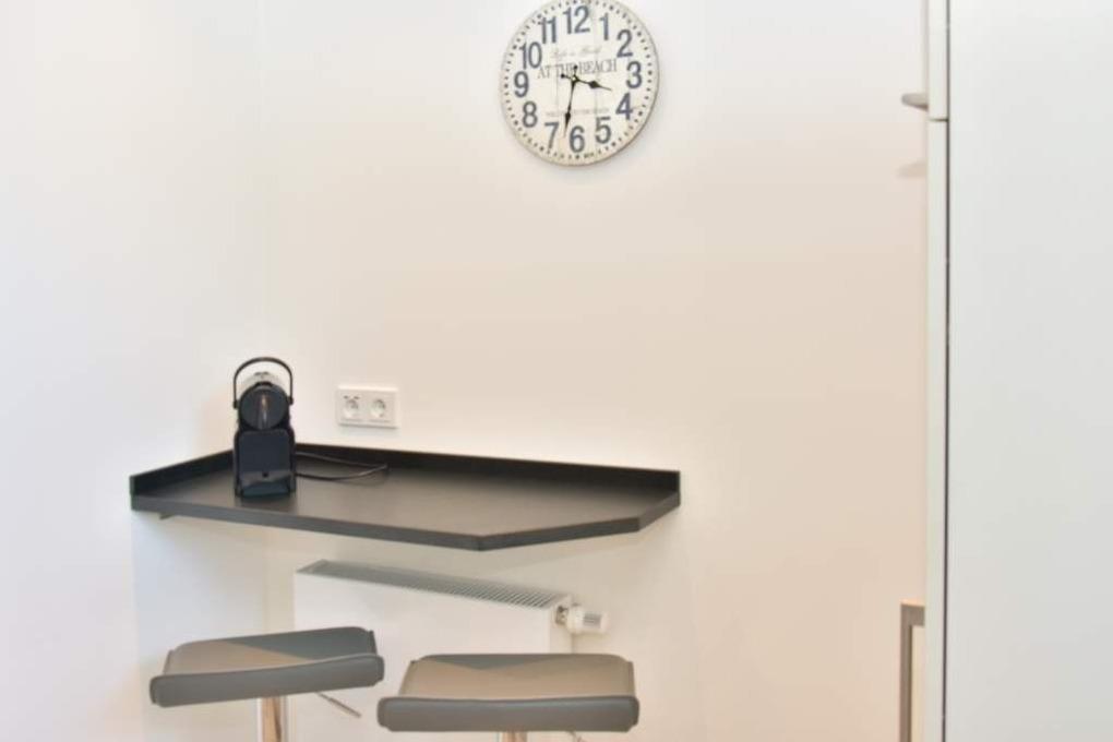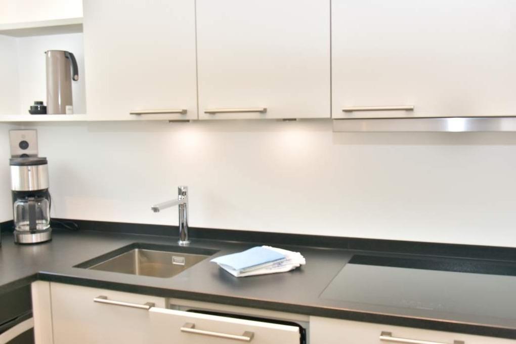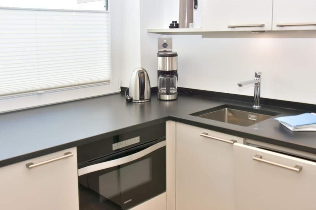 Die separate Küche hat einen Herd mit Backofen, 4-Platten-Ceranfeld, einen Kühlschrank, eine Waschmaschine und ein Fenster. Filter-Kaffeemaschine und Nespresso-Maschine, Wasserkocher und Toaster gehören zur Grundausstattung.