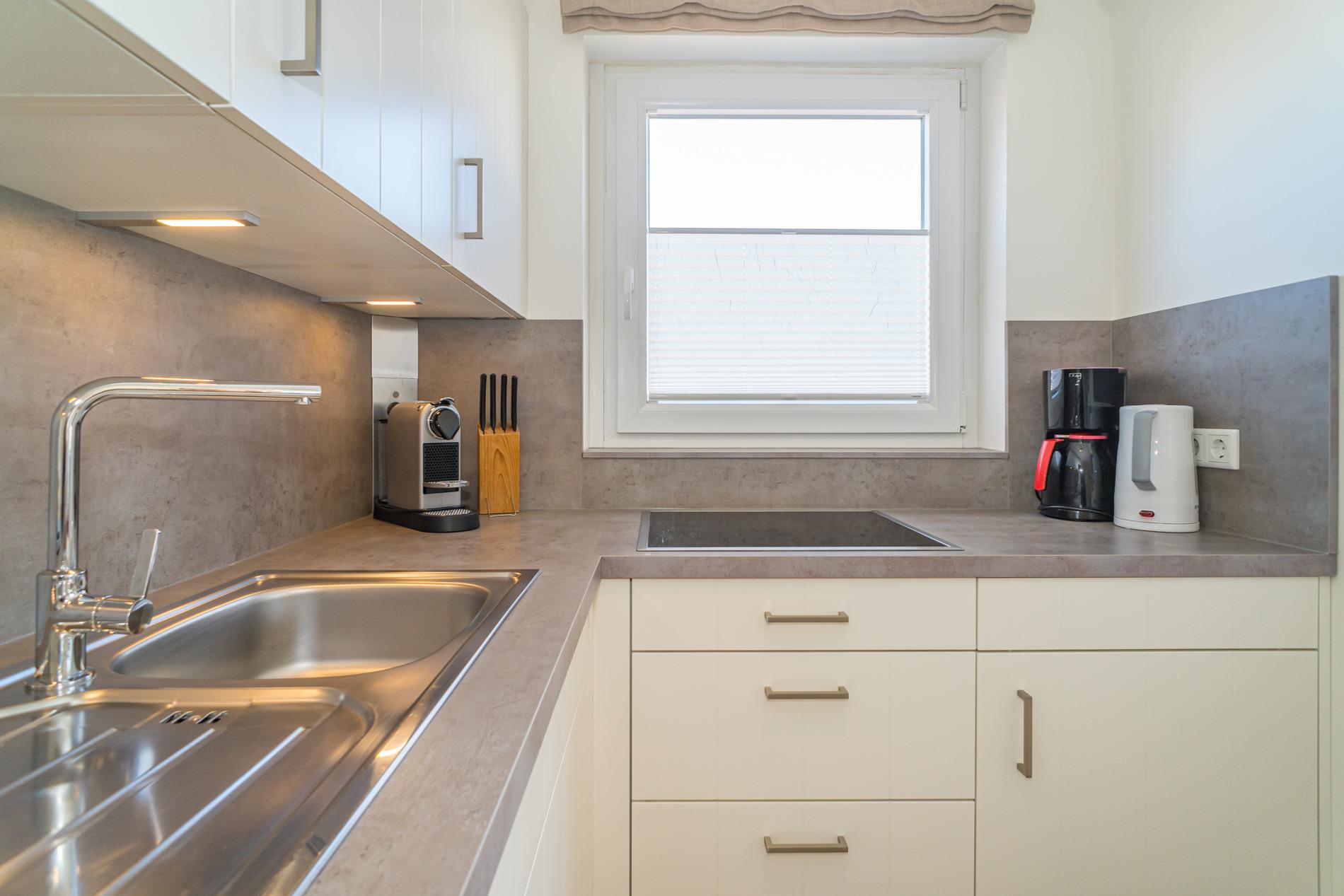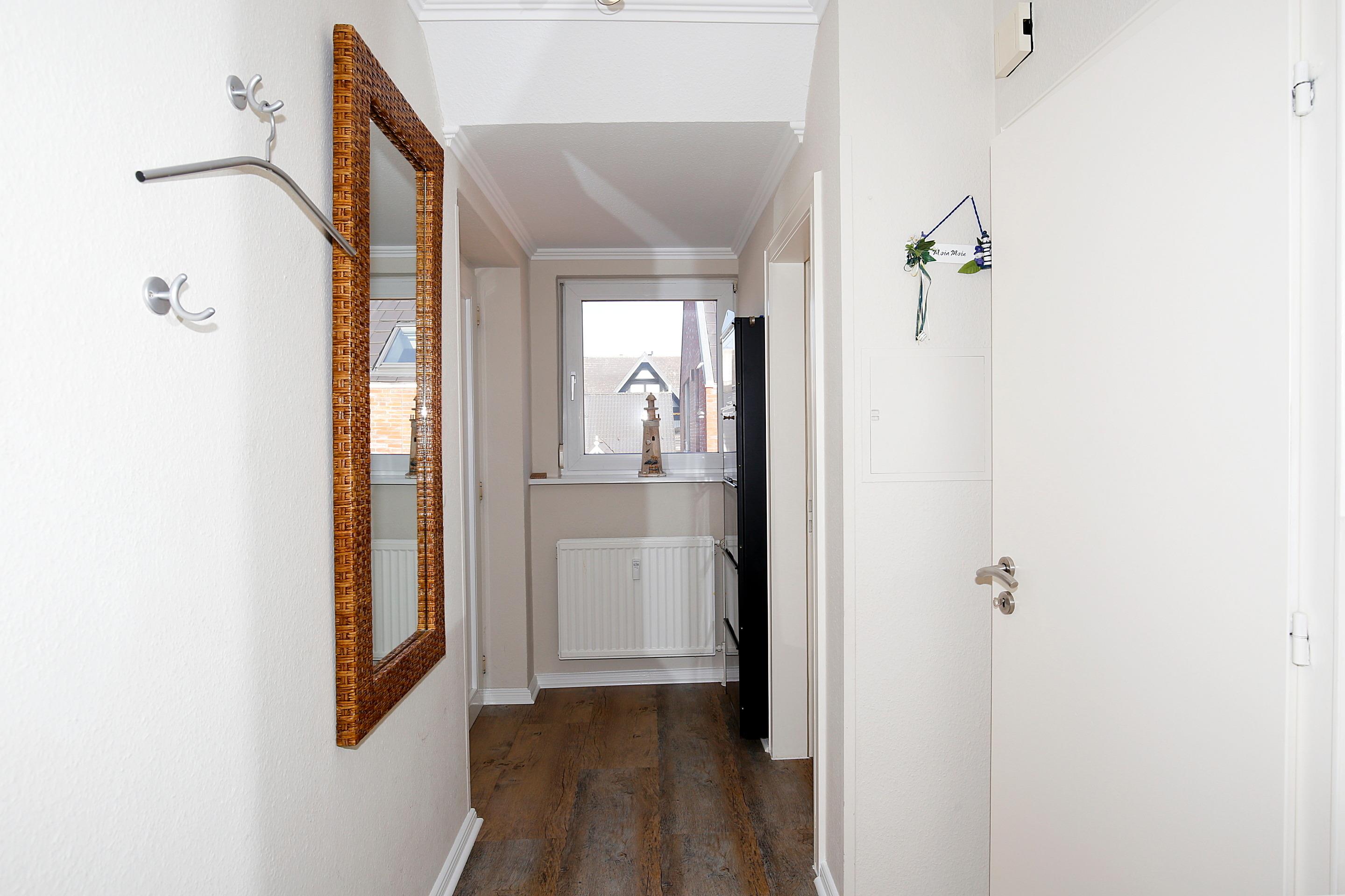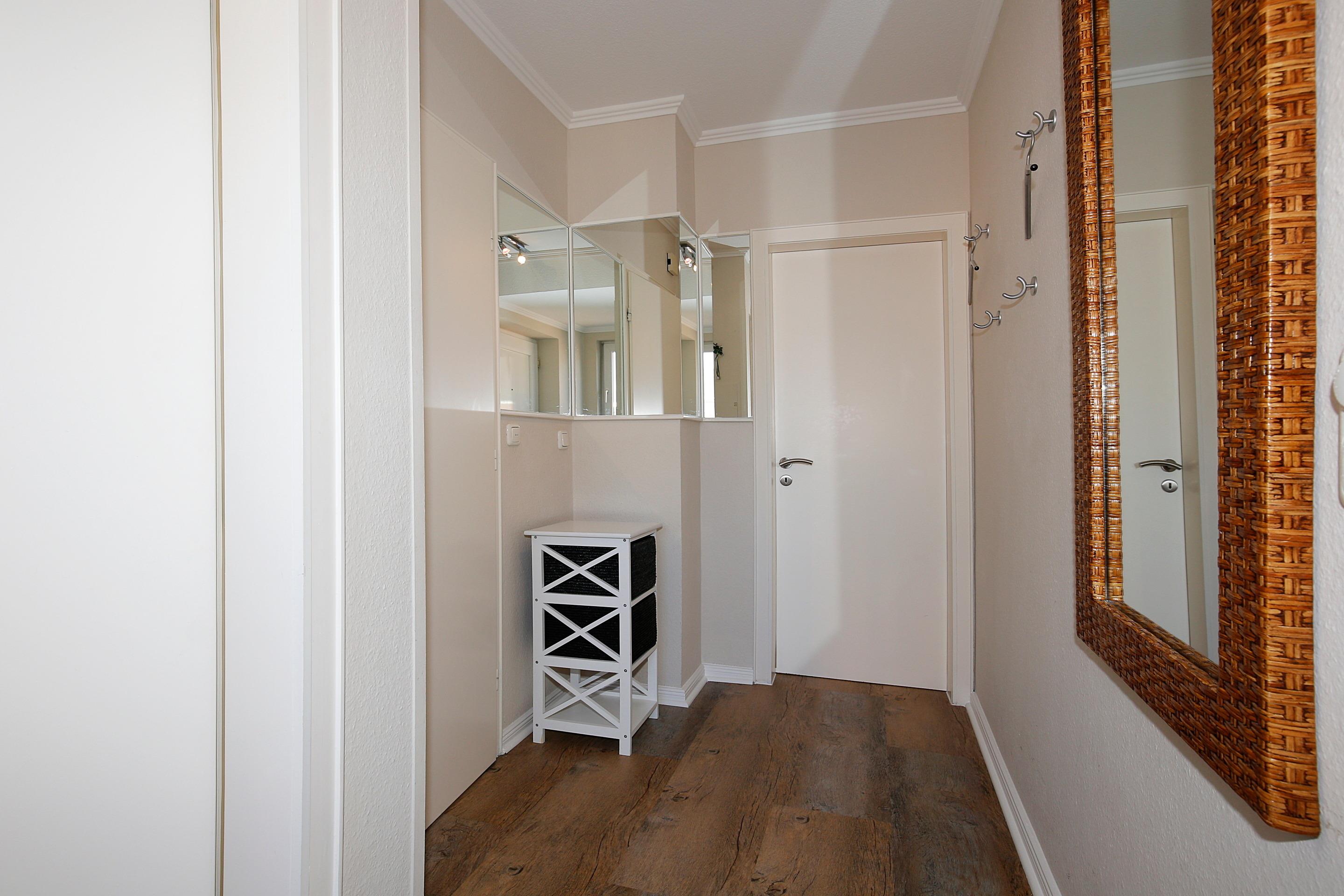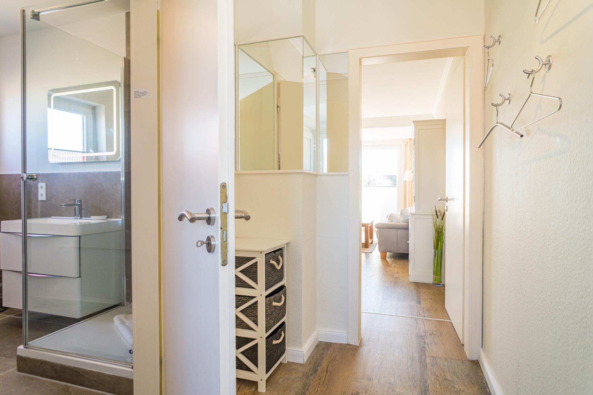 Beim Betreten der Wohnung gelangen Sie in den Flur, der direkt in das neu gestaltete Wohnzimmer führt. Hier finden Sie eine offene Küchenzeile mit moderner Ausstattung, darunter ein Geschirrspüler, eine Mikrowellen-Backofen-Kombination, eine Kaffeemaschine, ein Espressovollautomat und ein Toaster. Vom Wohnzimmer aus haben Sie Zugang zum sonnigen Süd-Balkon, perfekt für entspannte Stunden im Freien. Auf dieser Ebene befindet sich zudem ein Schlafzimmer mit einem gemütlichen Doppelbett (ca. 1,40 x 1,90 m) sowie ein Duschbad/WC. Für Unterhaltung sorgen Kabel-TV, Radio/CD und ein Telefon mit kostenlosem Wireless-LAN mit DSL-Anschluss. Das weitere Schlafzimmer hat ein großzügiges Doppelbett und reichlich Schrankraum für Ihre Garderobe.