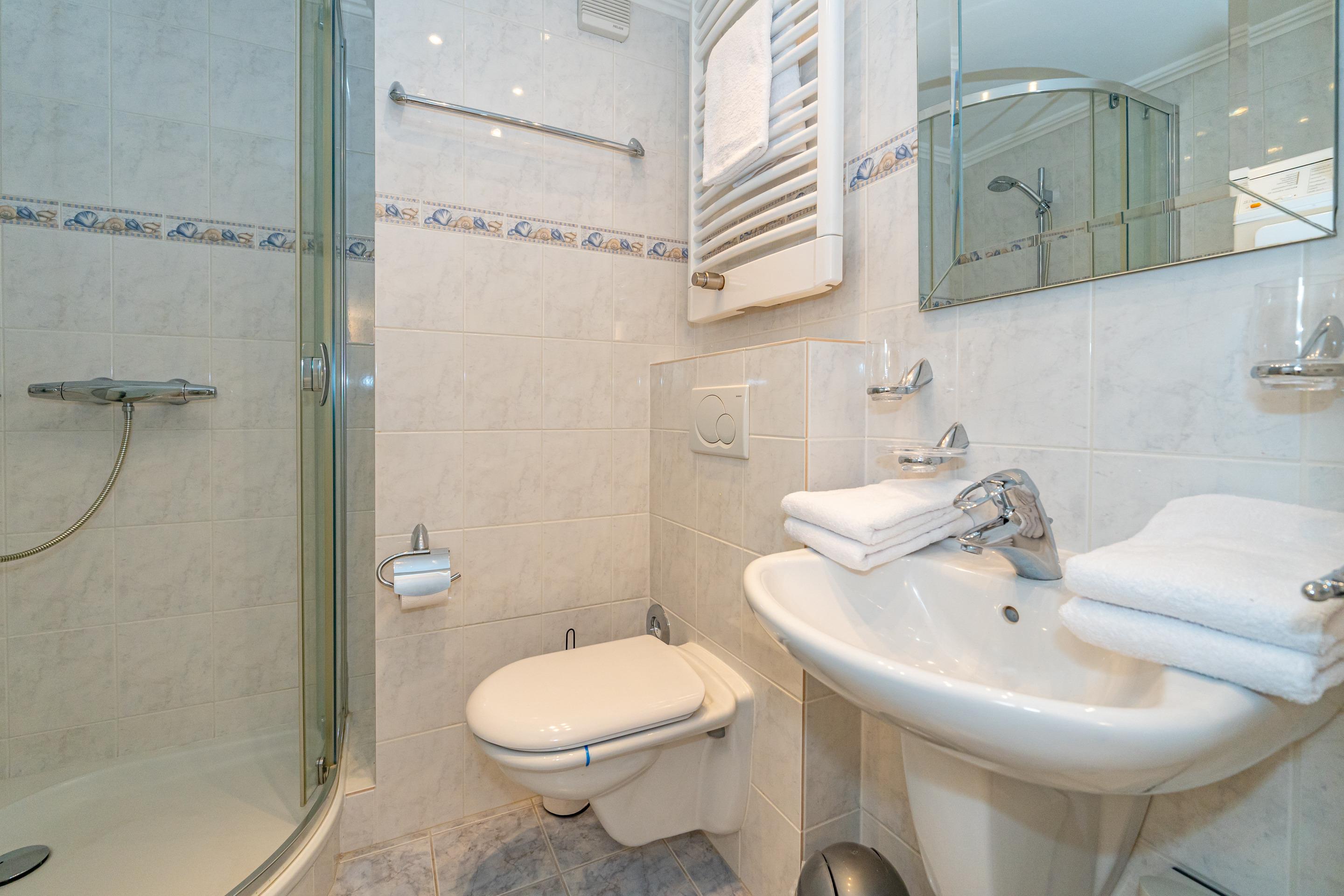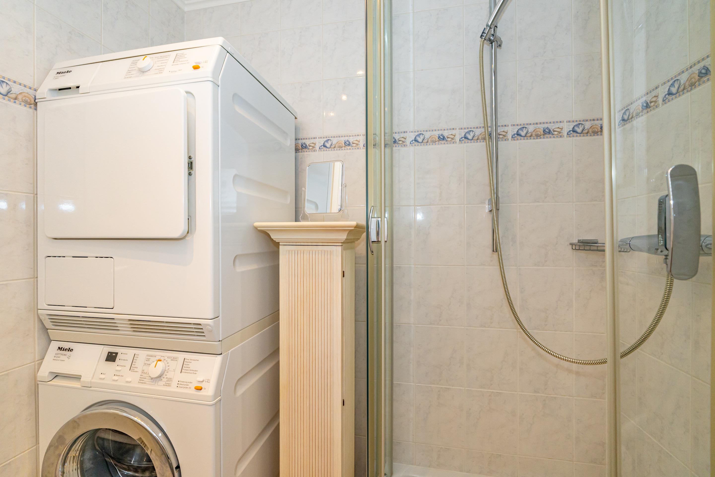 Im Bad befinden sich eine Dusche, ein WC, ein Waschtisch, ein Handtuchtrockner sowie Waschmaschine und Trockner.