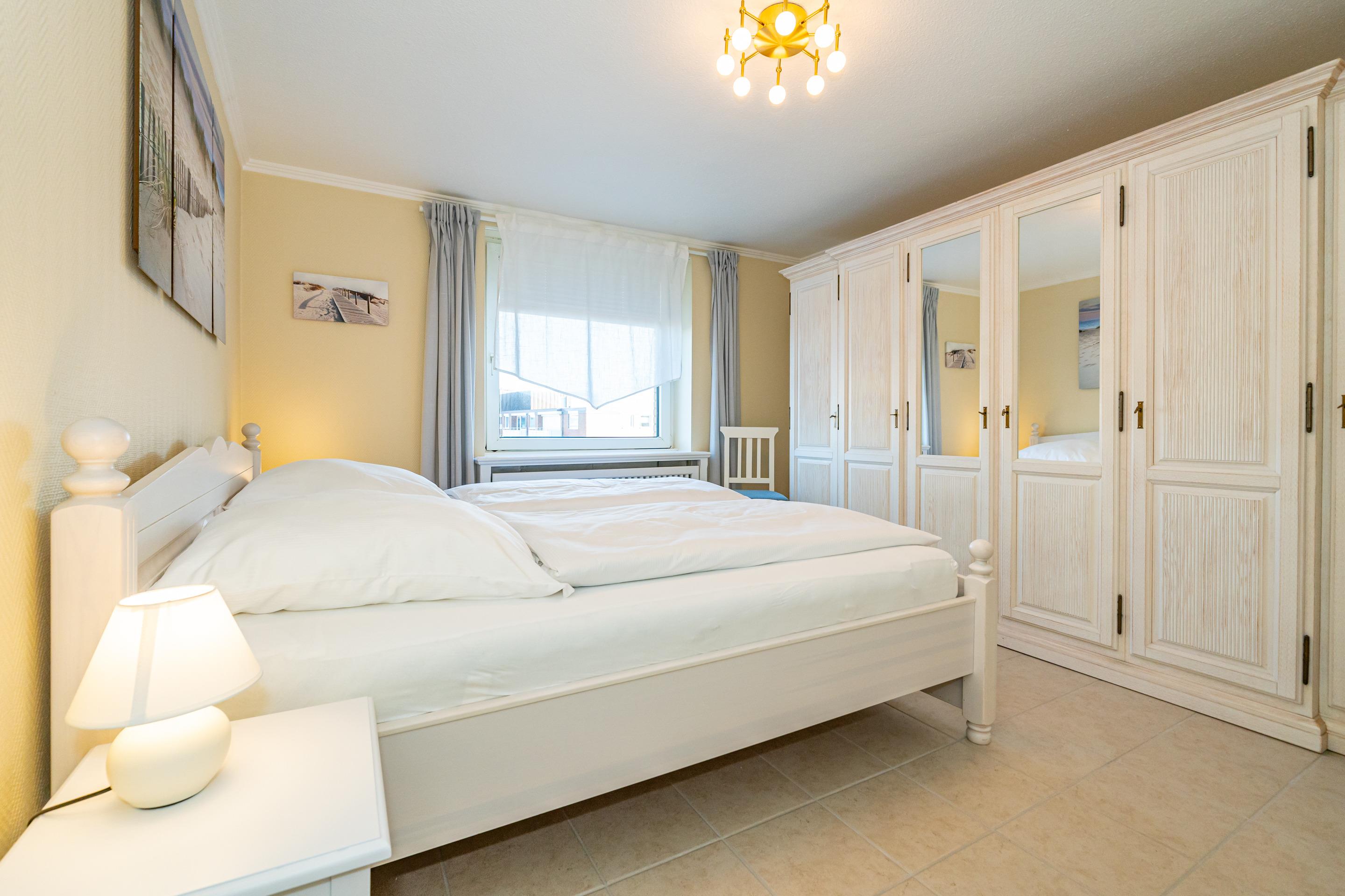 Das Schlafzimmer besitzt ein gutes Doppelbett in Übergröße (Liegefläche 2,00 x 2,00 m, Einzelmatratzen) und Kleiderschrank.