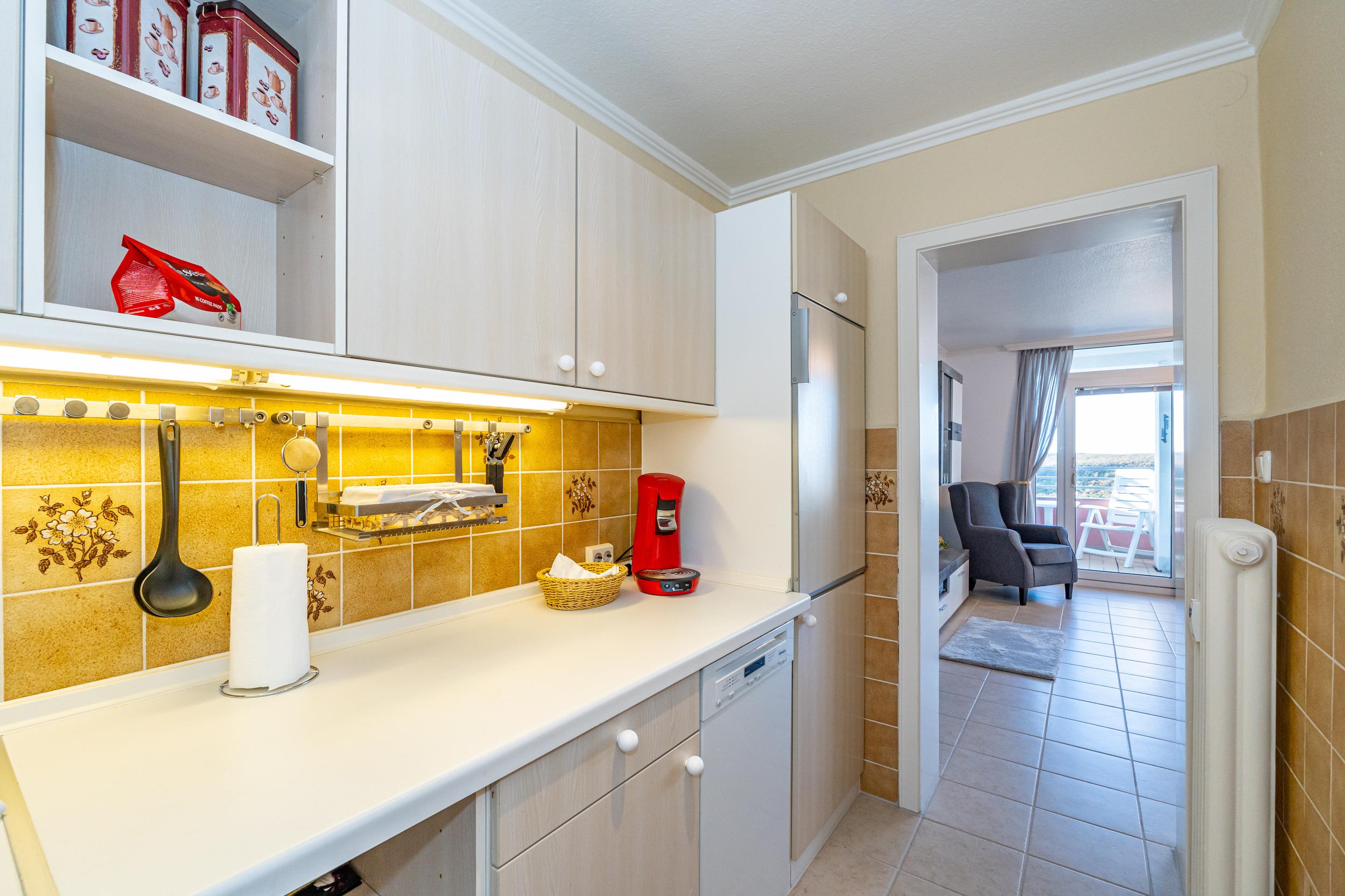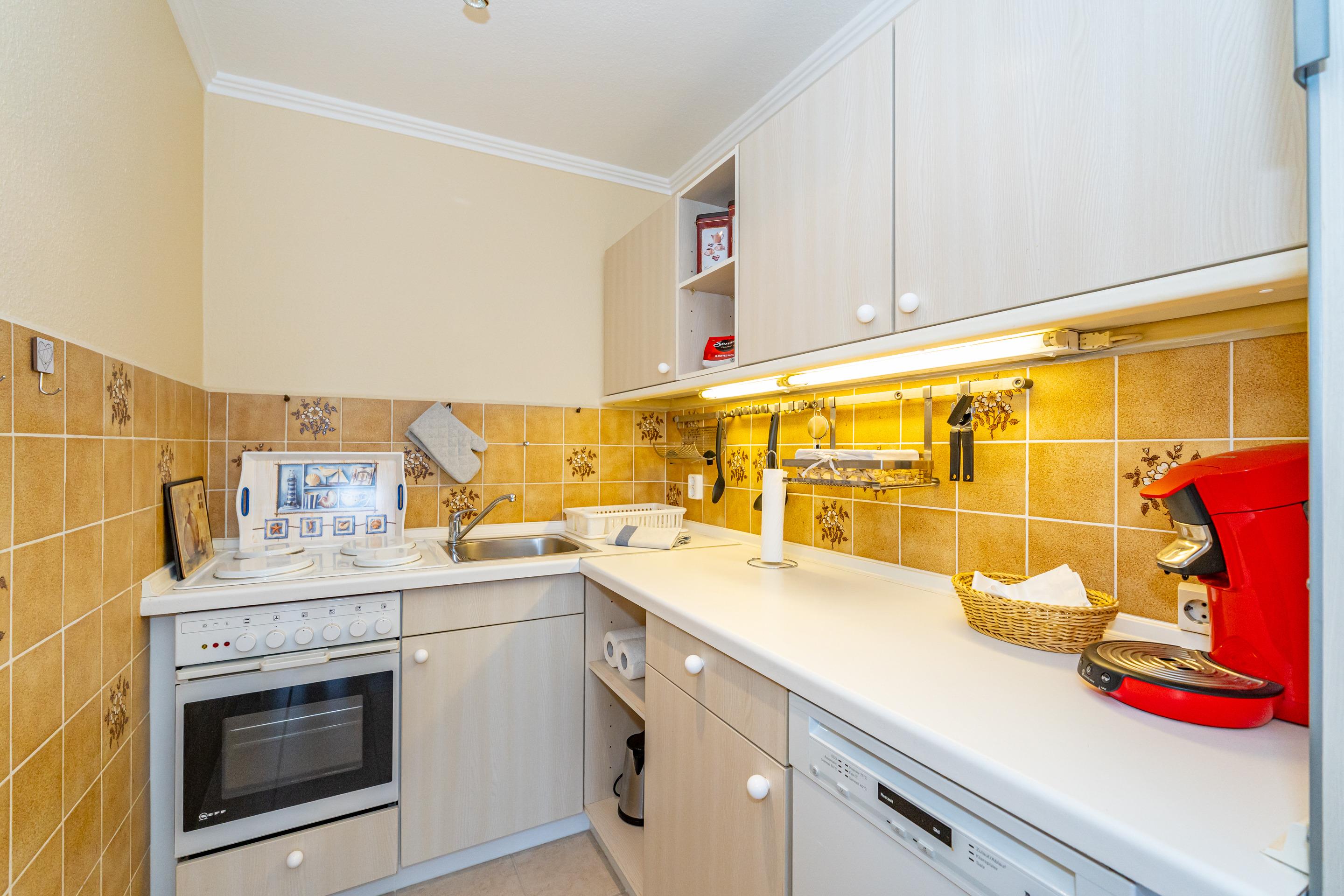 Die Küche ist mit einem Geschirrspüler, einem Herd mit Backofen und 4 Kochfeldern, Mikrowelle und einem Kühlschrank (ohne Gefrierfach) ausgestattet. Kaffeemaschine, Wasserkocher und Toaster gehören zur Grundausstattung.