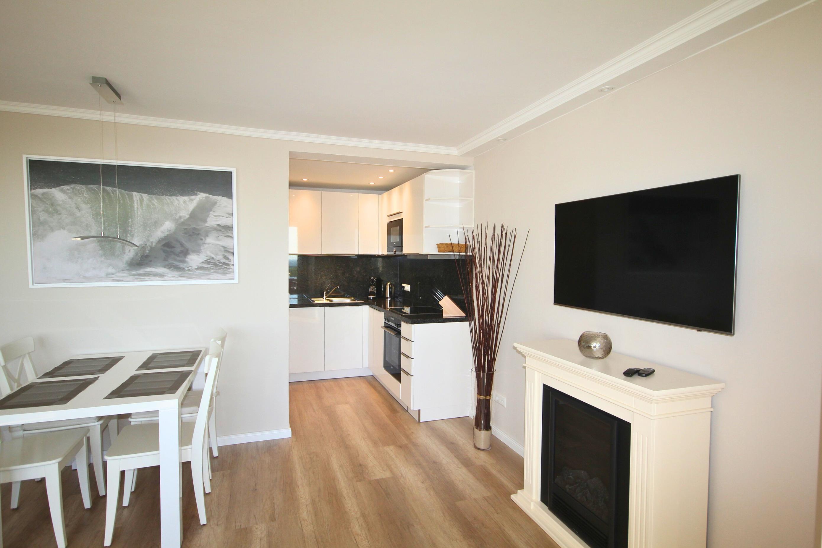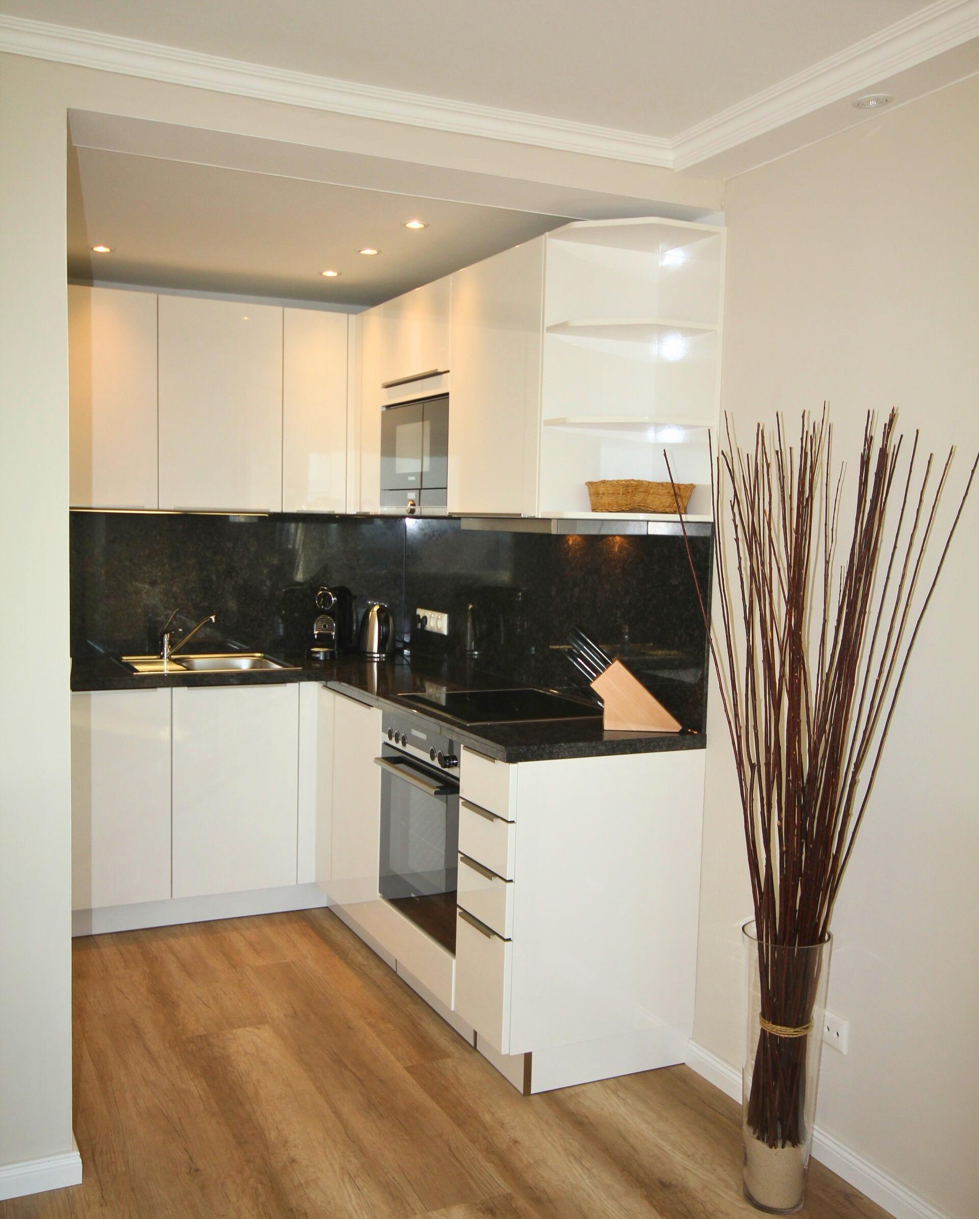 Die zum Wohnraum offene Küche mit Granitarbeitsplatte hat einen Geschirrspüler, Backofen, Mikrowelle, Ceranfeld (4 Felder), Kühlschrank mit 3-Sterne-Gefrierfach und eine Nespresso-Maschine. Kaffeemaschine, Wasserkocher und Toaster gehören zur Grundausstattung.