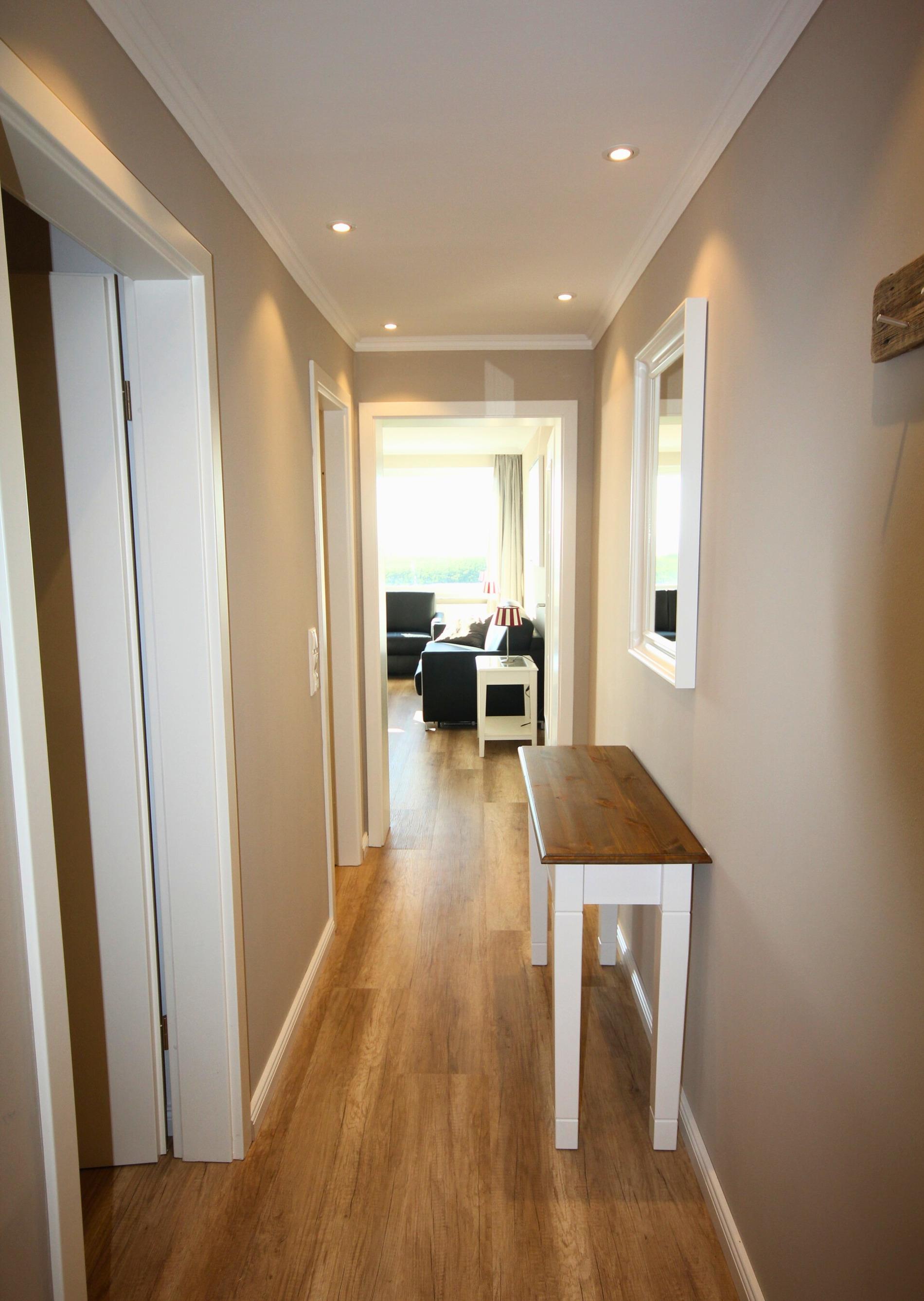 Vom Vorflur mit Garderobe gelangt man in das Wohnzimmer (mit Austritt zum Balkon), das neue Schlafzimmer und das neue Duschbad/WC.