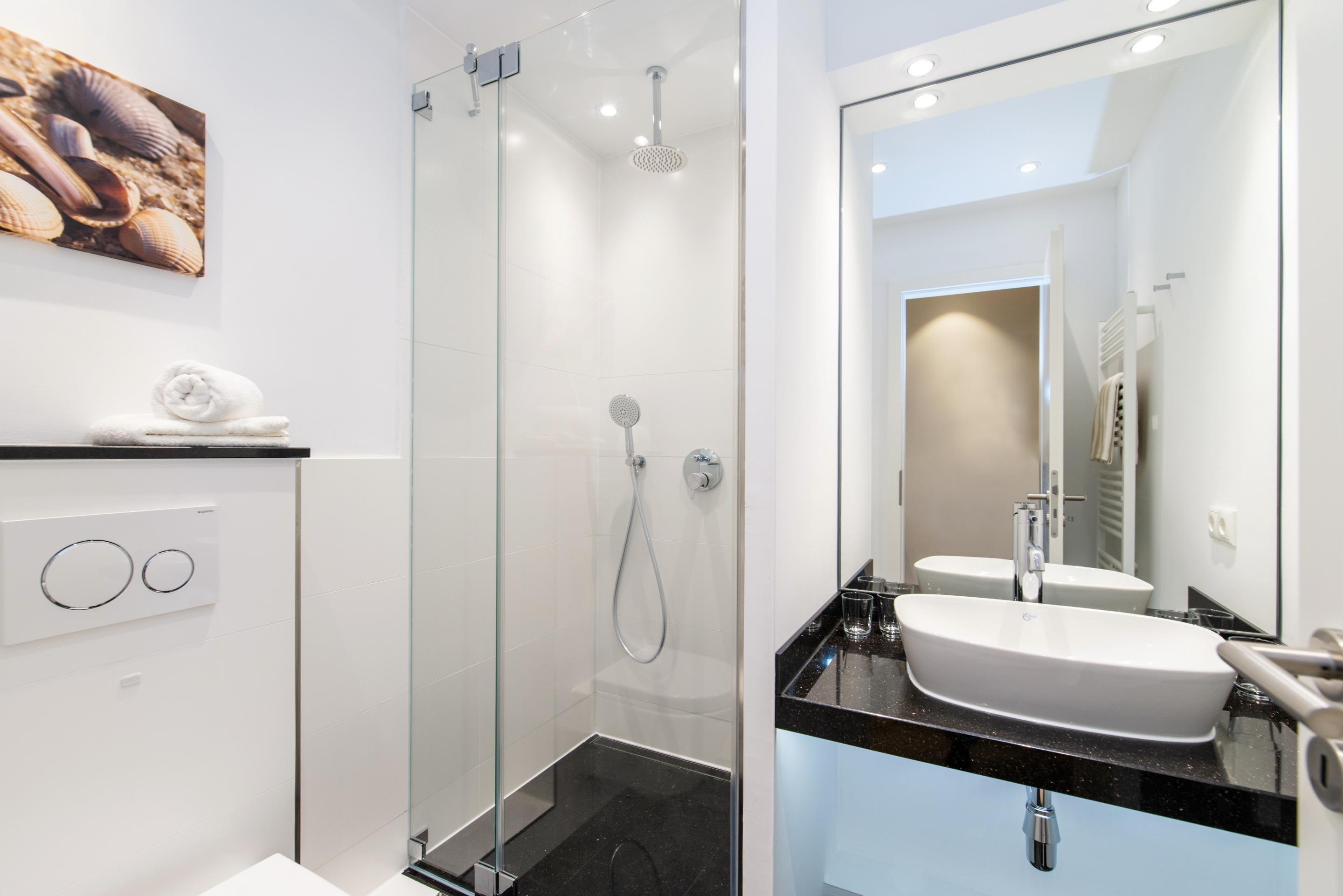 Das neue Bad bietet eine Dusche mit flachem Einstieg, einen Waschtisch und einen Handtuchtrockner.