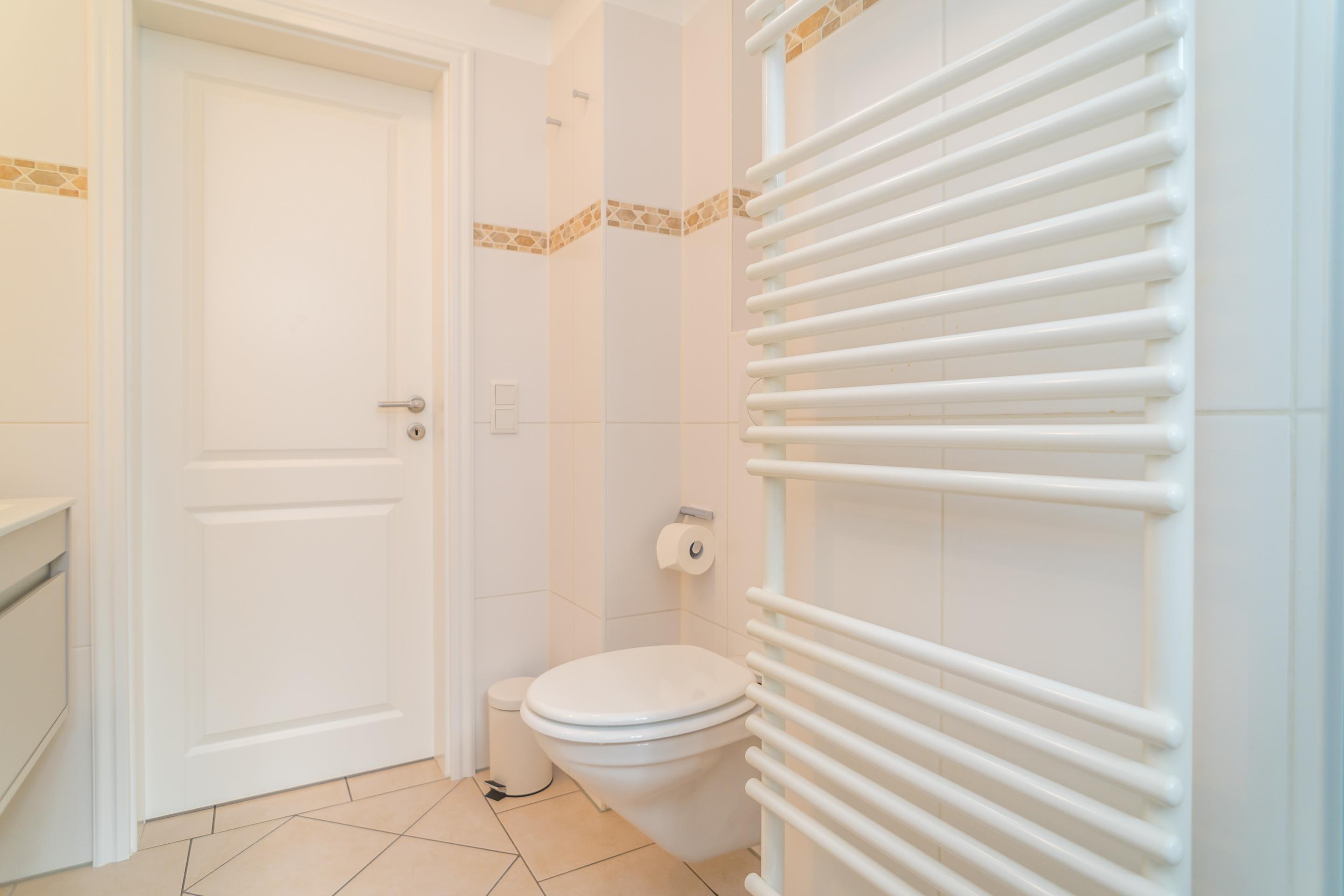 Das Badezimmer ist mit Dusche (mit bodengleichem Einstieg), Waschtisch, Handtuchtrockner, Föhn, WC und Fenster ausgestattet.
