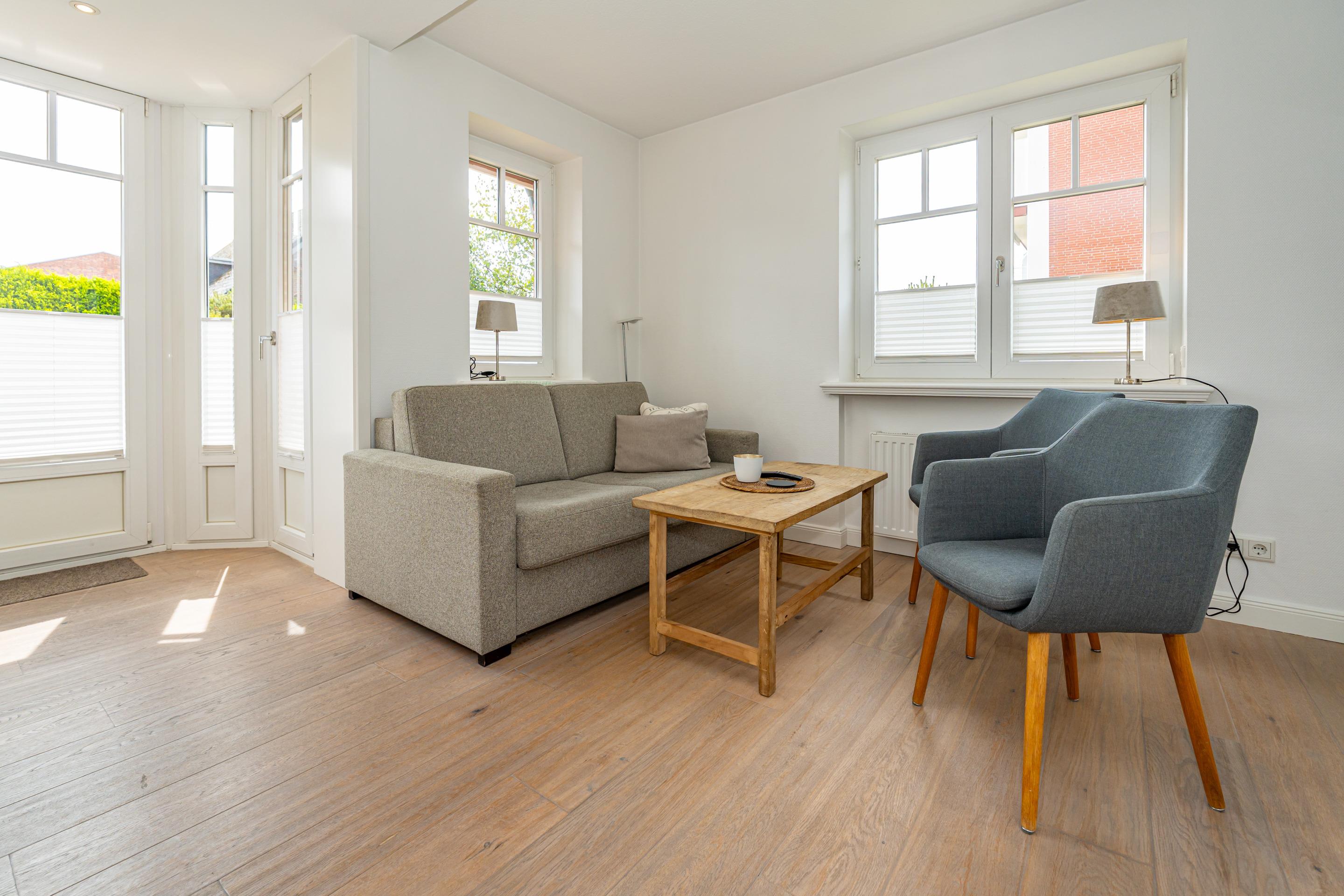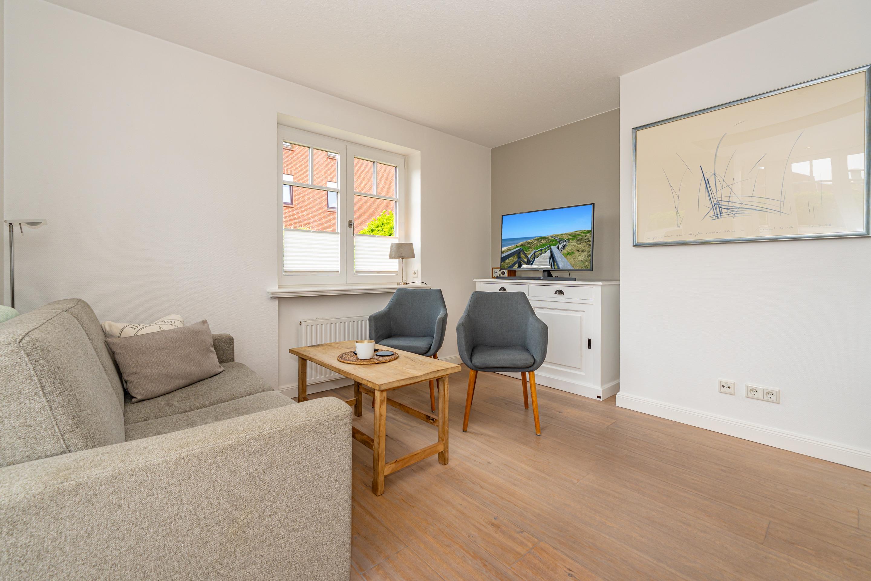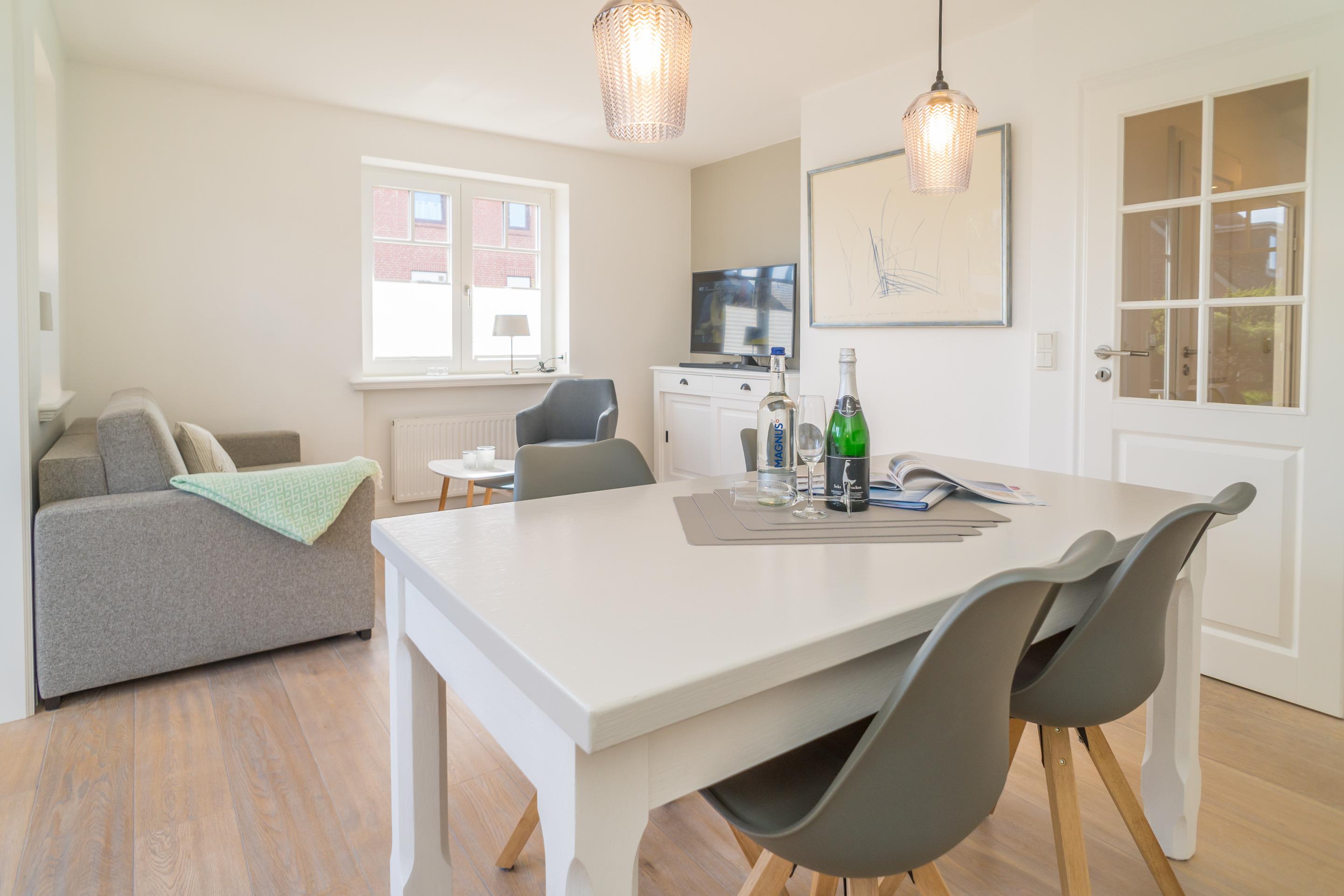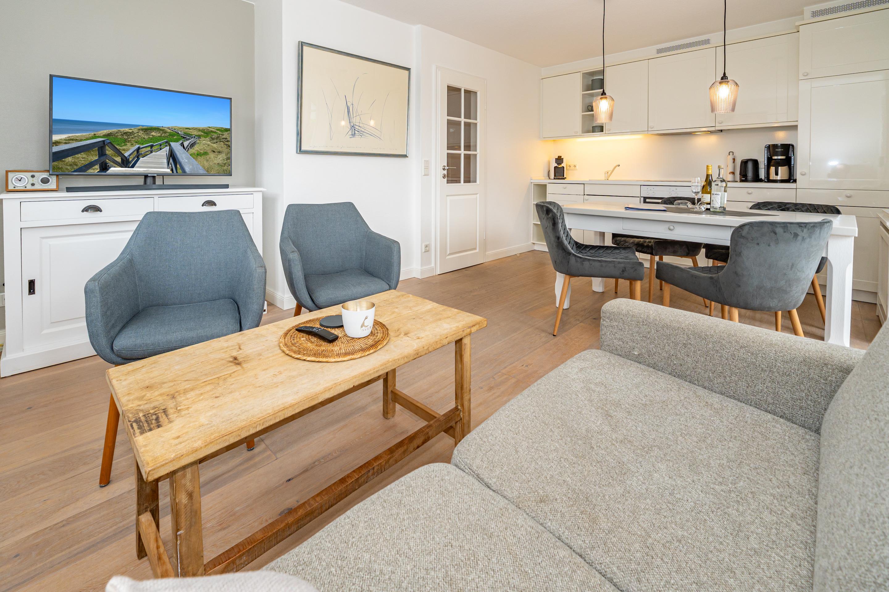 Im Eingangsbereich befindet sich die Diele mit Garderobe. Daran schließt das Wohnzimmer mit direktem Zugang zur geschützten Südterrasse an. Der Wohnraum ist mit einer Sitzgarnitur (2-Sitzer-Couch mit hochwertiger ausziehbarer Schlafmöglichkeit und 2 Sesseln), einem separaten Essplatz, Flachbild-TV, WLAN und einer offene Küche ausgestattet. Die voll ausgestattete weiße Hochglanzküche lässt mit Geschirrspüler, Ceranfeld (4 Felder) und Backofen kaum Wünsche offen. Kaffeemaschine, Wasserkocher und Toaster gehören zur Grundausstattung.[nbsp][nbsp]