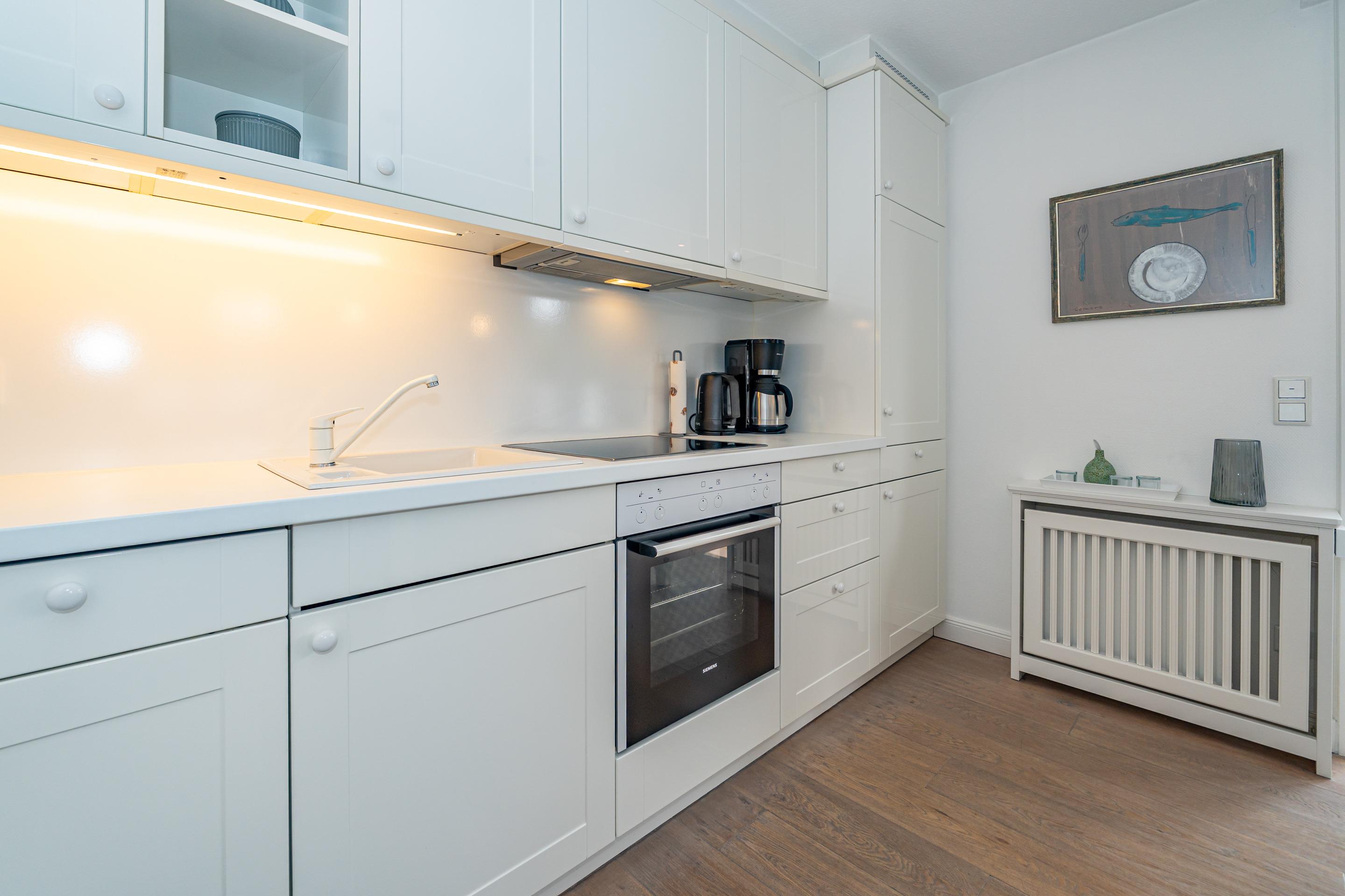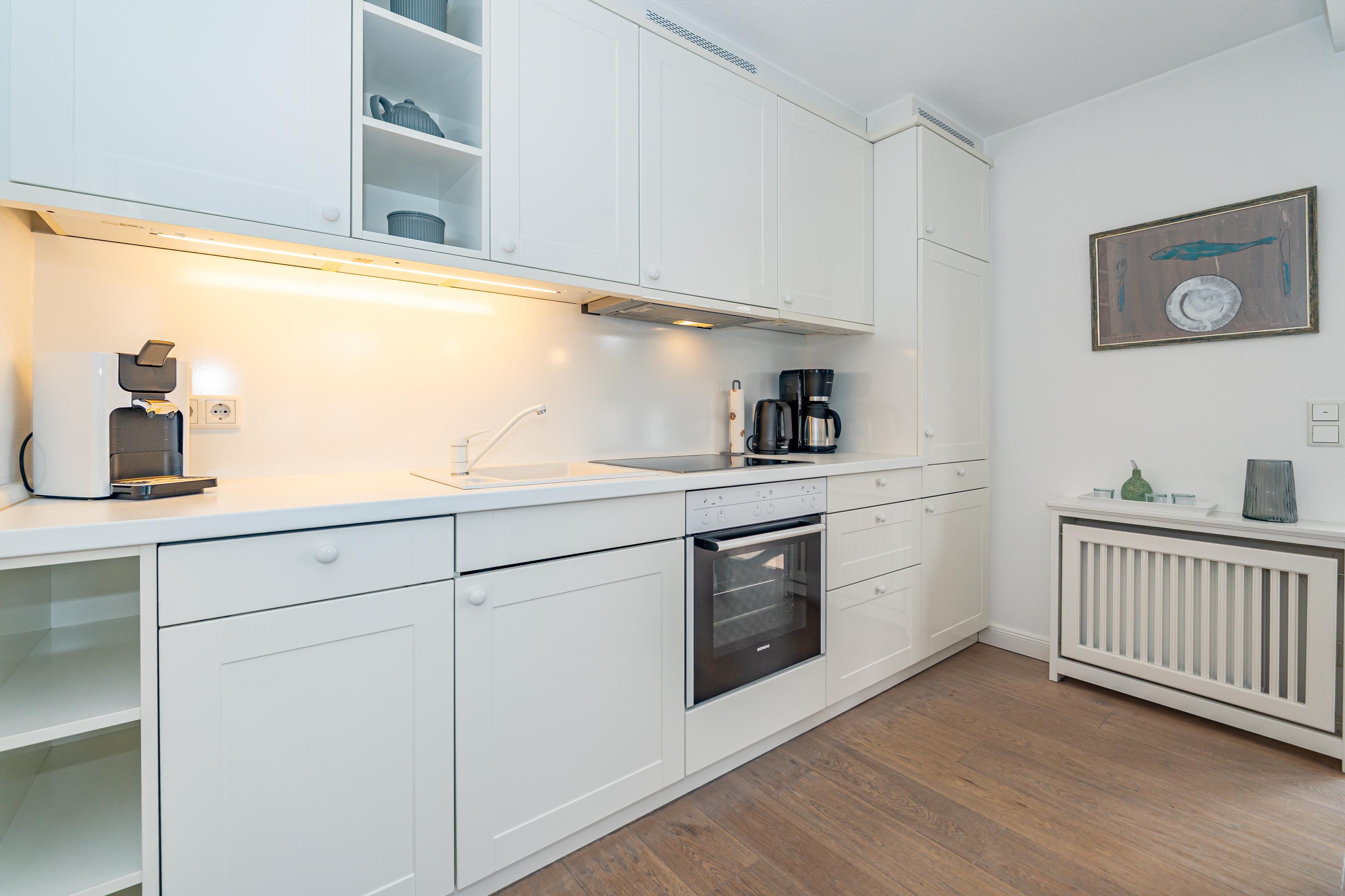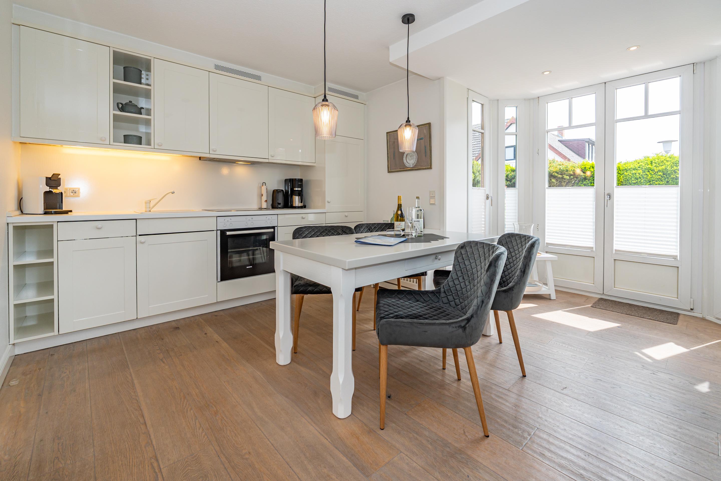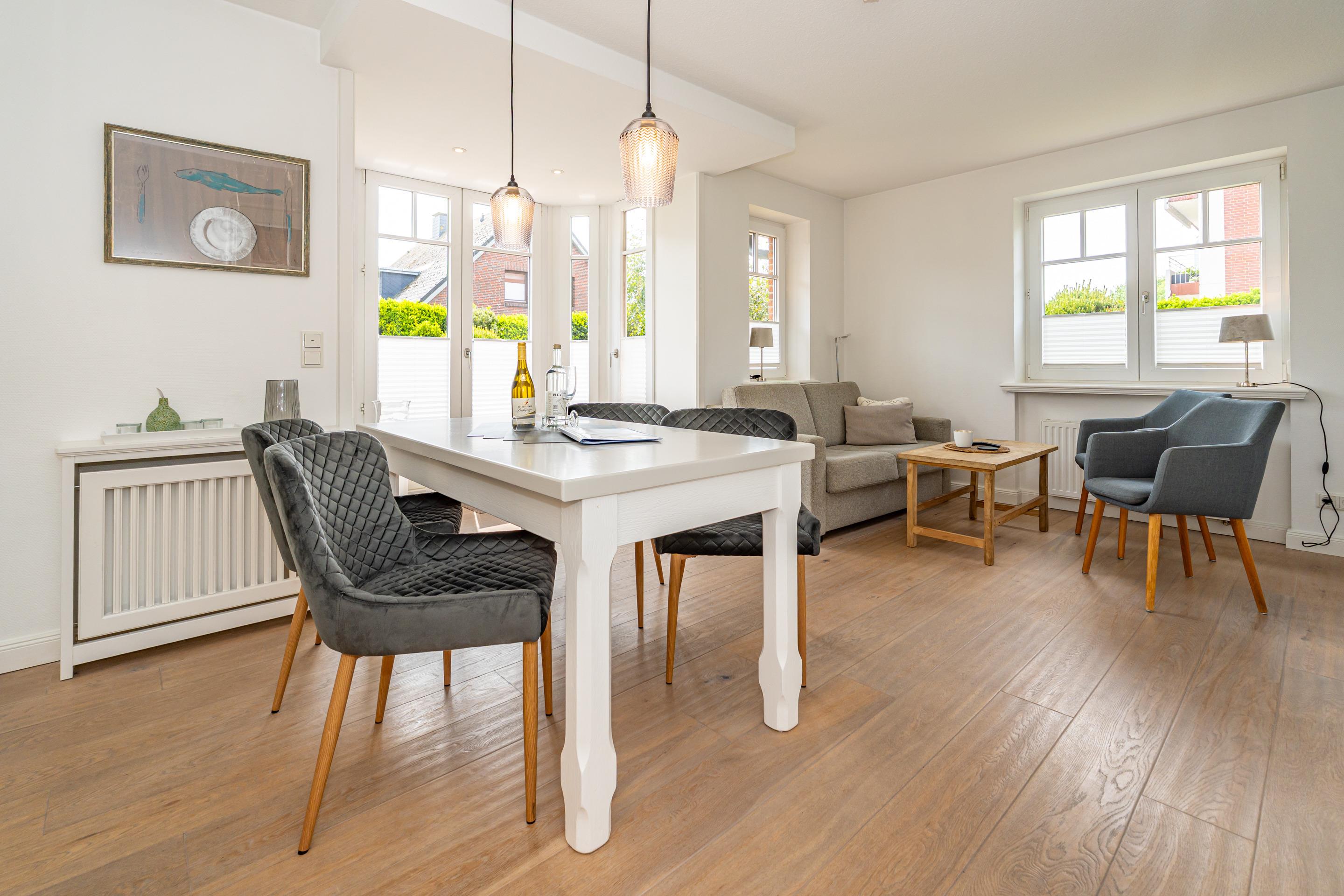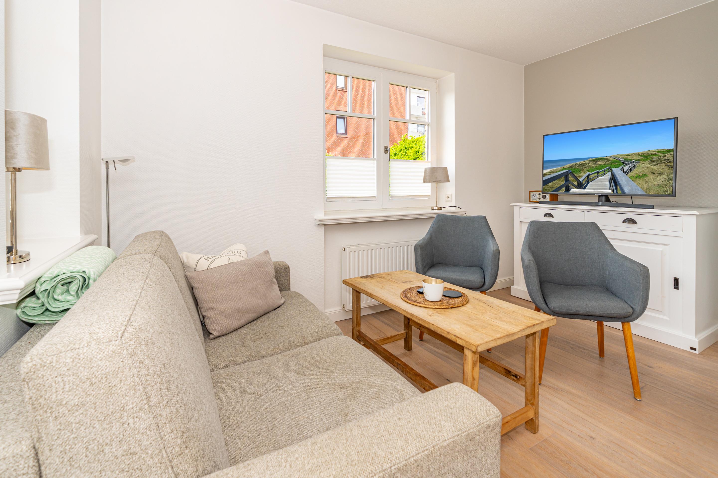 Im Eingangsbereich befindet sich die Diele mit Garderobe. Daran schließt das Wohnzimmer mit direktem Zugang zur geschützten Südterrasse an. Der Wohnraum ist mit einer Sitzgarnitur (2-Sitzer-Couch mit hochwertiger ausziehbarer Schlafmöglichkeit und 2 Sesseln), einem separaten Essplatz, Flachbild-TV, WLAN und einer offene Küche ausgestattet. Die voll ausgestattete weiße Hochglanzküche lässt mit Geschirrspüler, Ceranfeld (4 Felder) und Backofen kaum Wünsche offen. Kaffeemaschine, Wasserkocher und Toaster gehören zur Grundausstattung.[nbsp][nbsp]