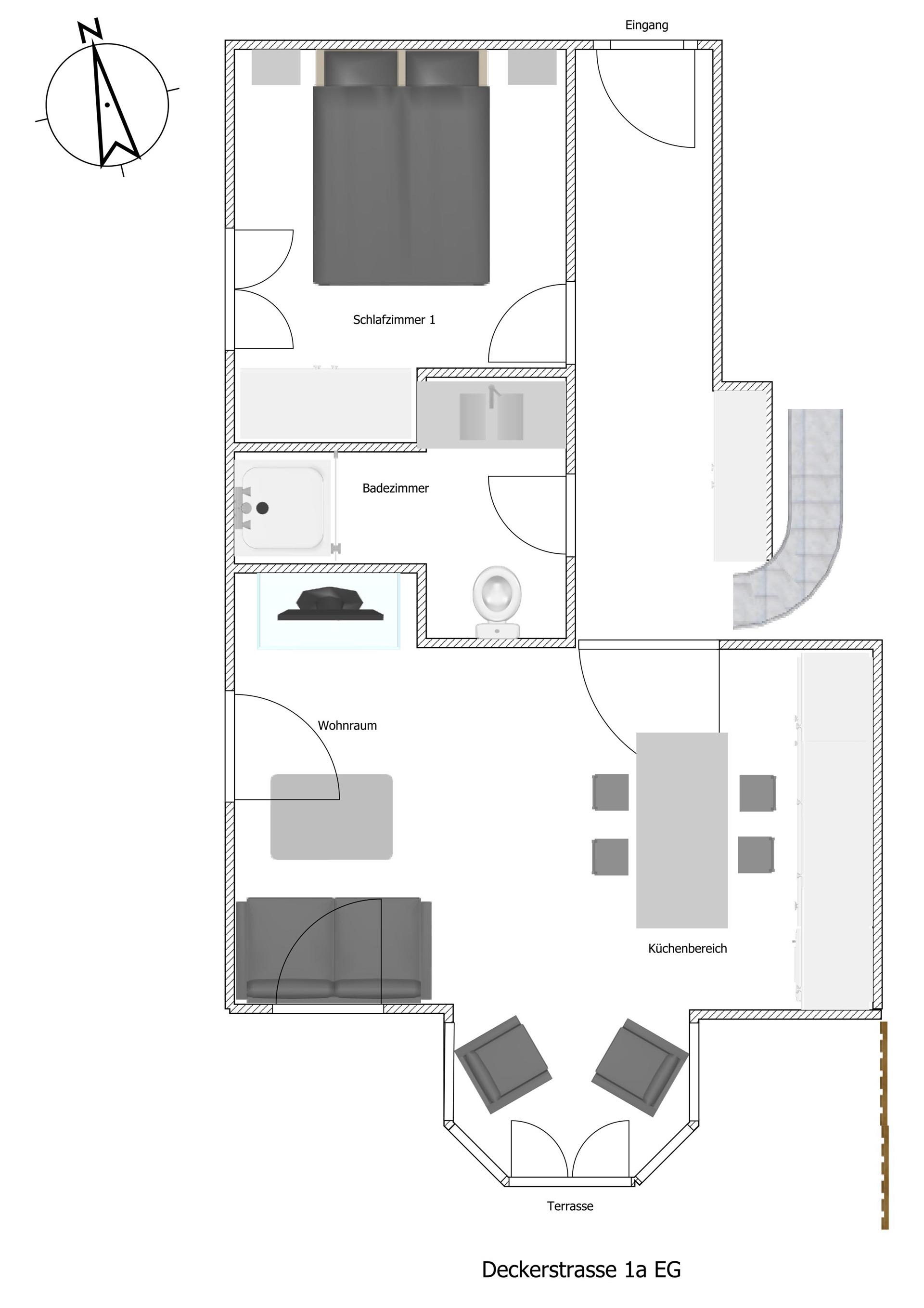 Hochwertig ausgestattete 2,5-Zimmer-Ferienwohnung mit ca. 55 qm zur Südseite mit möblierter Terrasse (mit Balkonmöbeln, Auflagen und Sonnenschirm) für bis zu 4 Personen.