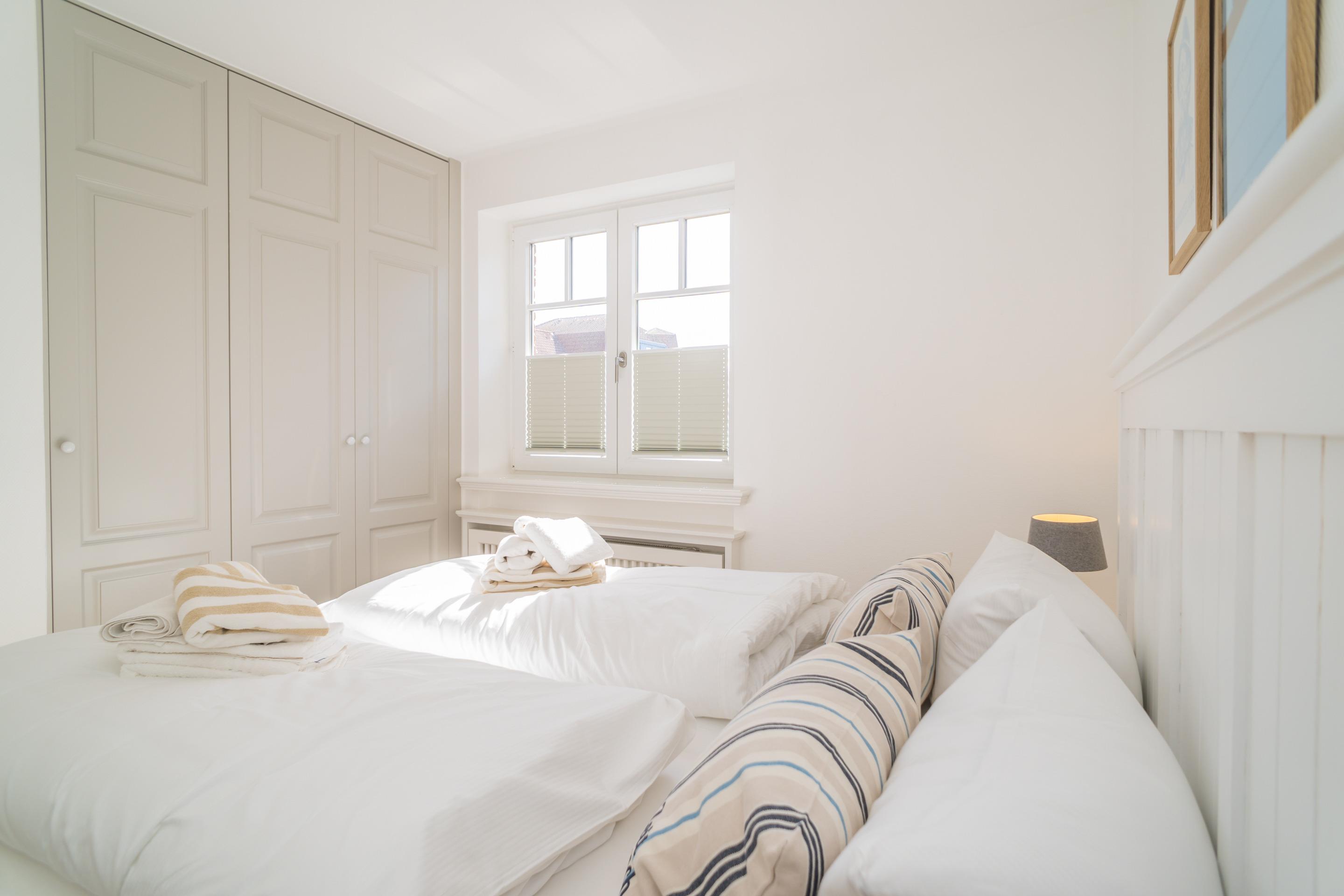 Das separate Schlafzimmer hat ein Doppelbett (mit guten Einzelmatratzen, je 80 x 200cm) und viel Schrankraum.