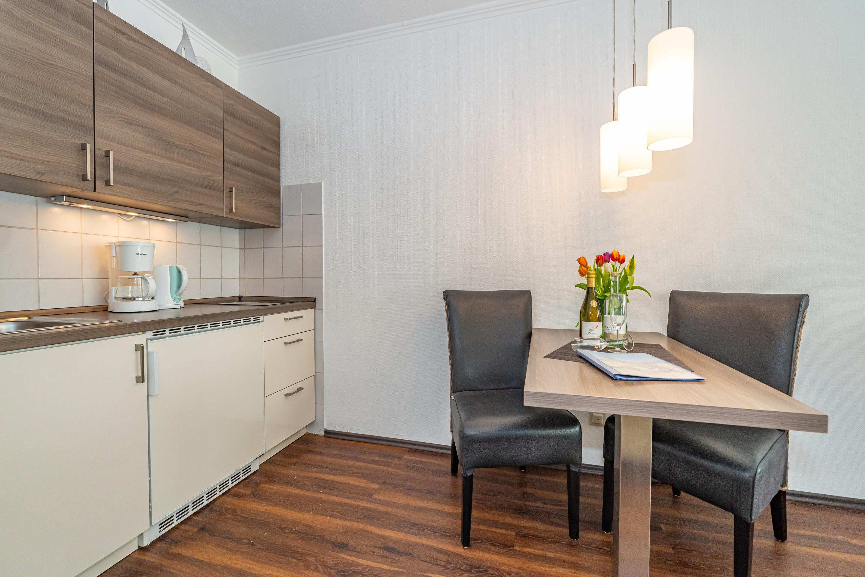 Gepflegte 1-Zimmer-Nichtraucher-Ferienwohnung (ca. 40 qm) mit optimalem Grundriss in der 1.Etage für 2 Personen mit großzügigem, sonnigen Westbalkon (mit Balkonmöbeln und Auflagen) und eigenem PKW-Stellplatz in der Tiefgarage. Vom Vorflur mit Garderobe gelangt man in den kombinierten Wohn-/Schlafraum mit Austritt zum Balkon und in das moderne, neuwertige Duschbad/WC. Der Wohn-/Schlafraum besteht aus einer gemütlichen Ledersitzgarnitur (ein Zweisitzer und ein Sessel), einer separaten Essecke und gutem Doppelbett (Boxspringbett (1,80 x 2 m) mit Einzelmatratzen + Topper, Komfortliegehöhe), Kabel-Flachbild-TV, Radio, Wlan und offener Küchenzeile. Kaffeemaschine, Wasserkocher und Toaster gehören zur Grundausstattung.