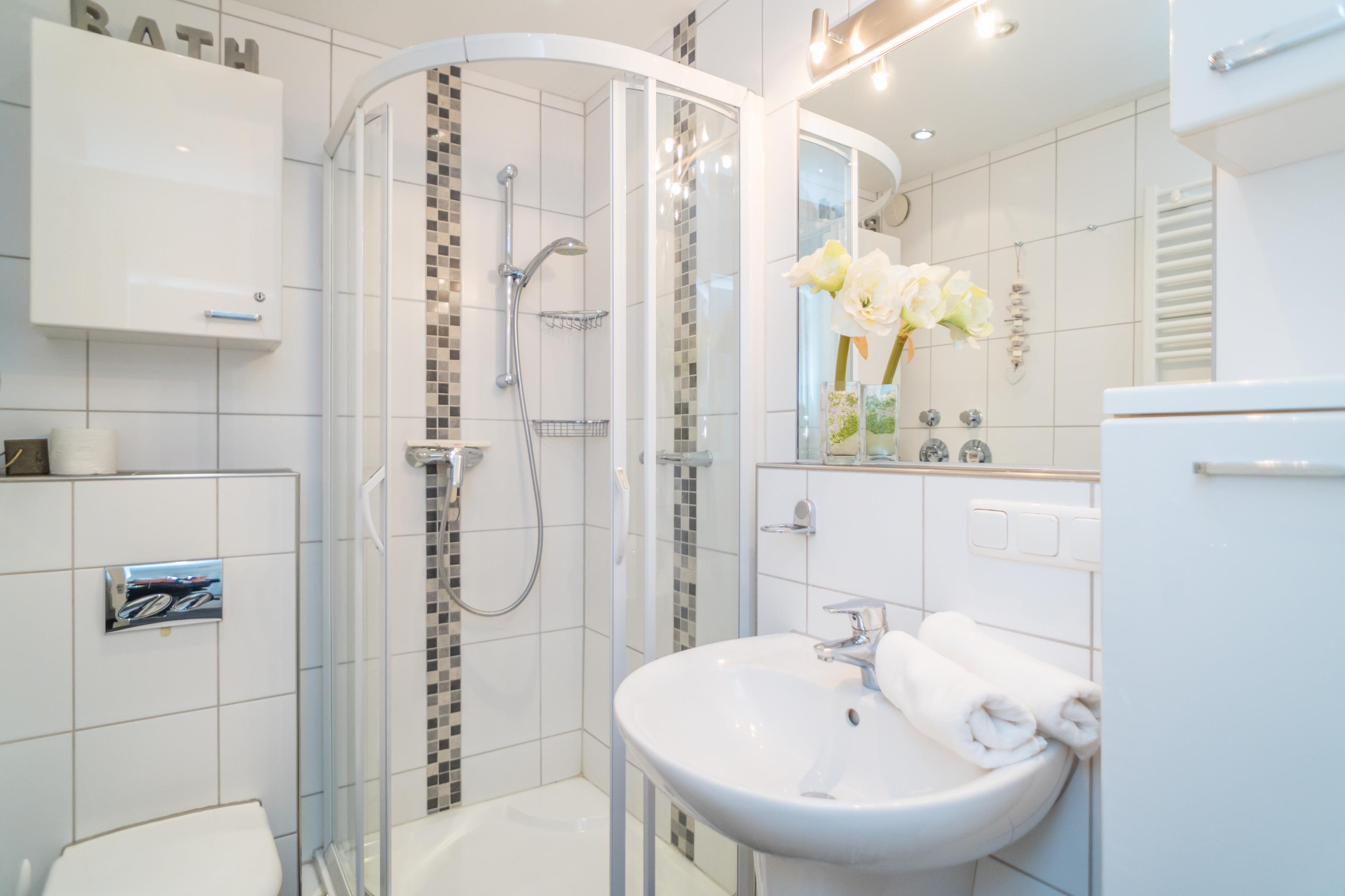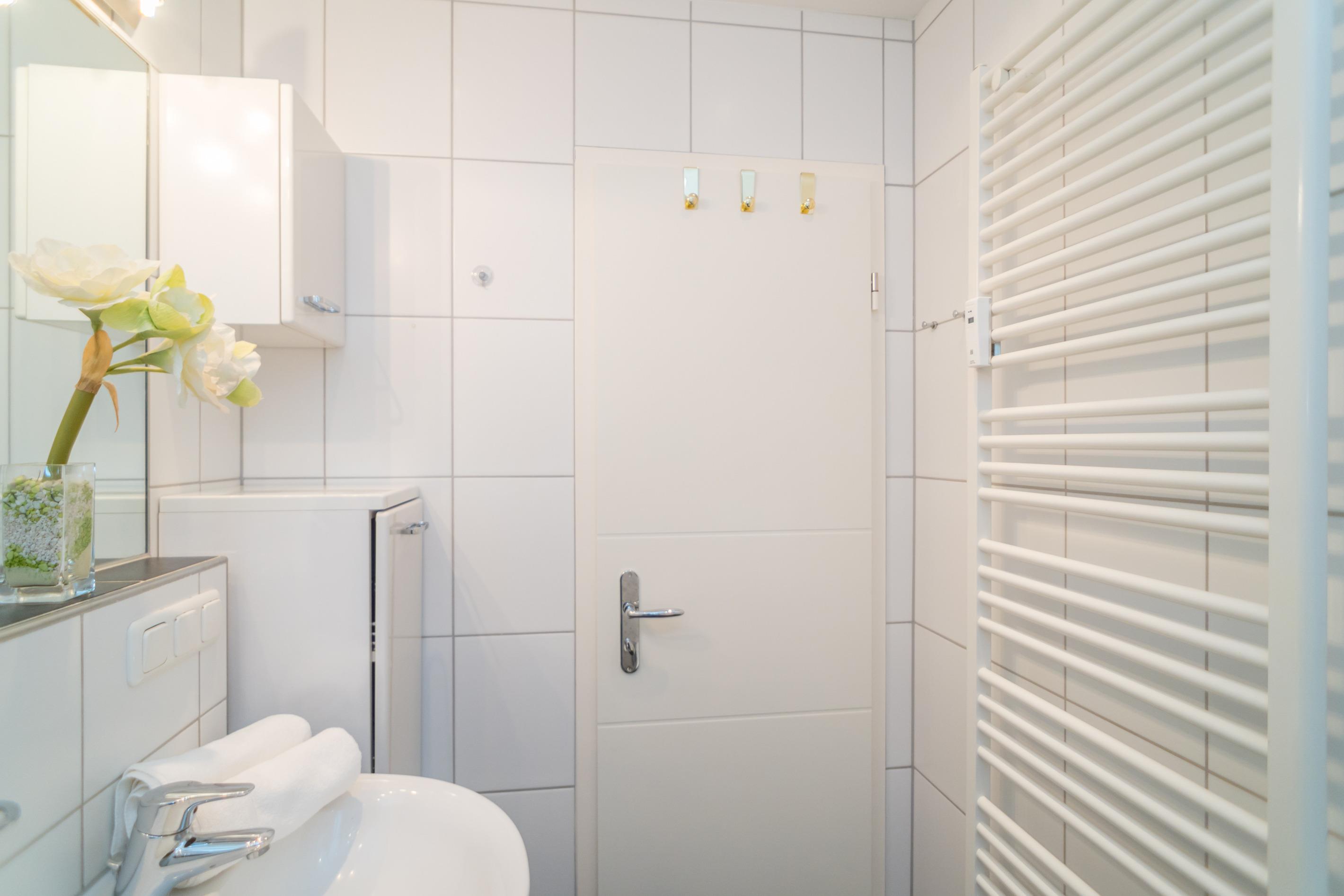 Das neue Duschbad/WC hat einen Waschtisch/ Handtuchtrockner und Fön.