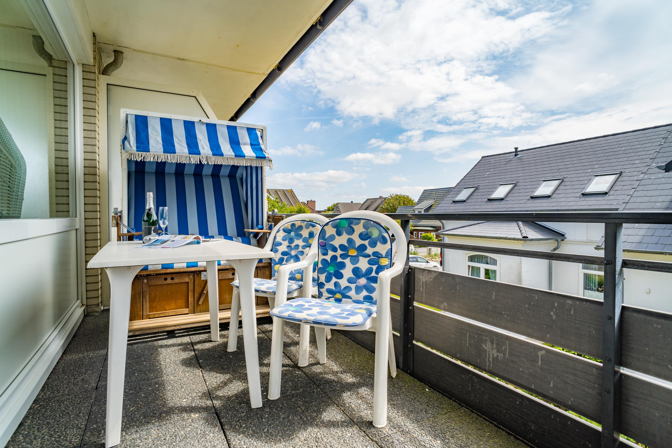 Komfortable 2-Zimmer-Nichtraucher-Ferienwohnung, ca. 45 qm, in der 1. Etage für 4 Personen mit Südbalkon (mit Strandkorb, Balkonmöbeln und Auflagen).