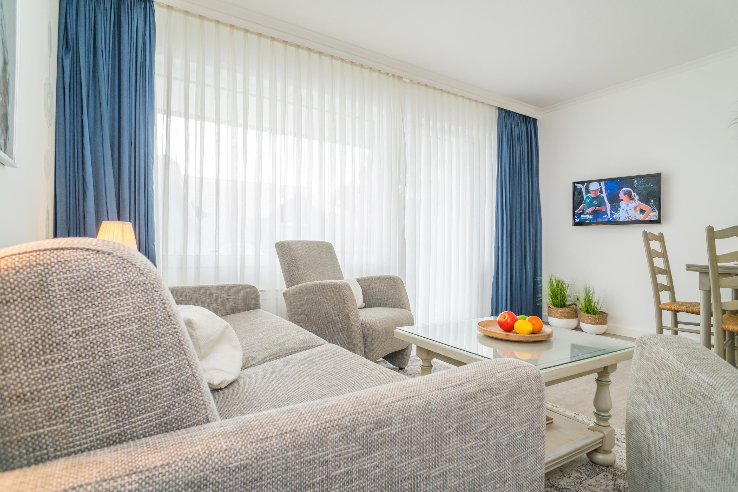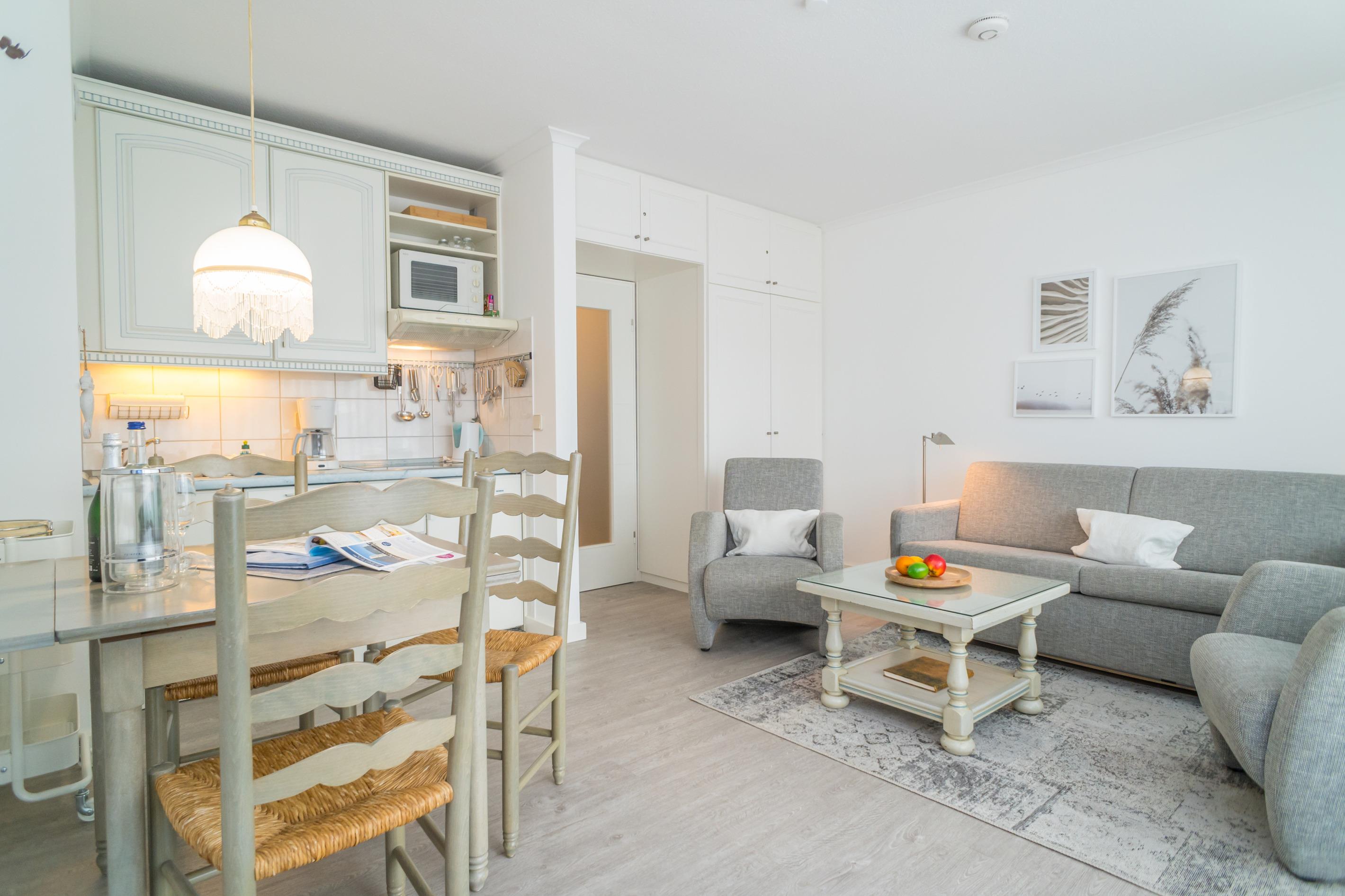 Das Wohnzimmer hat eine Doppelschlafcouch, 2 Sessel, einen Essplatz, einen Kabel-Flachbild-TV, Telefon inklusive Flatrate für Gespräche ins deutsche Festnetz (Handynummern gesperrt), kostenloser Internetnutzung per W-Lan und eine offene Küchenzeile.