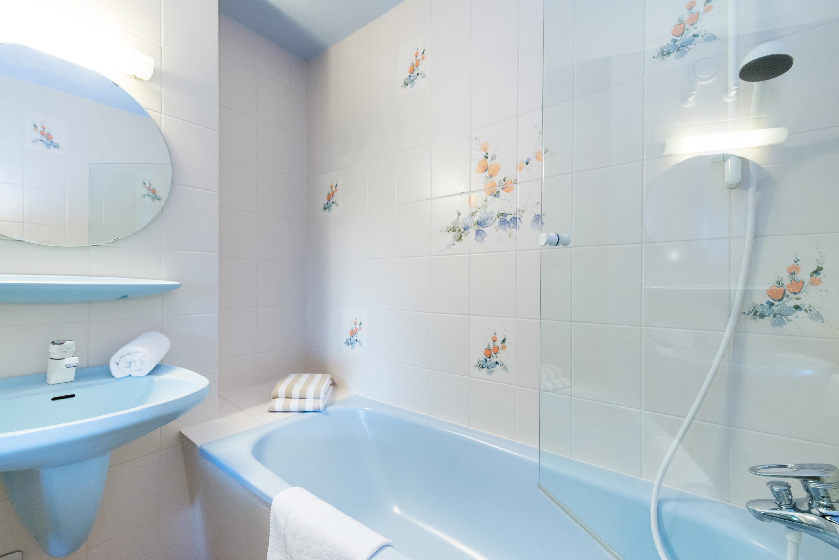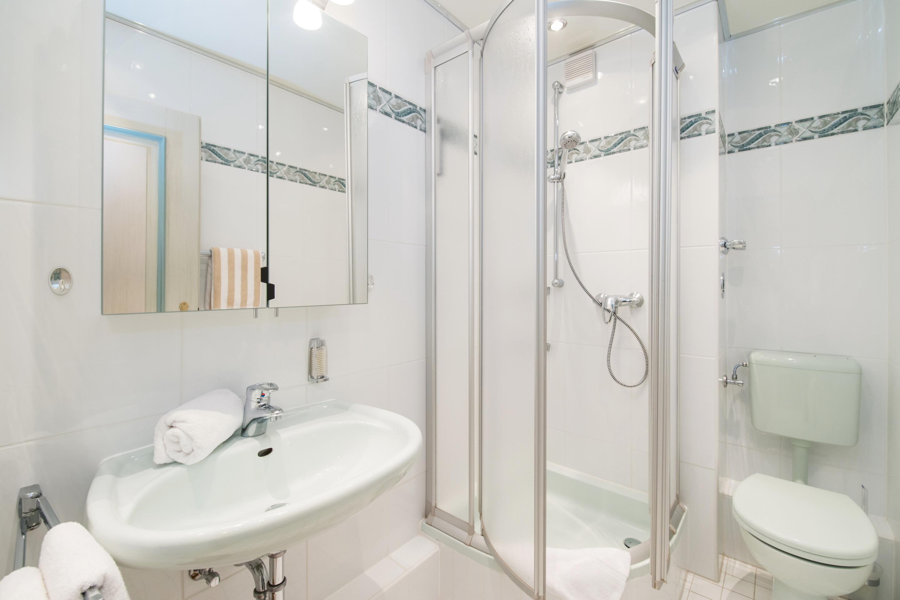 Im Bad befinden sich eine Dusche, ein WC und ein Waschtisch.