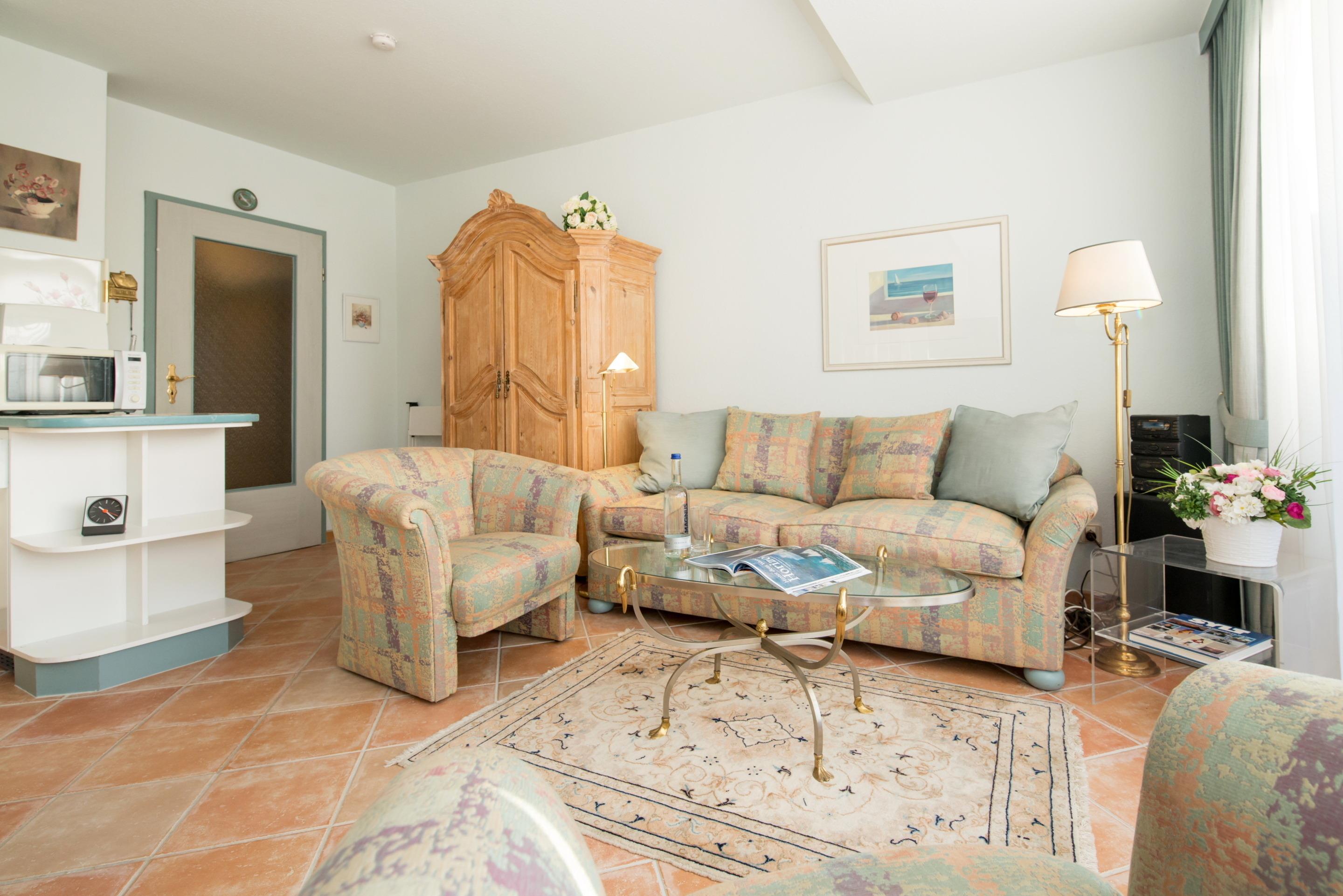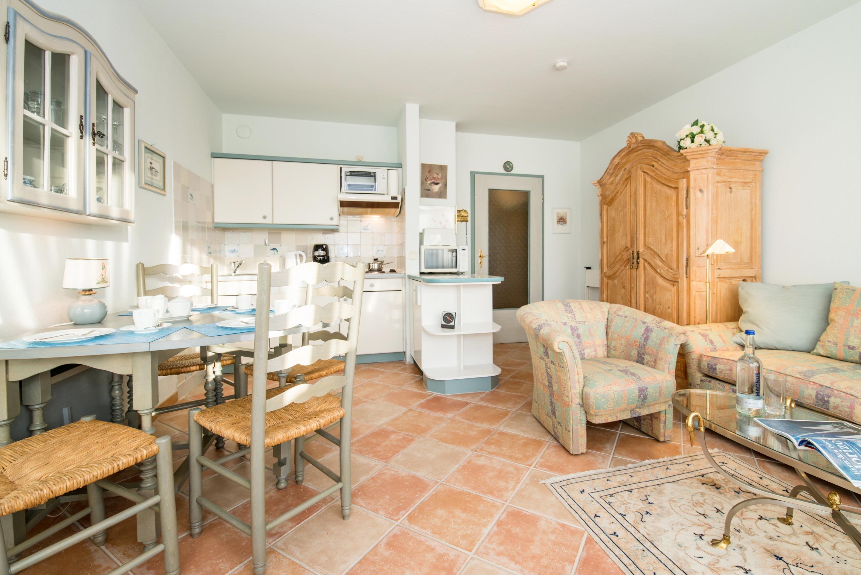 Das Wohnzimmer hat eine Couch, einen Essplatz, einen Kabel-Flachbild-TV, Telefon inklusive Flatrate für Gespräche ins deutsche Festnetz (Handynummern gesperrt), kostenloser Internetnutzung per W-Lan und eine offene Küchenzeile.