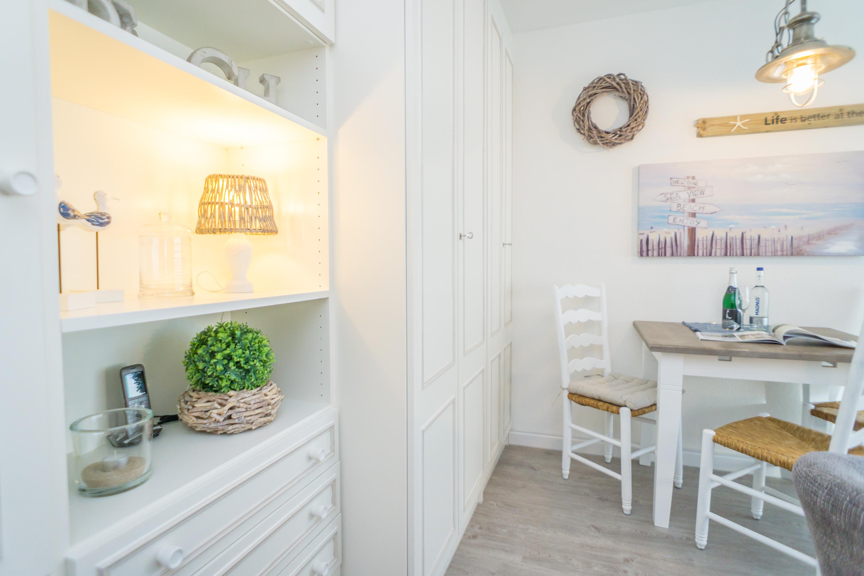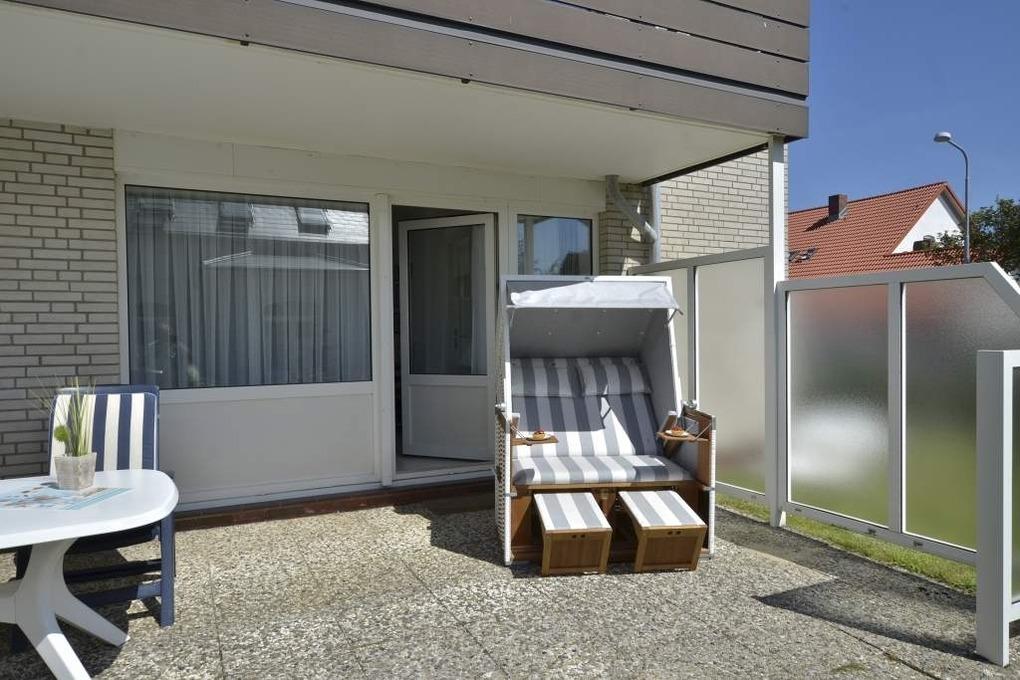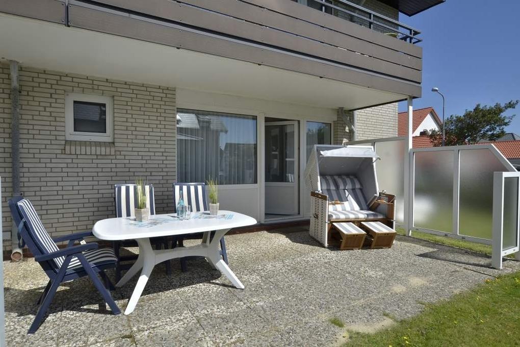Hochwertig ausgestattete 2-Zimmer-Nichtraucher-Ferienwohnung, ca. 41 qm, für max. 3 Personen im Erdgeschoss mit Südterrasse (mit Strandkorb, Balkonmöbeln und Auflagen) und eigenem PKW-Stellplatz in der Tiefgarage.